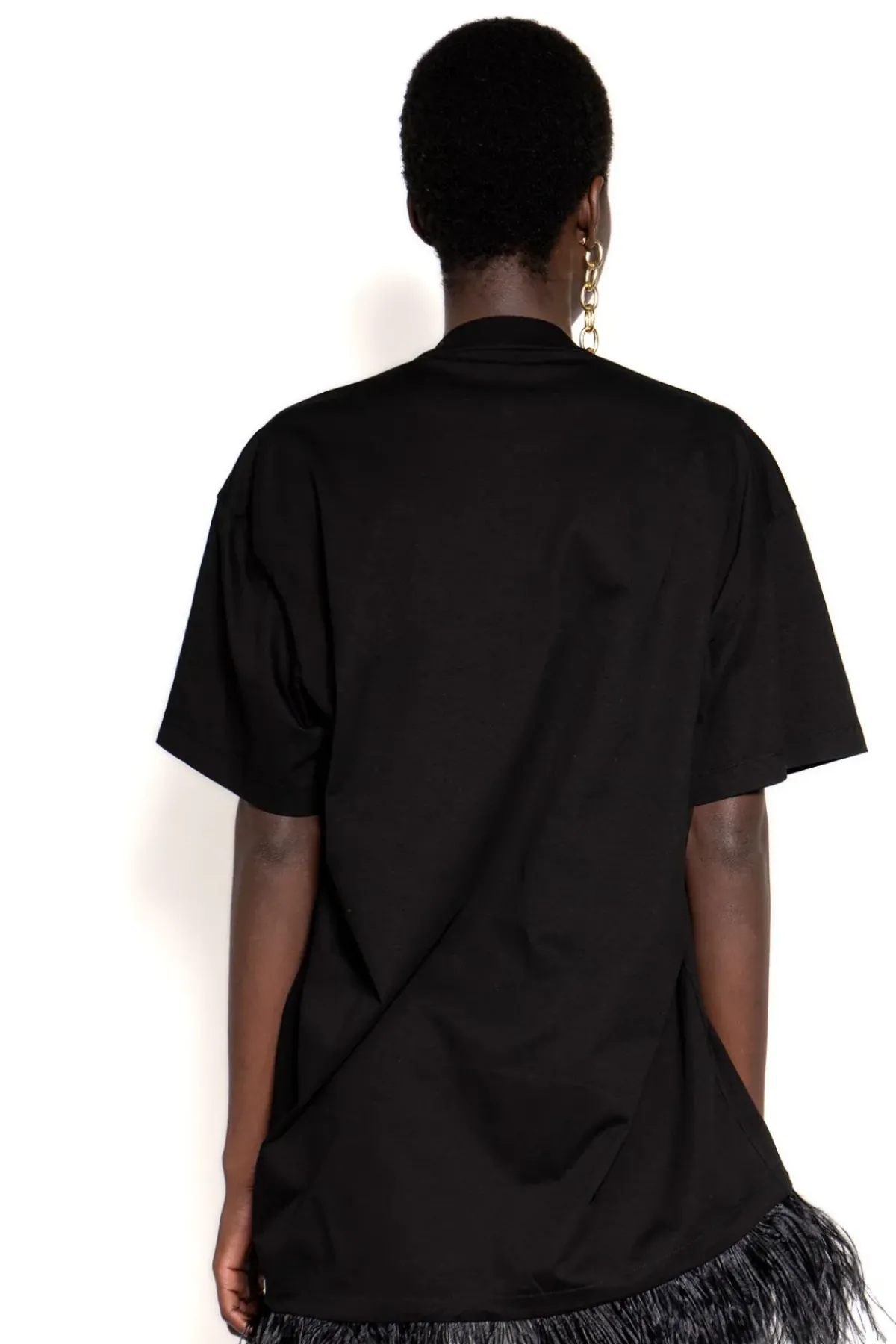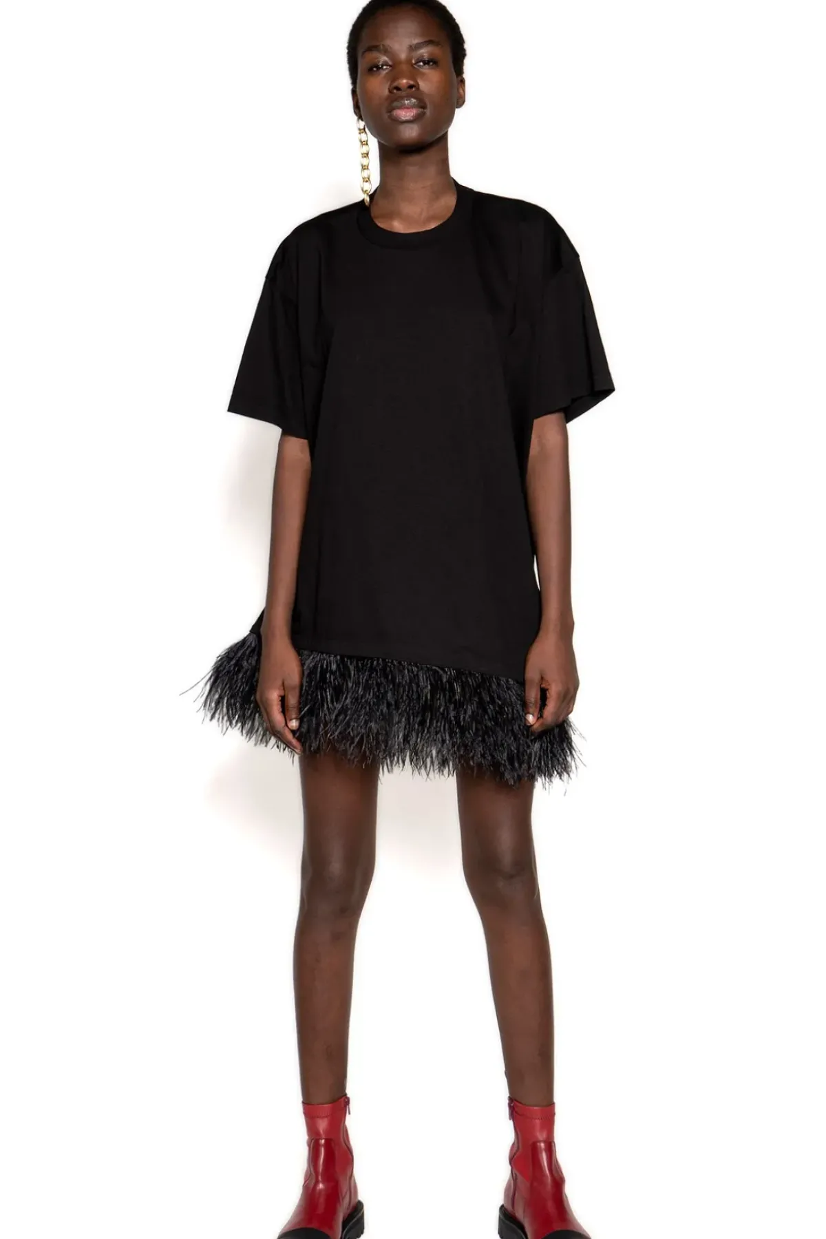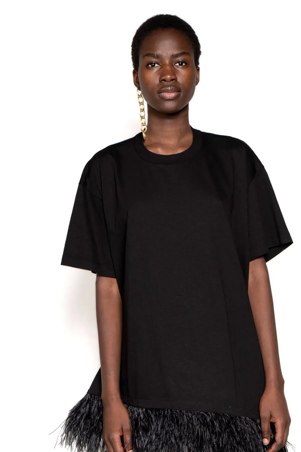 This oversized black t-shirt dress features short sleeves, a round neckline and feather trim. It's the perfect way to make a statement without sacrificing comfort.