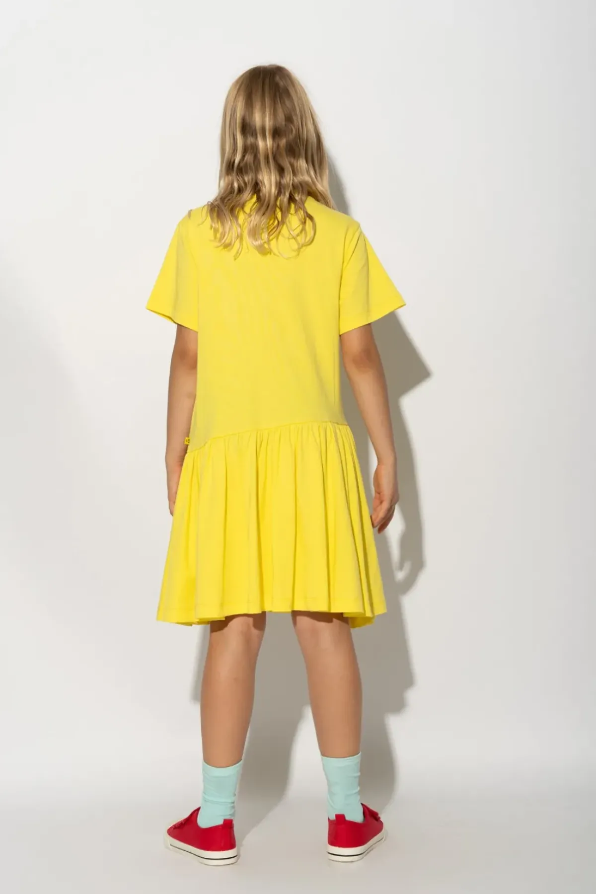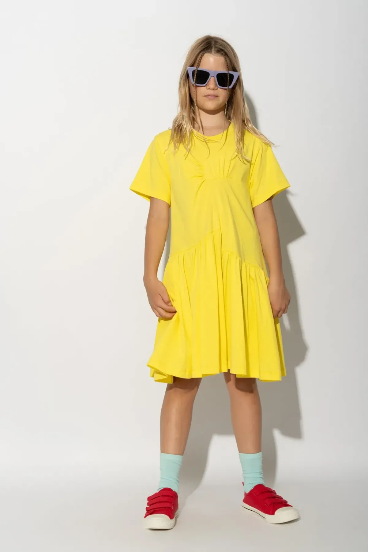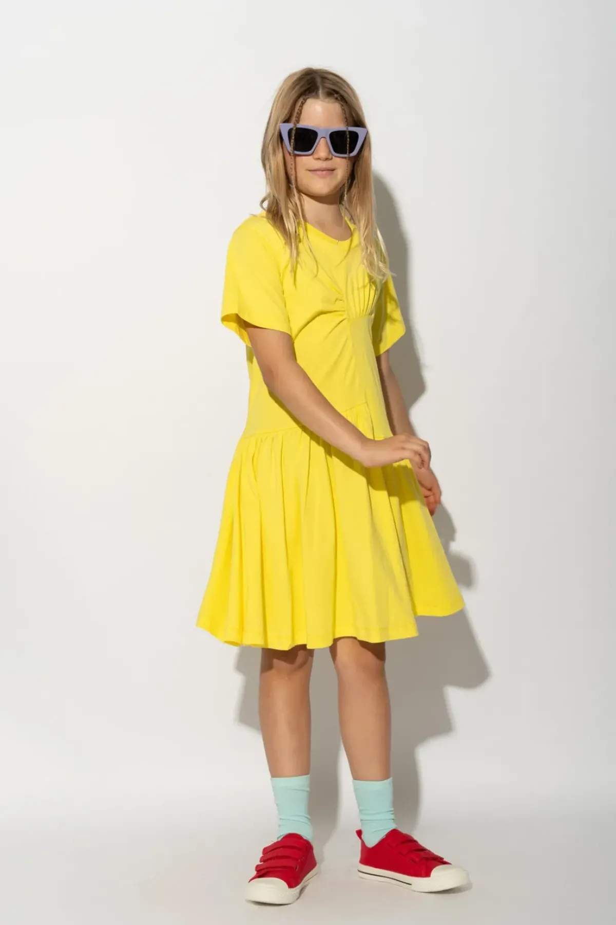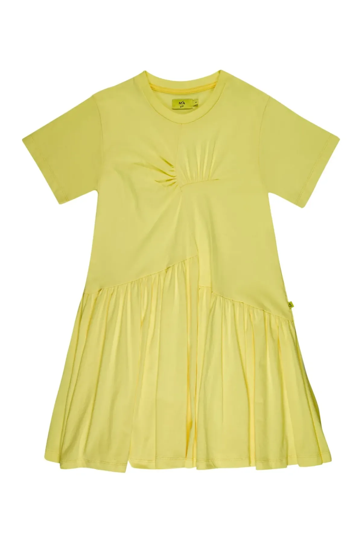 Made of soft, comfortable jersey material in a bright shade of yellow, this dress features short sleeves and a round neck. The unique gathering in the front adds a playful touch to any young fashionista's wardrobe!