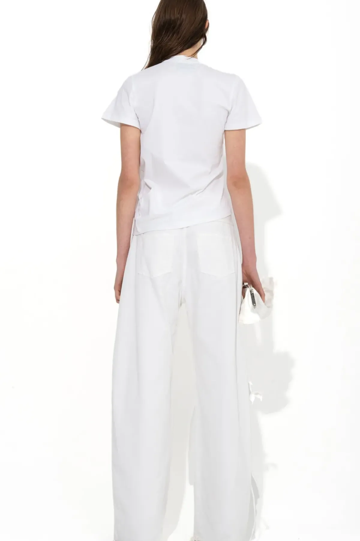 White t-shirt featuring a round neck, short sleeves, a ruffle trim and a stylish, high-low hem! Upgrade your wardrobe today with this go-to!