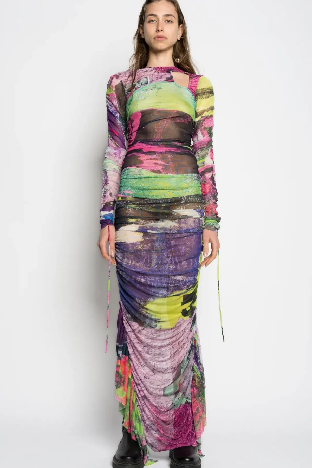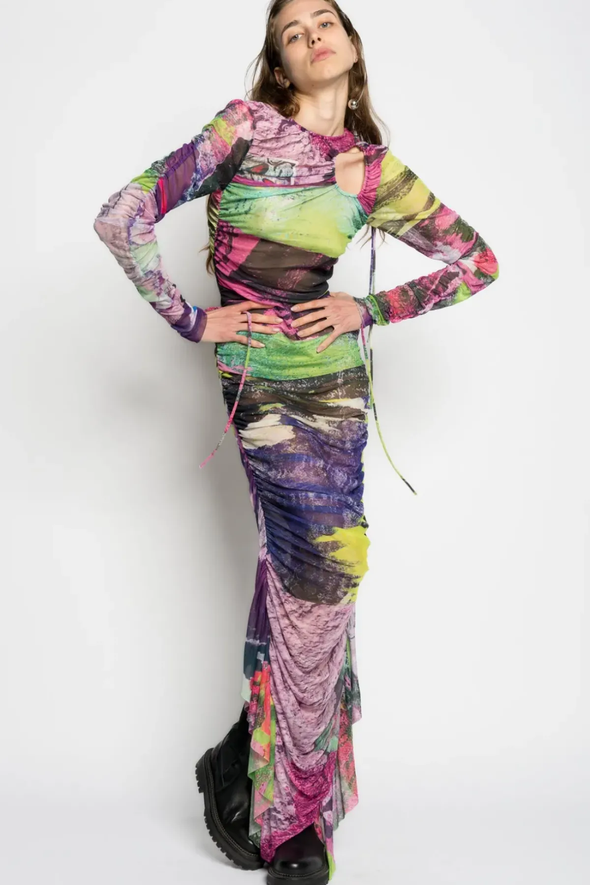 Graffiti print long gathered dress in see-through mesh with open back, front cut outs and long sleeves.