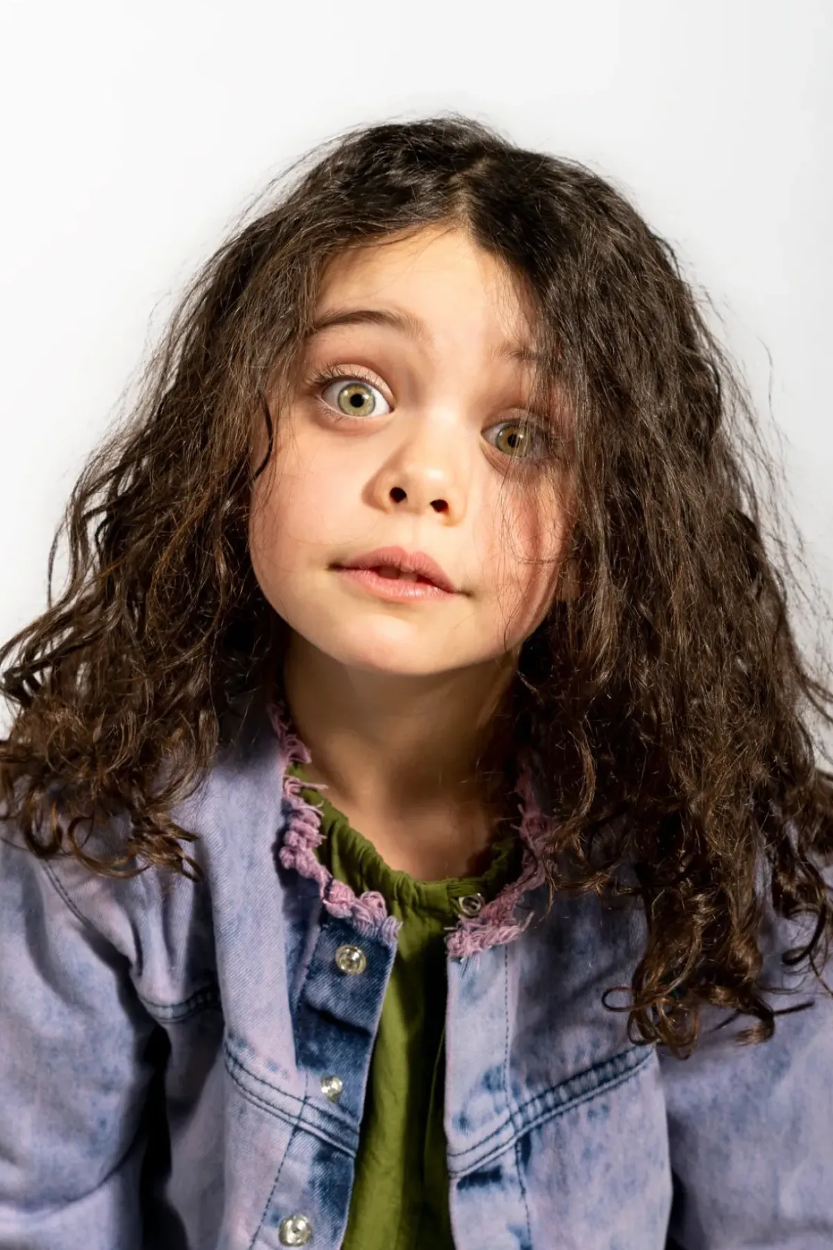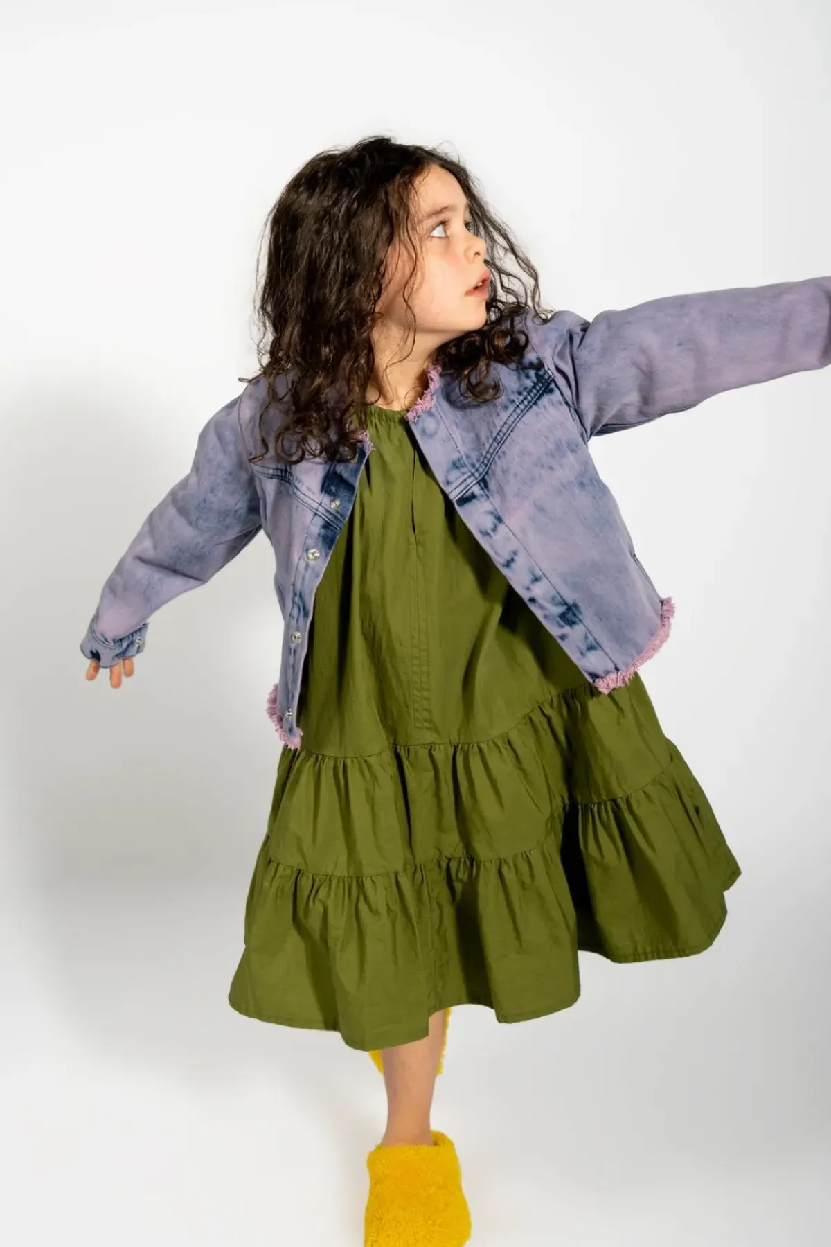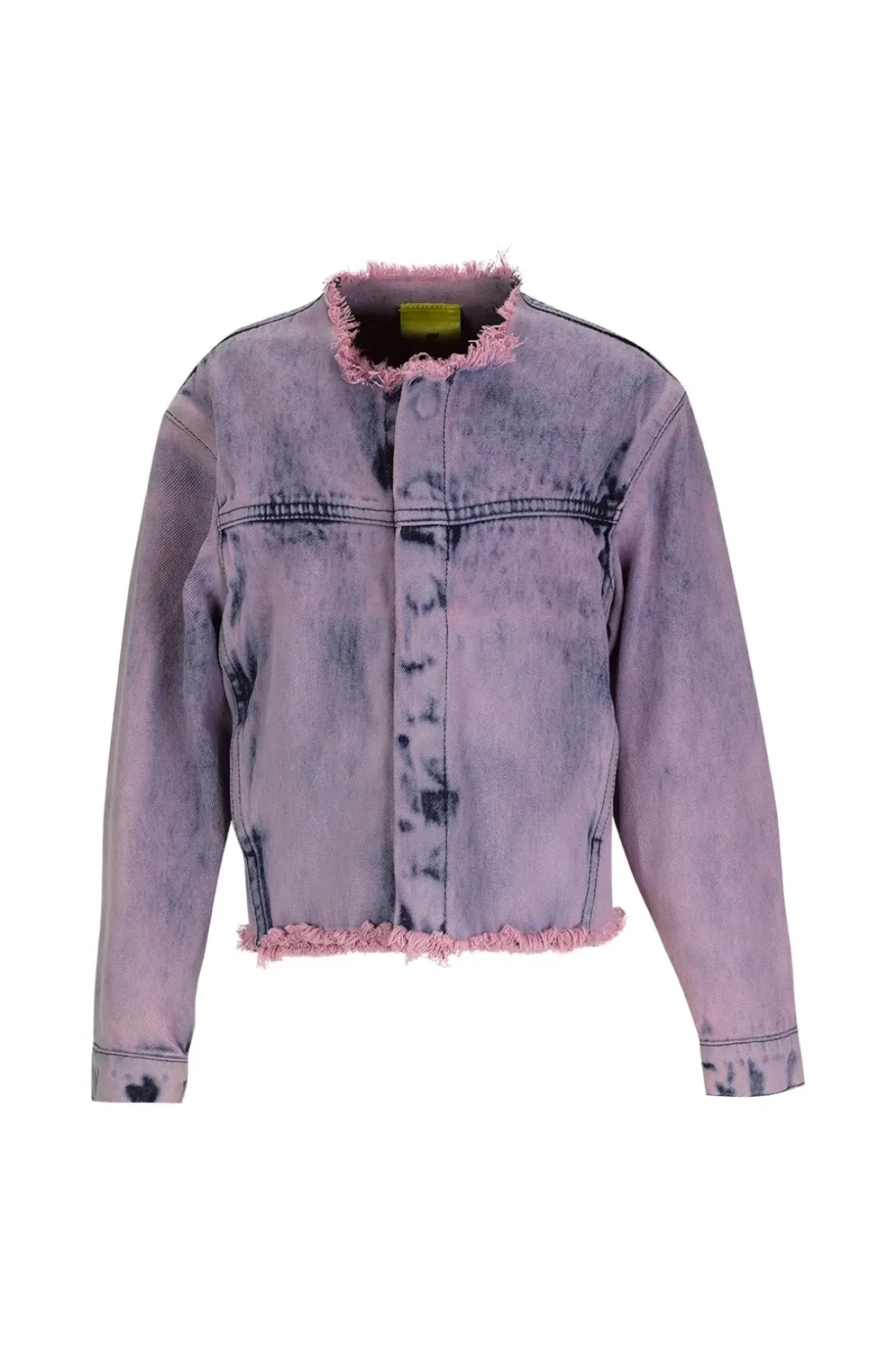 Loose and collarless, this denim jacket in lilac brings the fun raw frayed hem and fitted sleeves with structured cuffs – it's like a kid in a candy store.