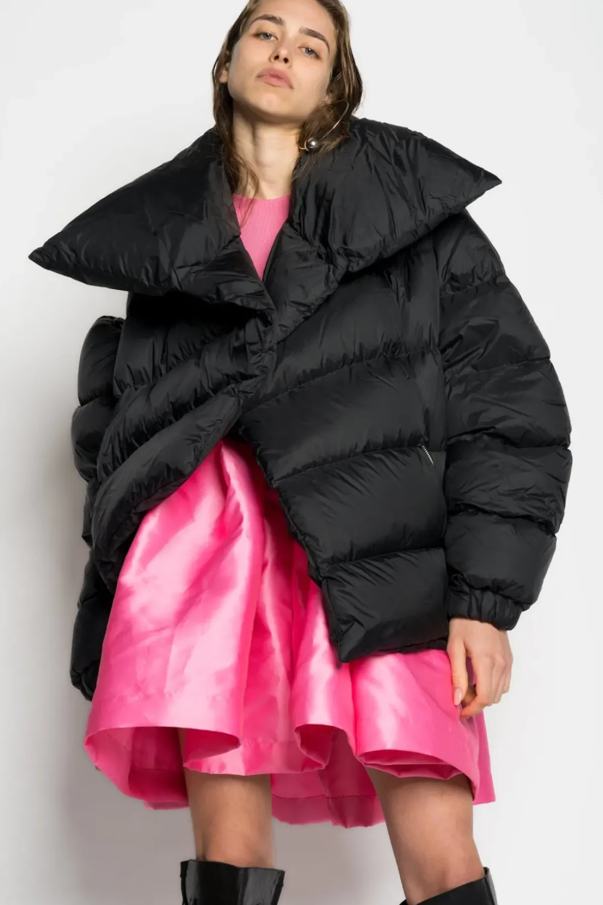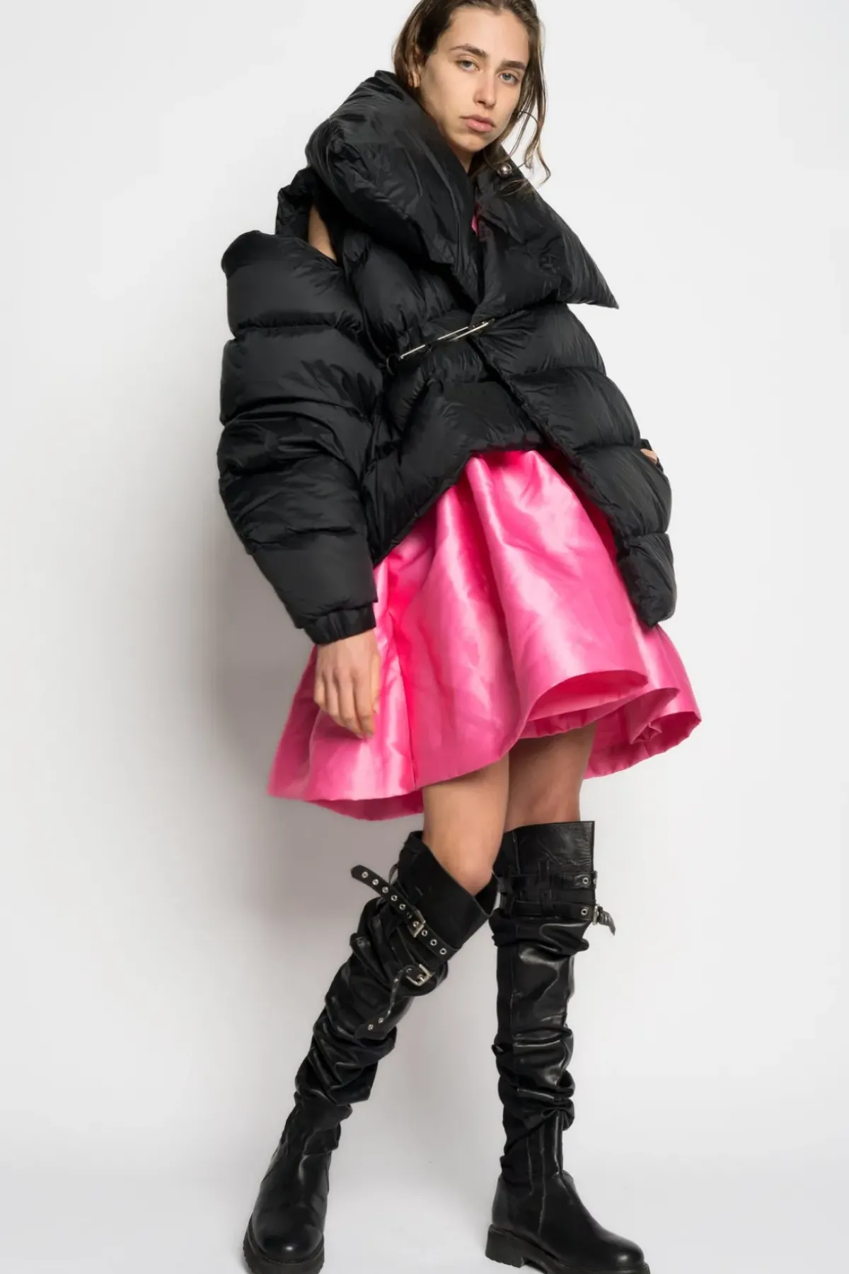 Classic M'A Puffa Jacket in black. Flaunt this pointed open-collar silhouette, secured by a silver safety pin closure. Boasting an asymmetric hem and an opening on the left shoulder, this jacket is a must-have in your wardrobe.