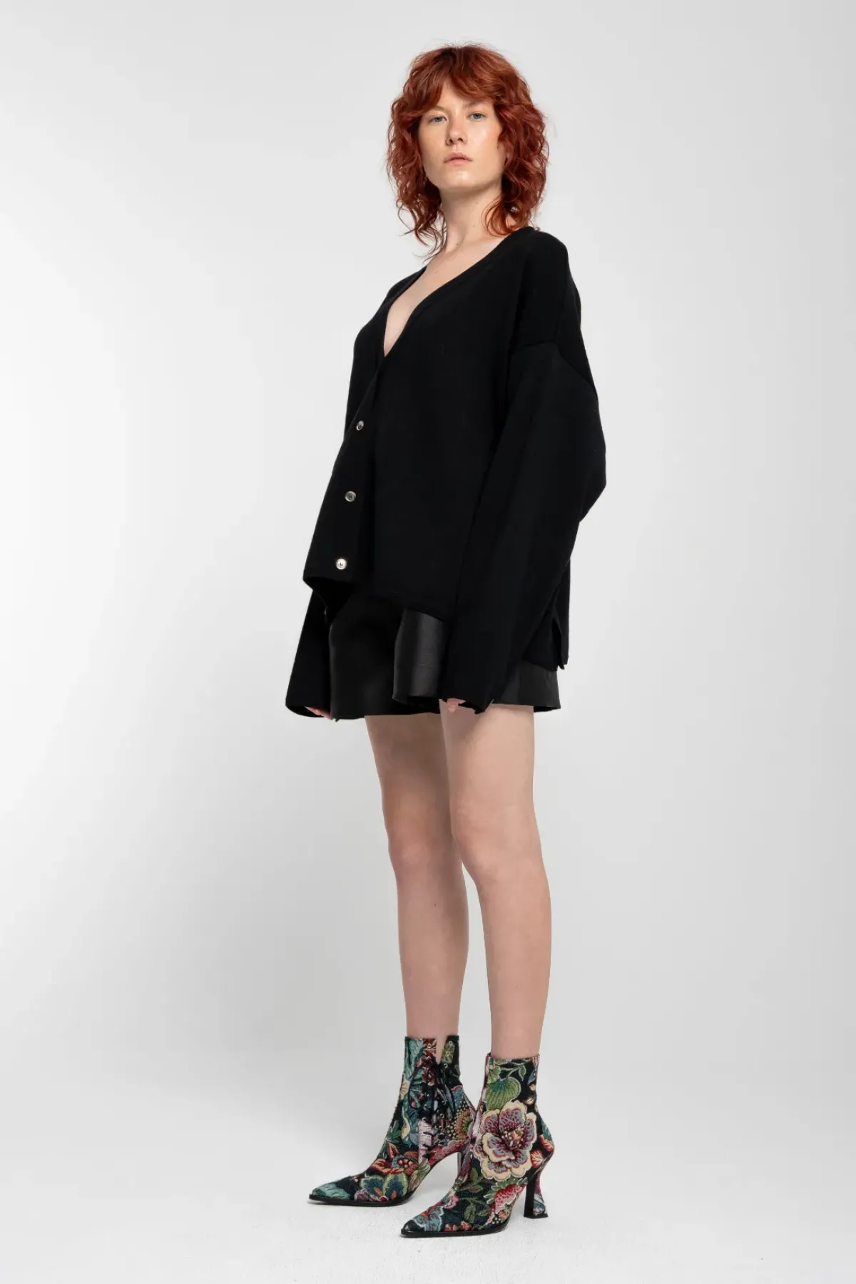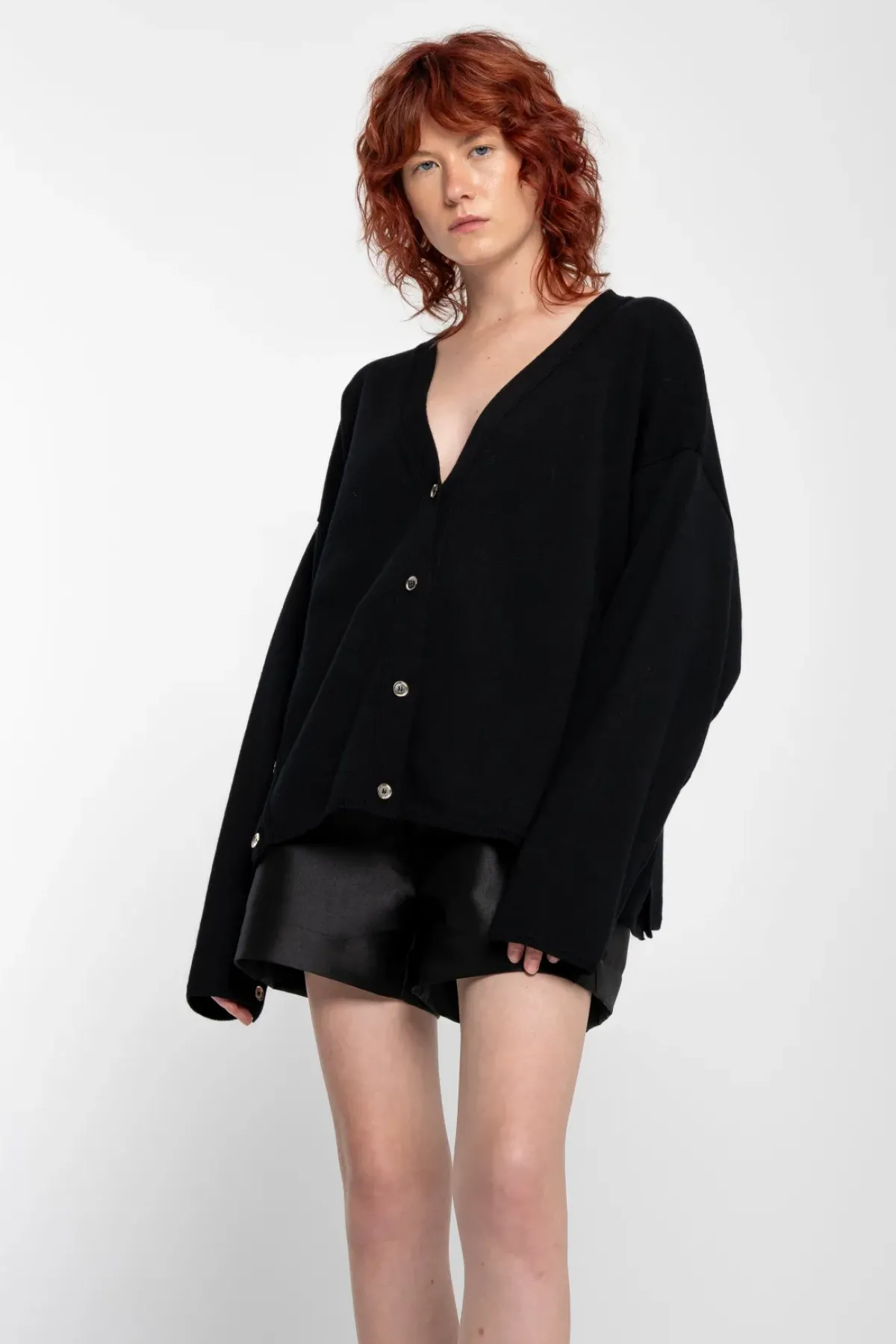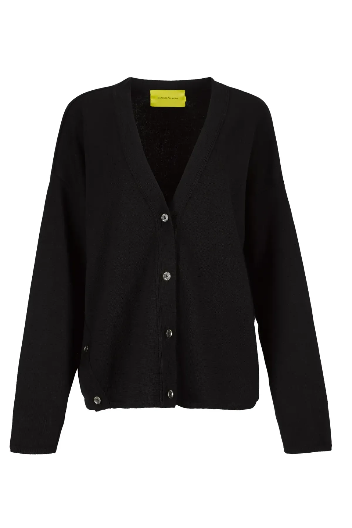 This black cardigan is crafted from a supple merino fabric and features a unique deconstructed design that is fastened with buttons for an asymmetrical silhouette, a v-neck and front buttons.