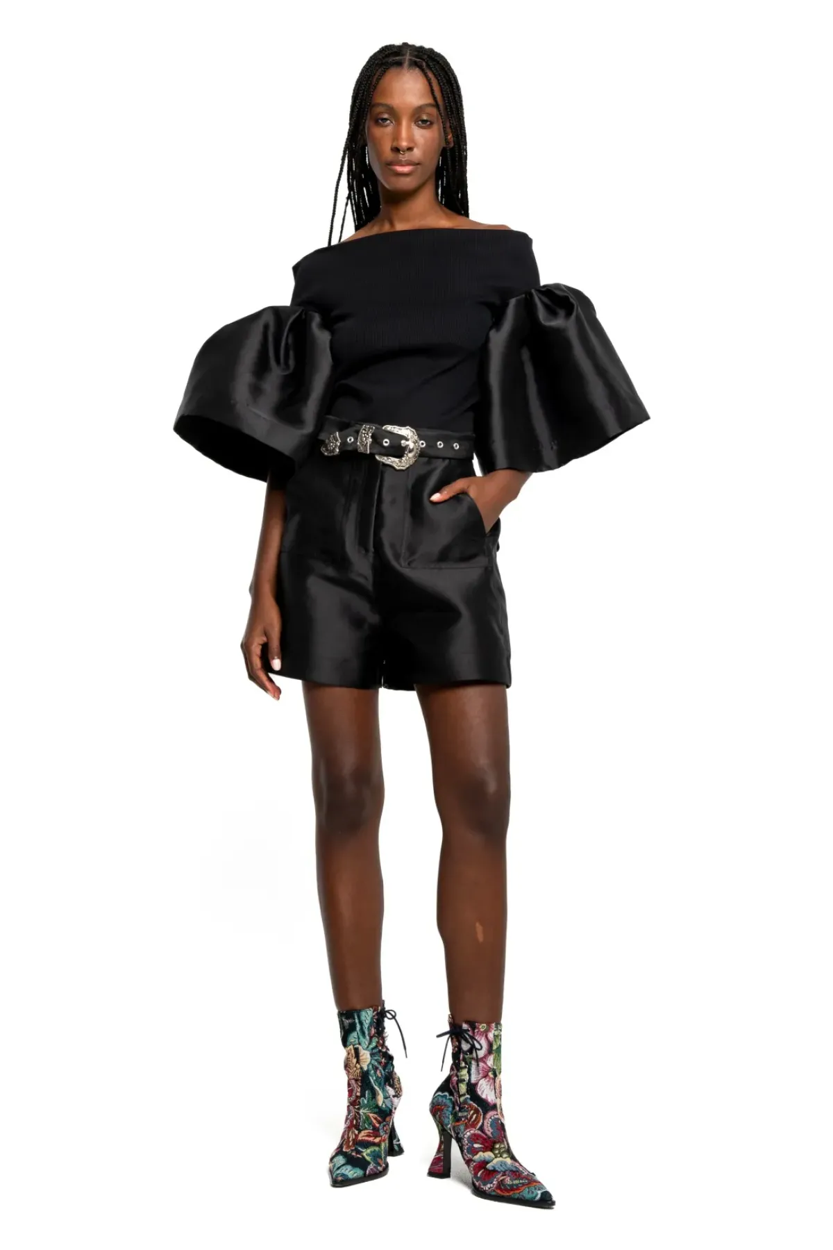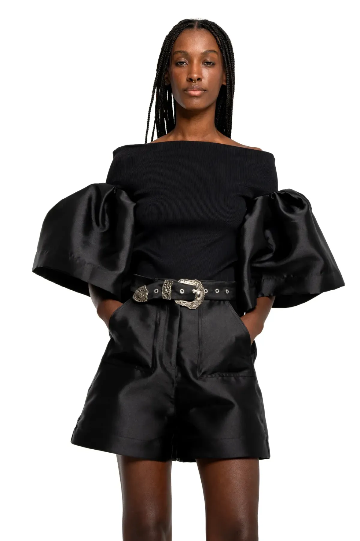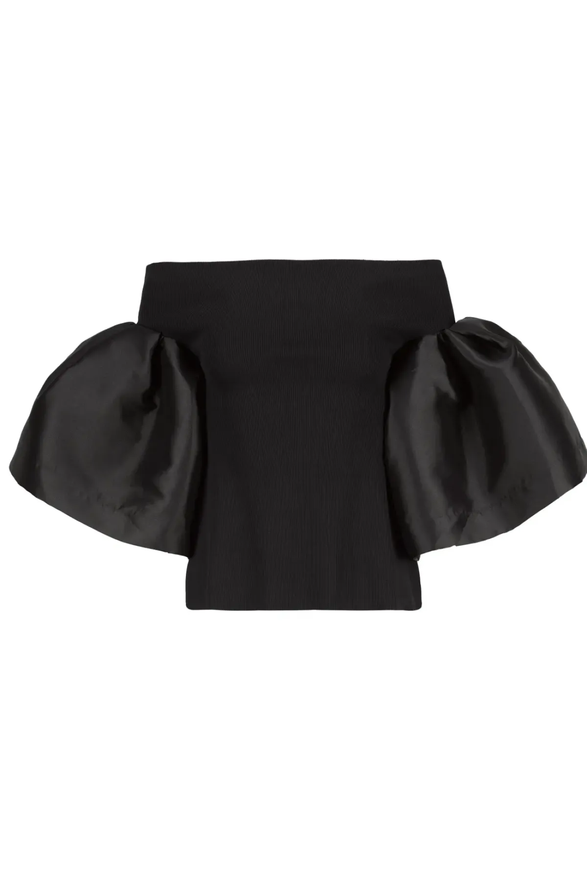 Introducing our Black off-shoulder rib jersey top with Mikado puff sleeves. Made from soft rib jersey fabric, it will keep you comfortable and stylish all day long. Elevate your look with this stunning piece today.
