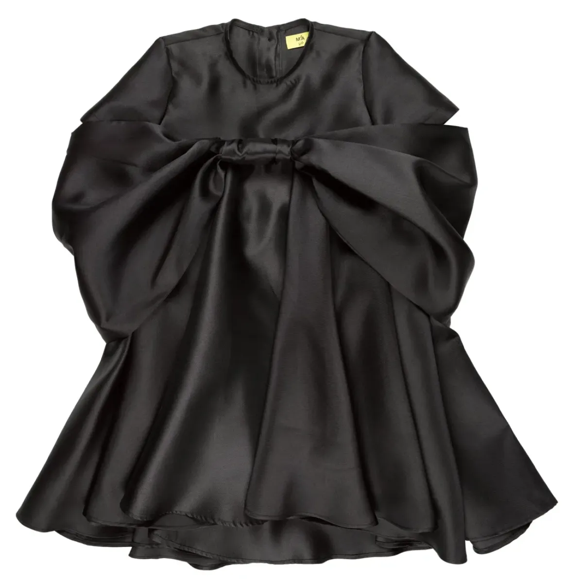 Black mikado dress with short sleeves, round neck and big front bow. Transform your little fashionista into a showstopper with this elegant black mikado dress. With its oversized bow and flattering design, she'll be the talk of the town on any special occasion.