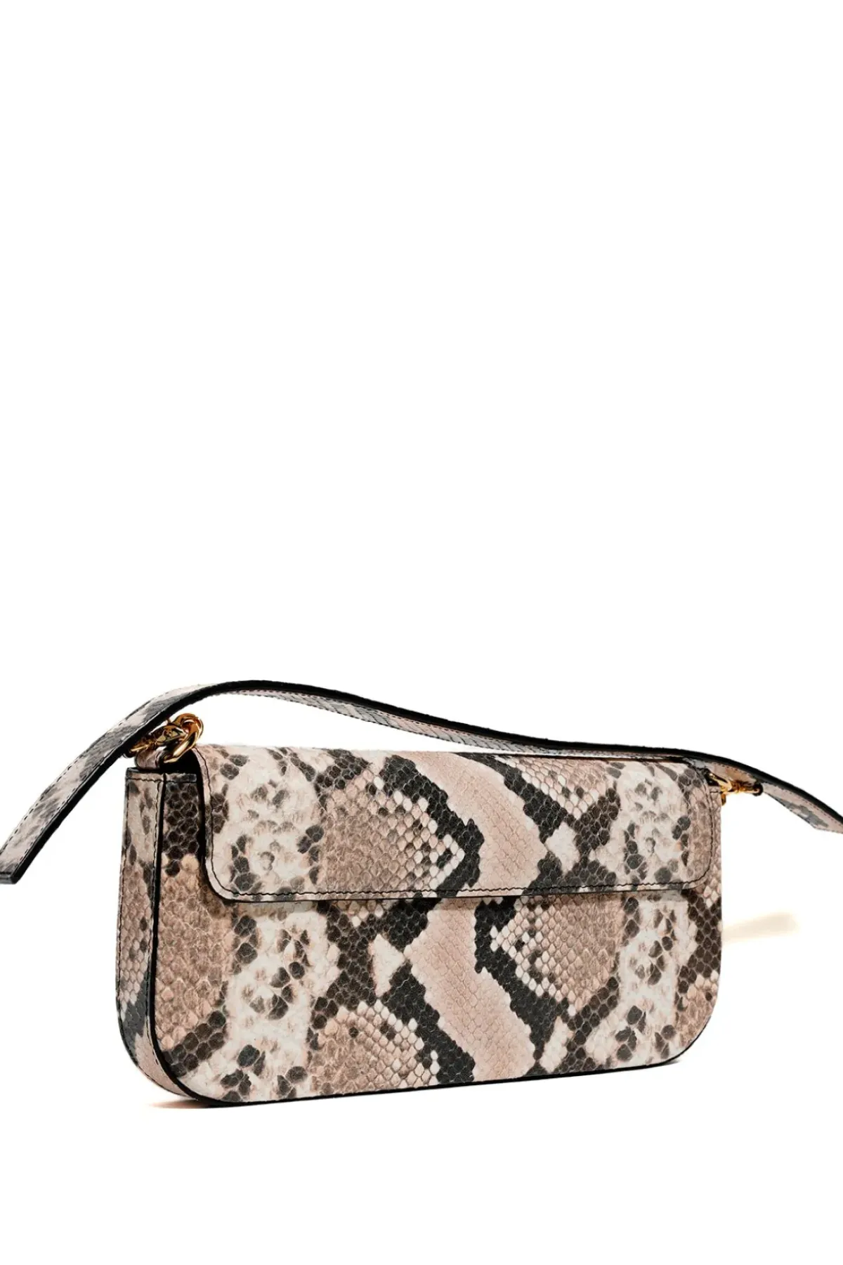 Leather clutch in snake print is designed with a practical shoulder strap and a secure magnetic closure.