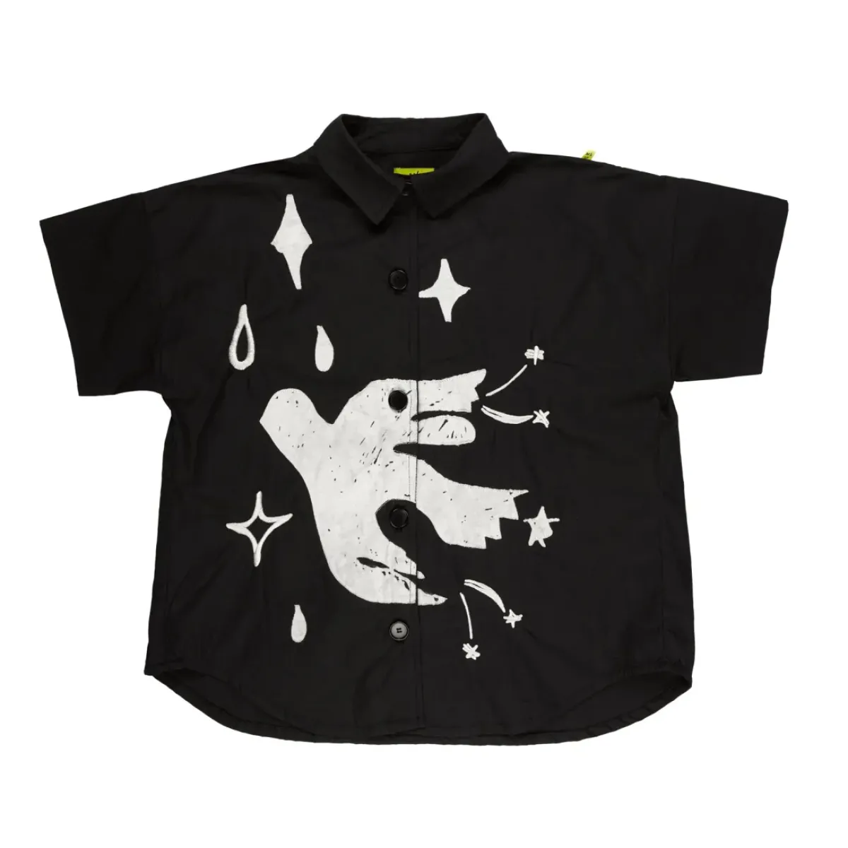 One oversized black shirt with a playful and quirky embroidered white bird on the front. Featuring short sleeves and a button-up front, this shirt is perfect for kids ready to have fun!