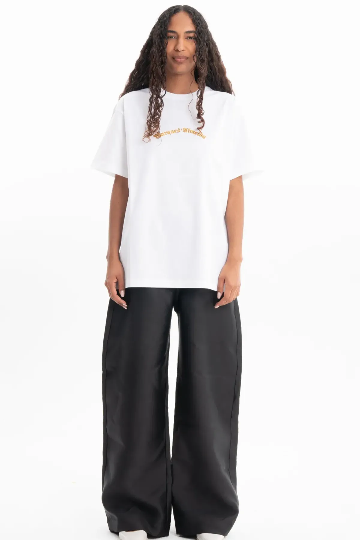 Indulge in the relaxed and cool vibes of this white oversized t-shirt, featuring a stunning gold 'Marques Almeida' logo embroidered with impeccable detail. Elevate your style with ease.