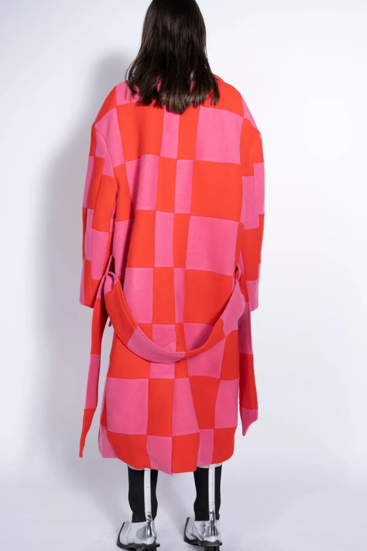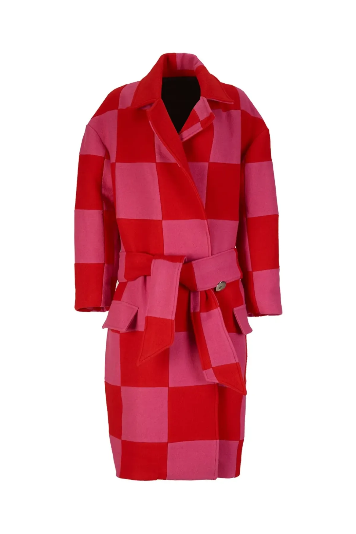This classic checkered long coat radiates with its vibrant shades of pink and red. Its wide collar and button detail at the front add a timeless touch of style.
