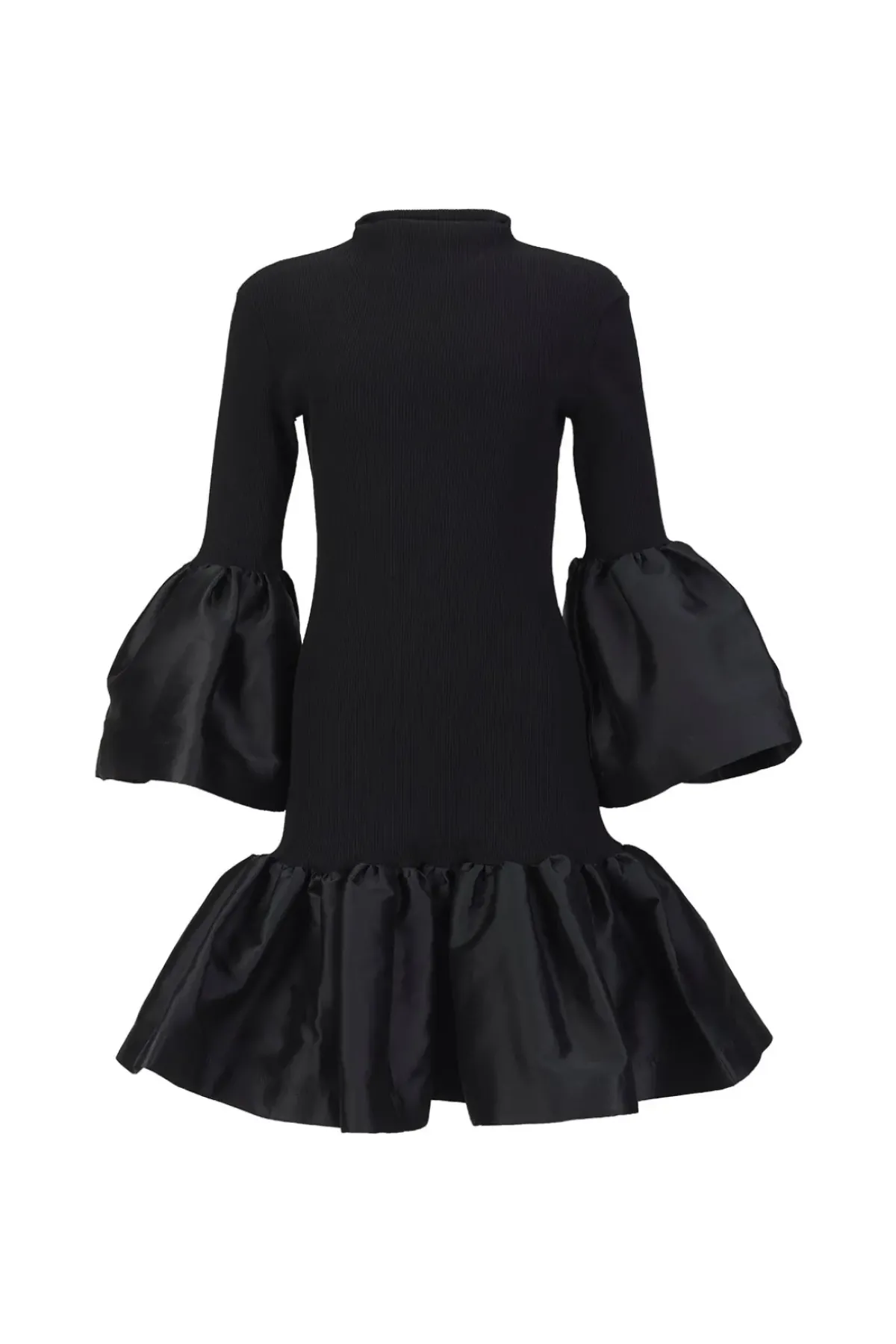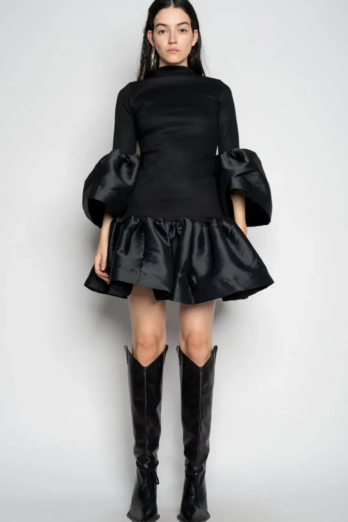 Meet our black midi dress with a high neckline, puff sleeves, and puff hemline. Don't hesitate to add it to your wardrobe!