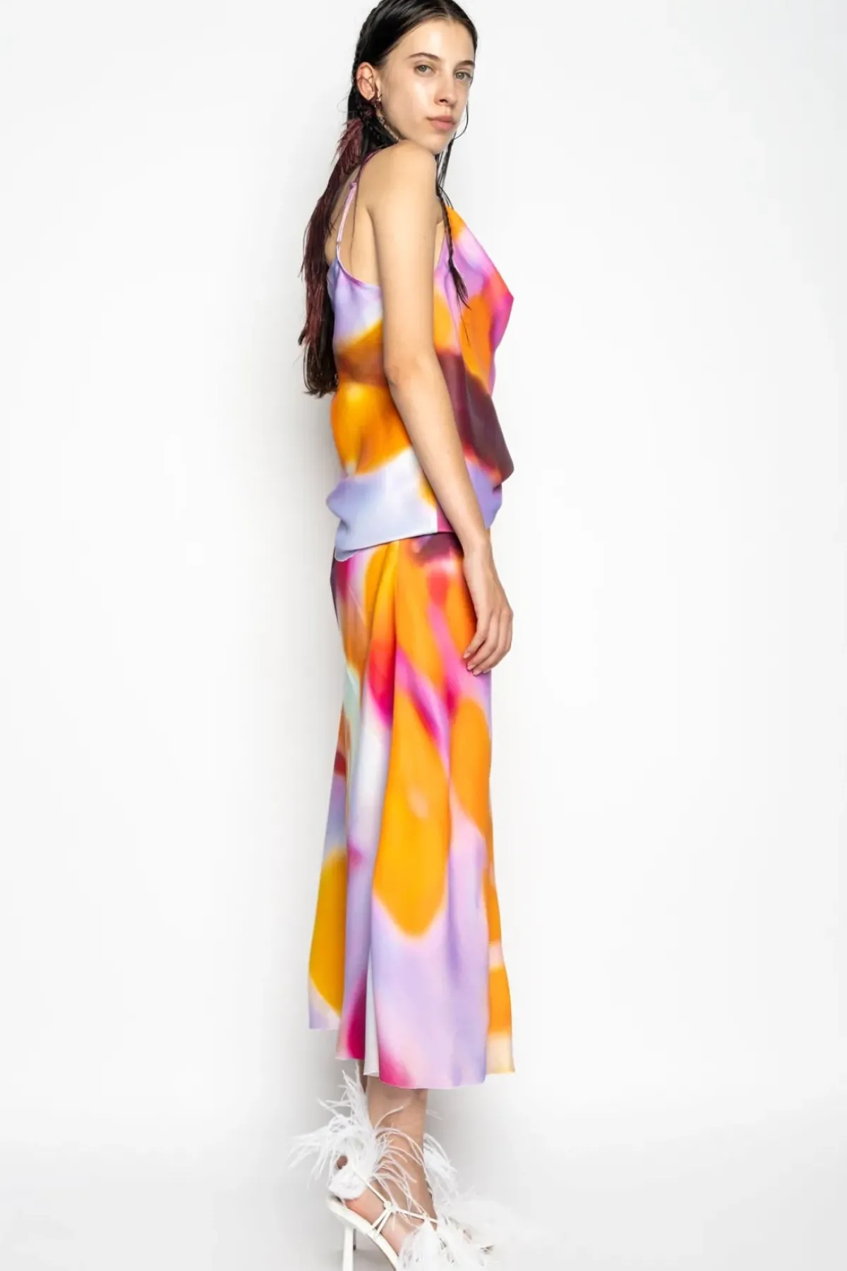 Sea slug printed satin skirt that will make you shine while being comfortable with its midi-length and elastic waist!