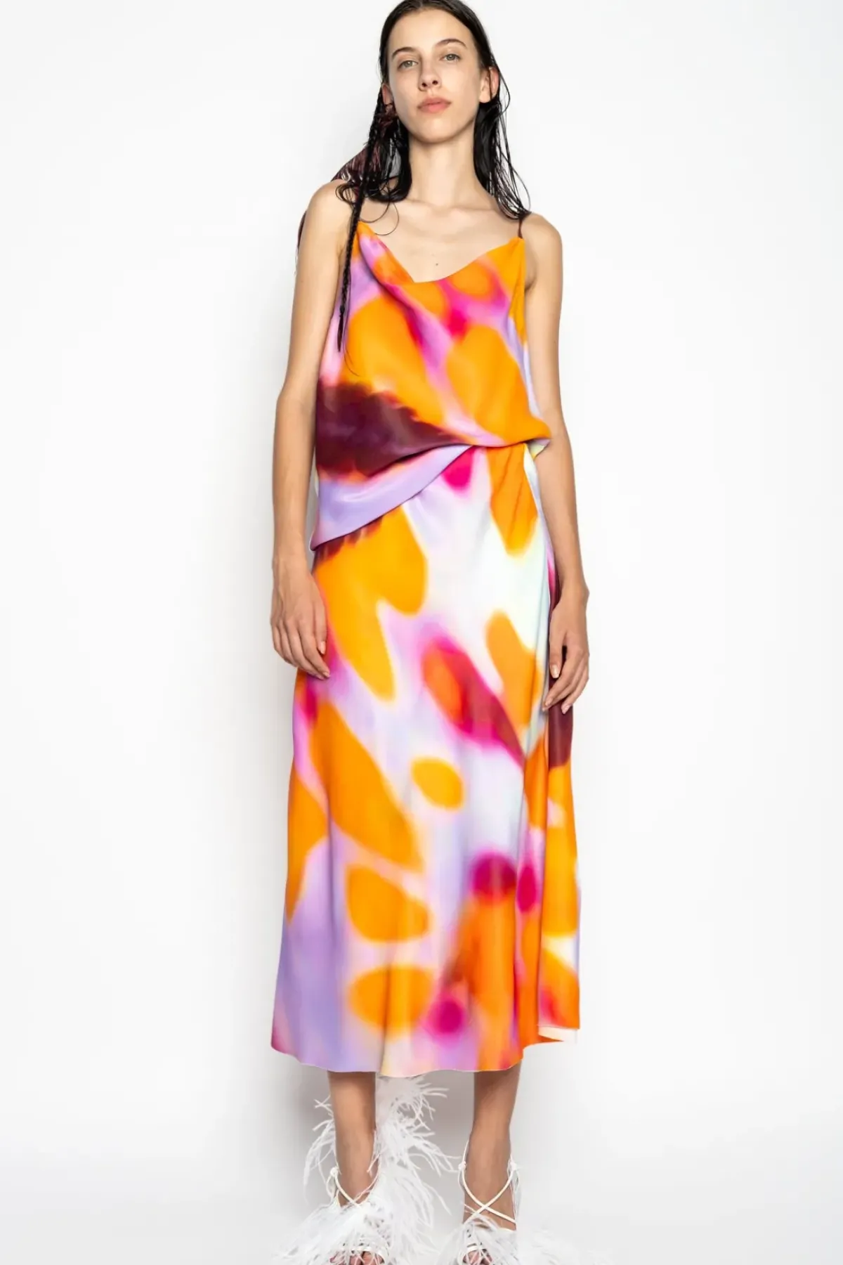 Experience the dreamy vibes of this orange and lilac sea slug print slip top with spaghetti straps and a draped neckline.