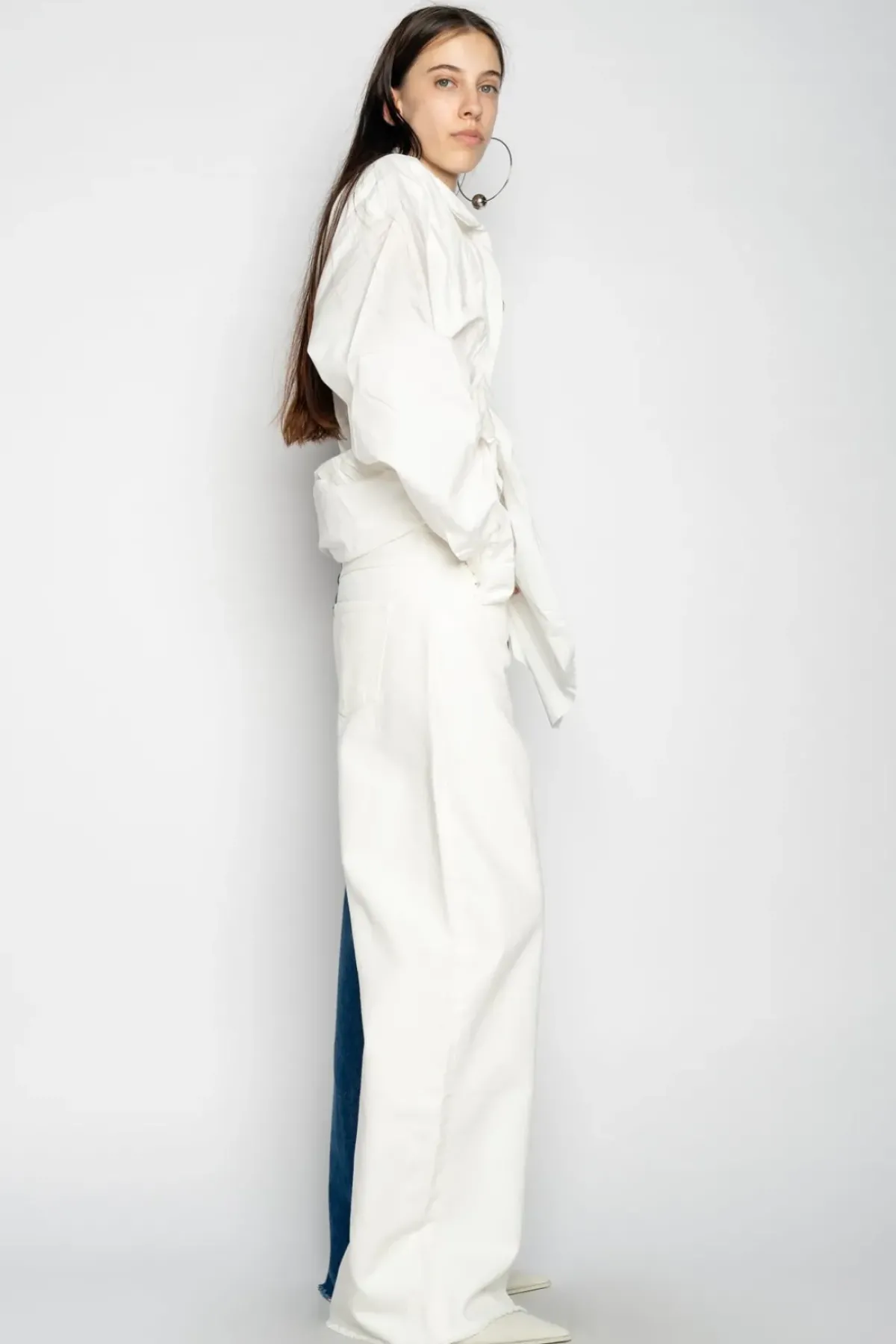 Our two-colour boyfriend trousers, boasting a sleek combination of cool blue and crisp white, completed with five pockets, a silver button and a edgy raw hem, these trousers offer an aesthetic that's sure to turn heads.