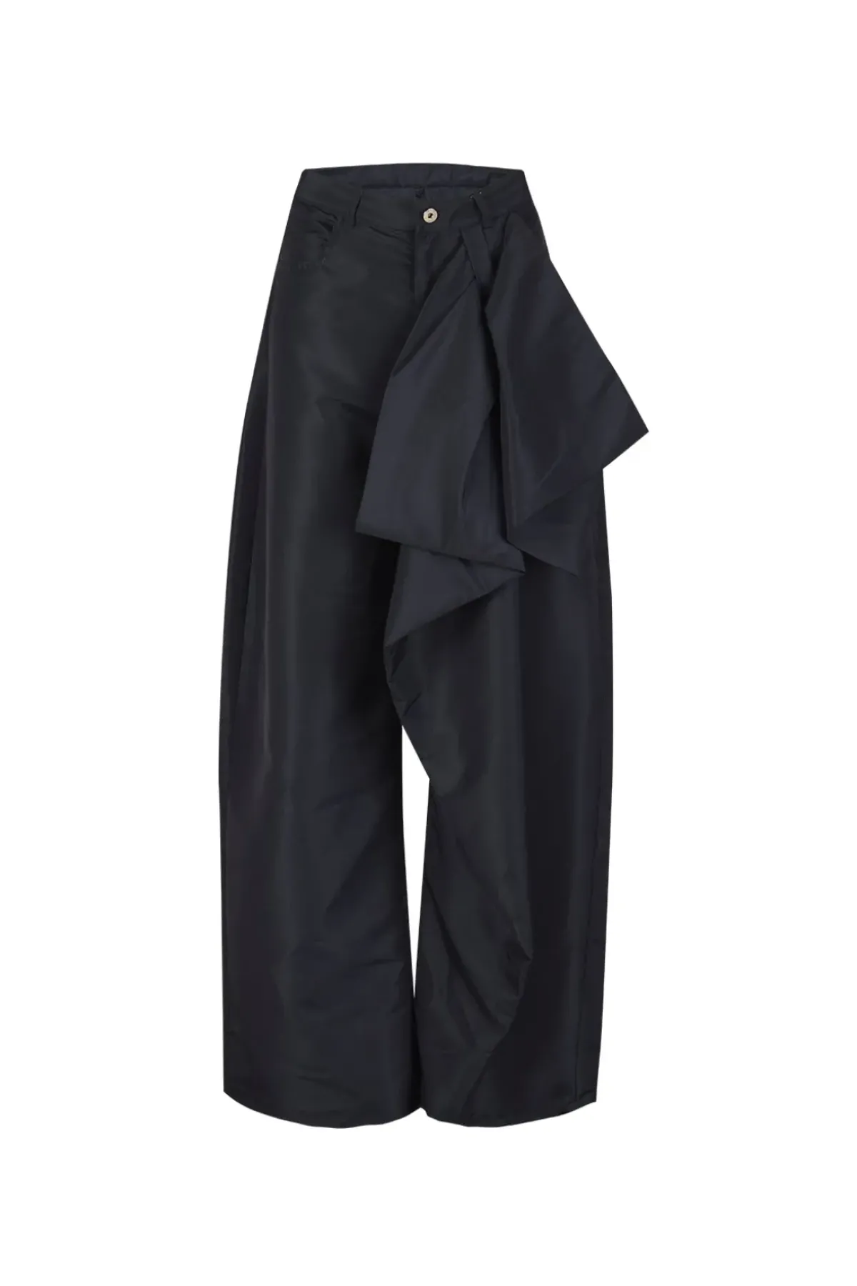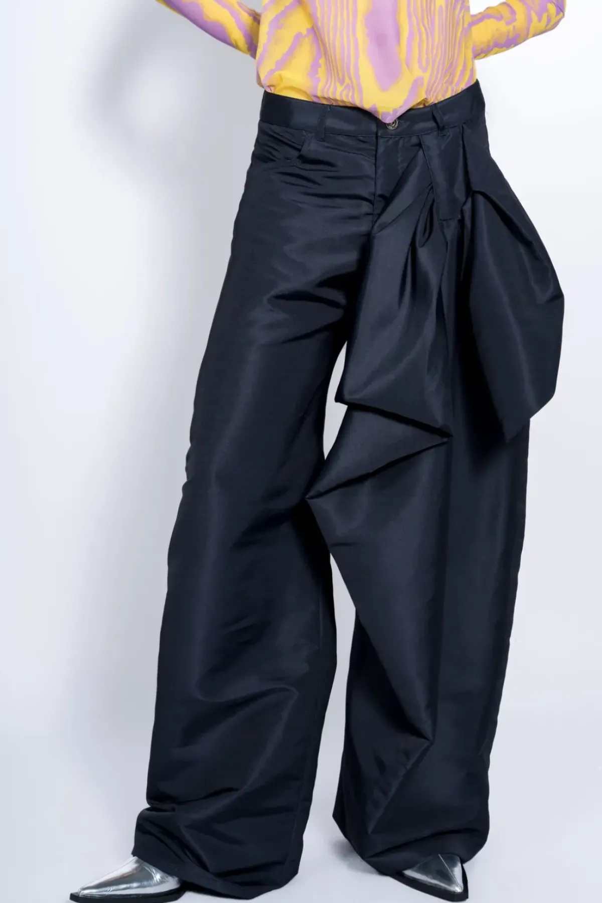 Step out in style in these black taffeta boyfriend trousers with a big bow and silver buttoning. Pockets offer added practicality, so you can look and feel your best.