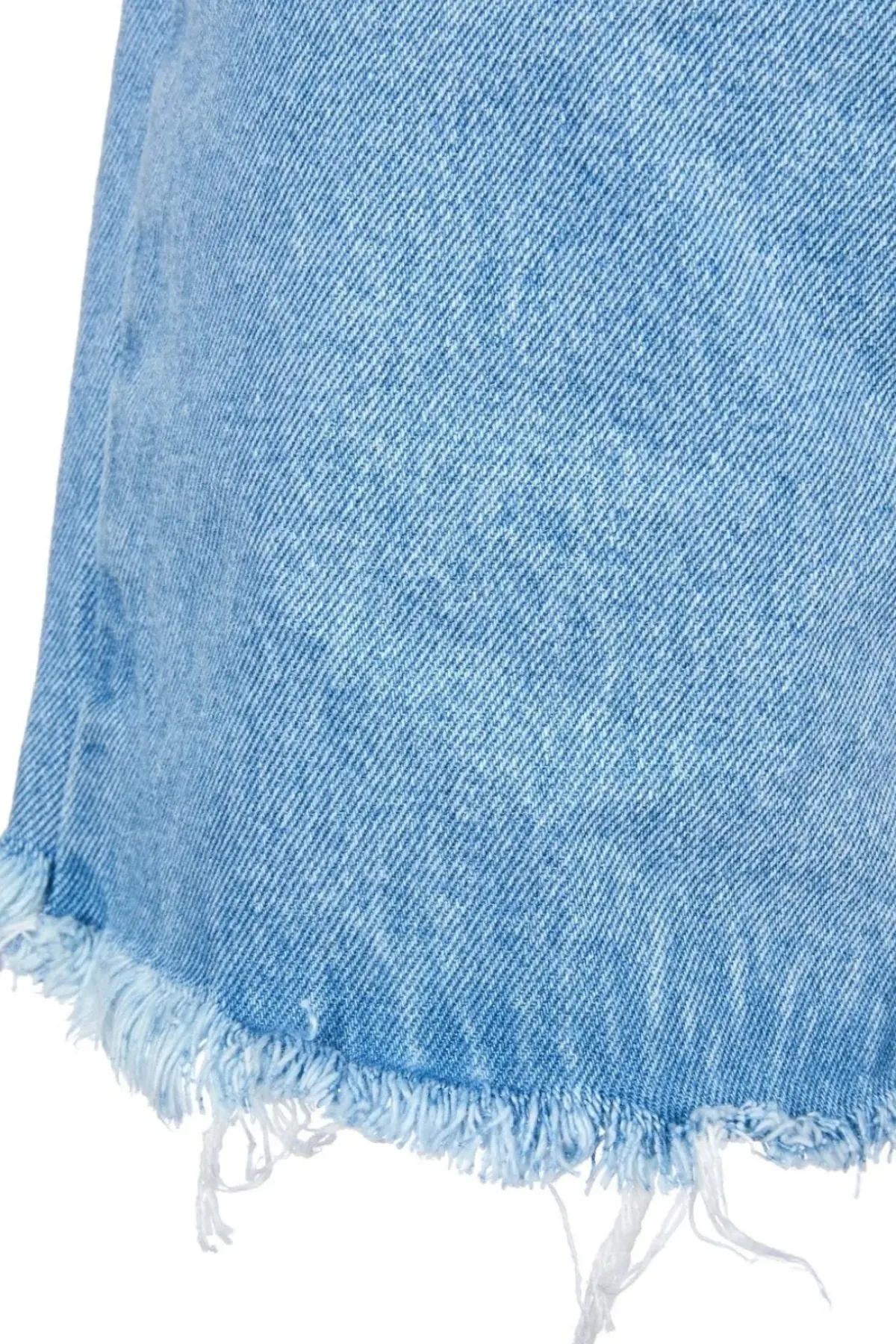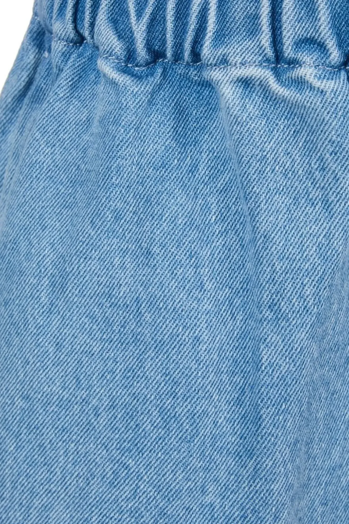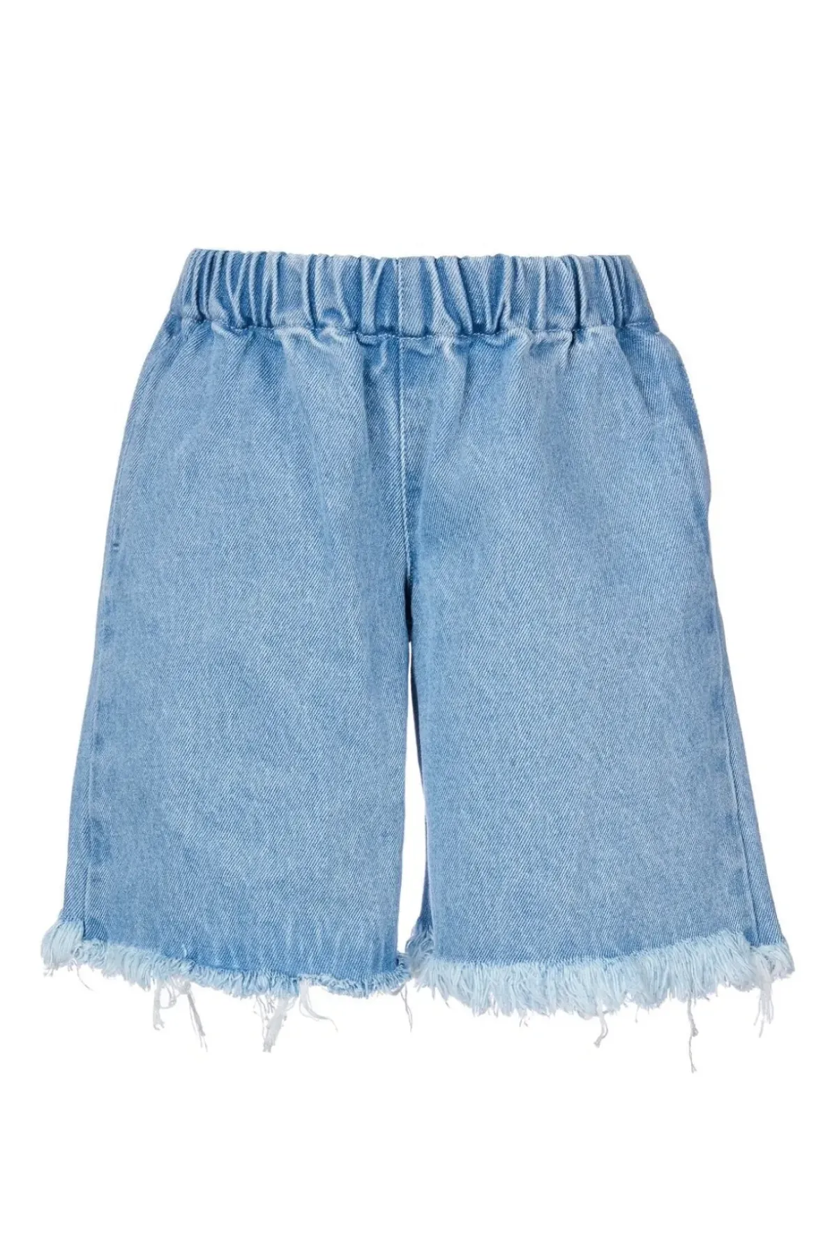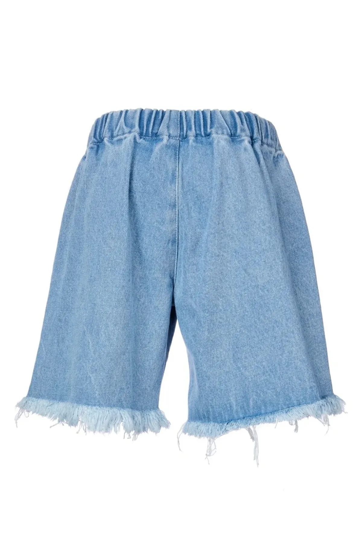Timeless blue denim shorts boast a classic wide-legged silhouette, a comfortable elastic waistband, and a raw, unrefined hem.