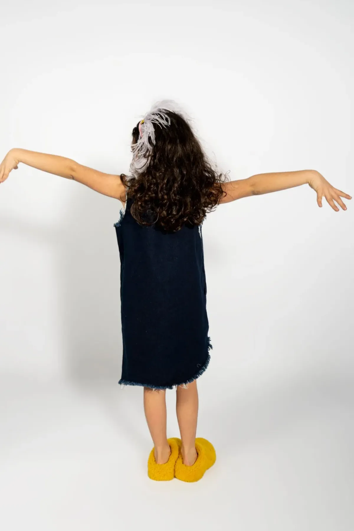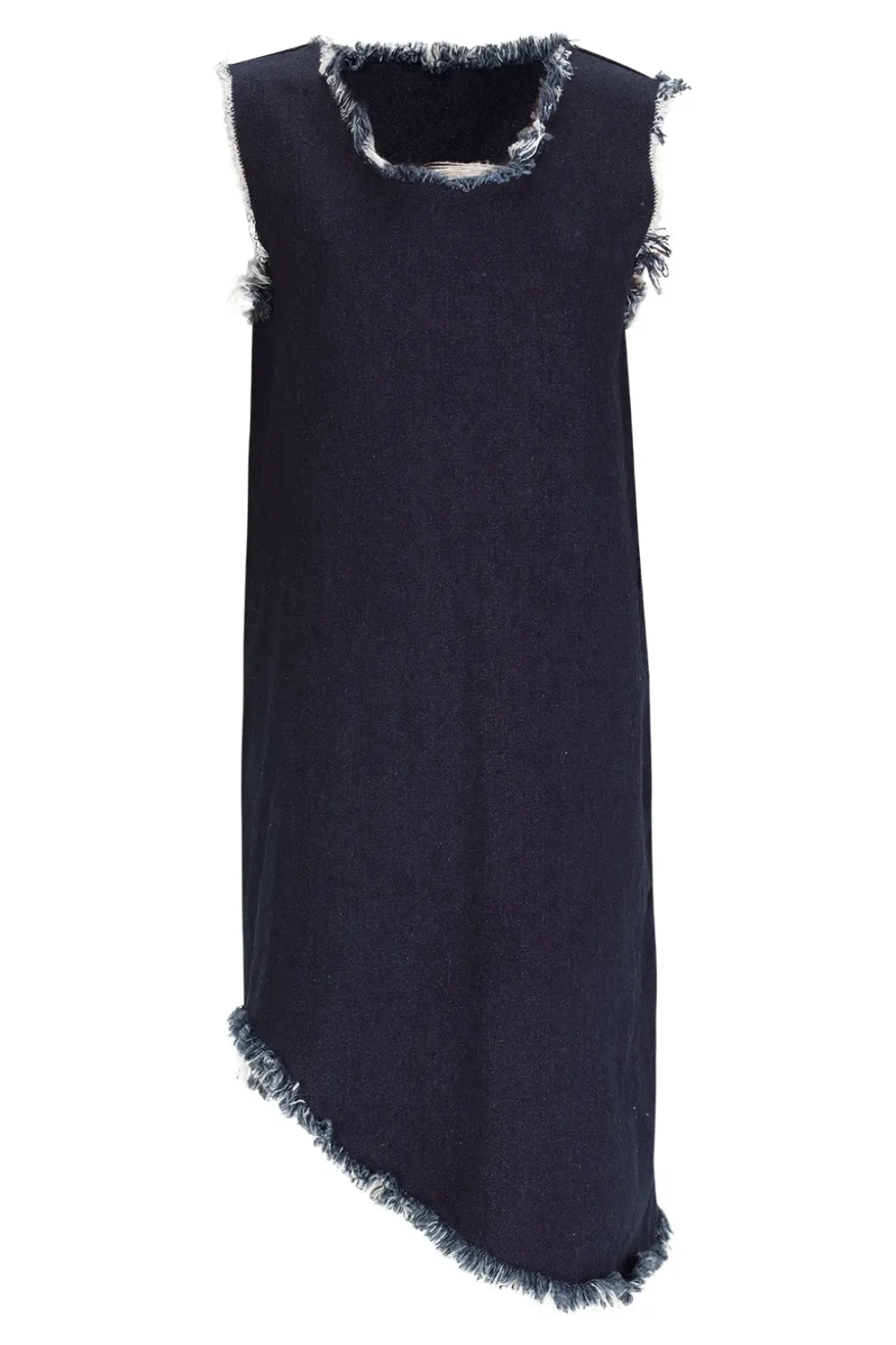 Discover the stylish denim dress featuring an asymmetrical frayed hem, a round collar and a mid-length size.