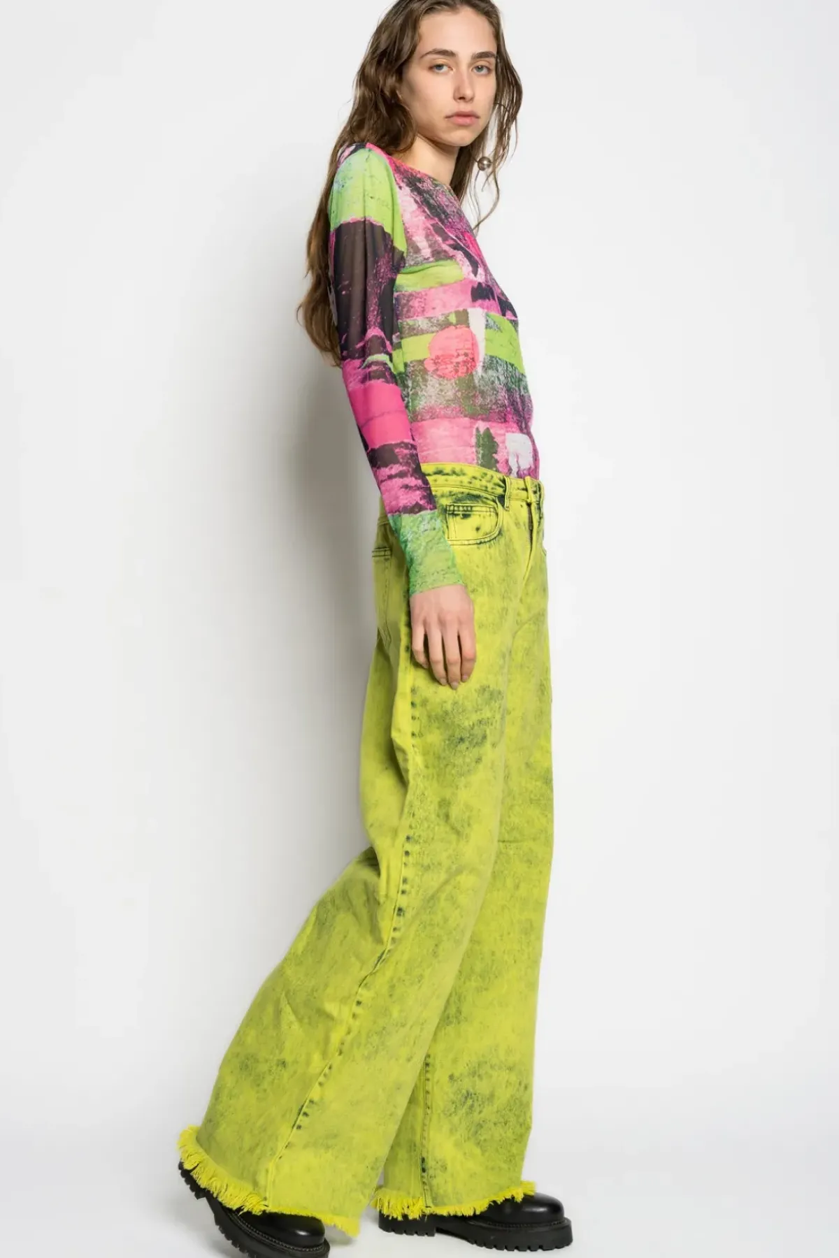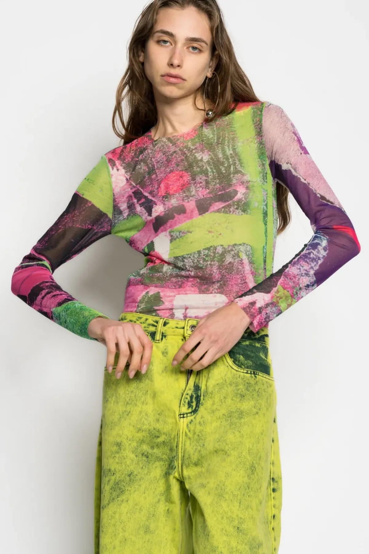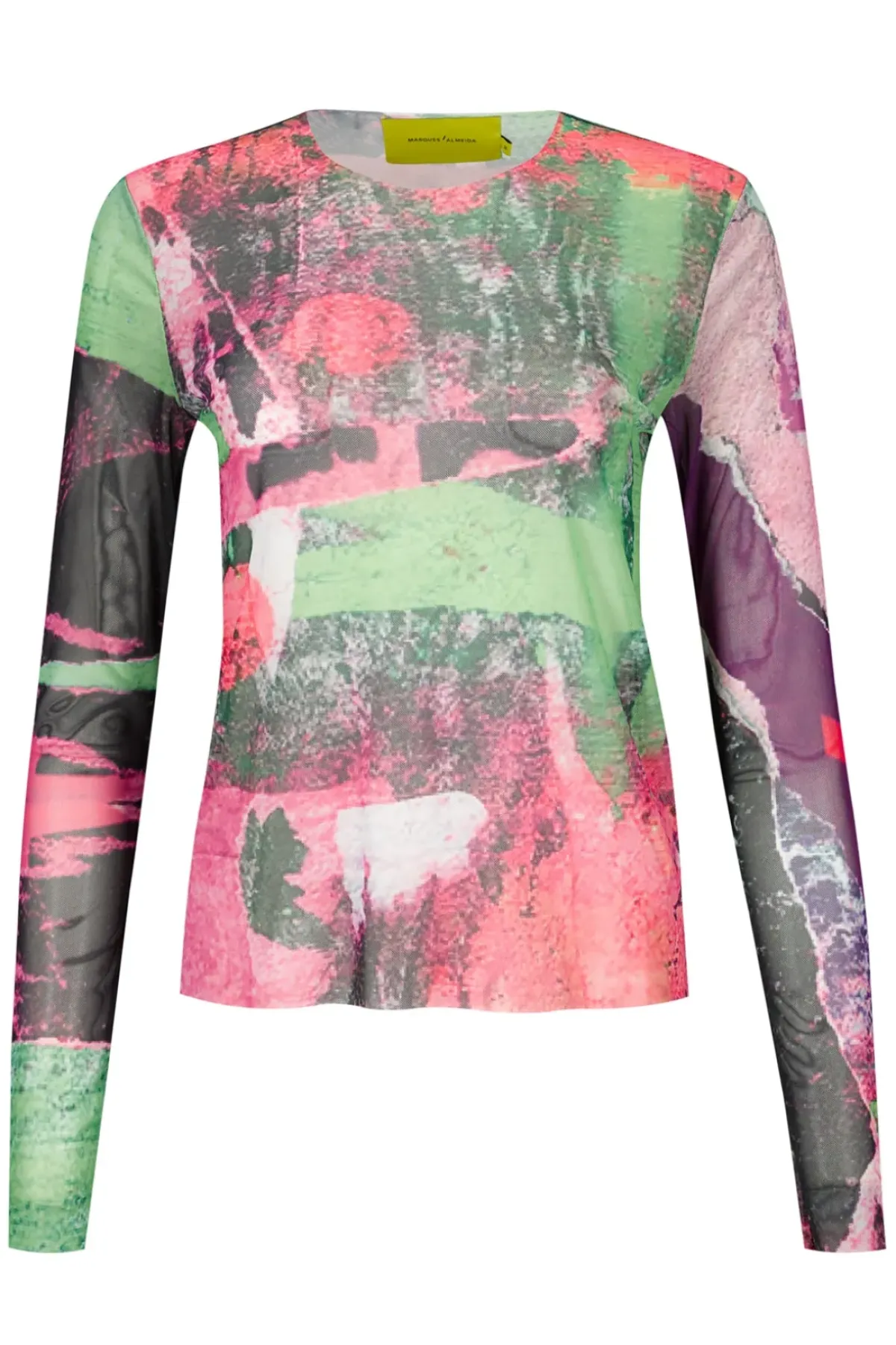 Mesh top in a colourful see-through graffiti print with a round neck and long sleeves, perfect for layering.