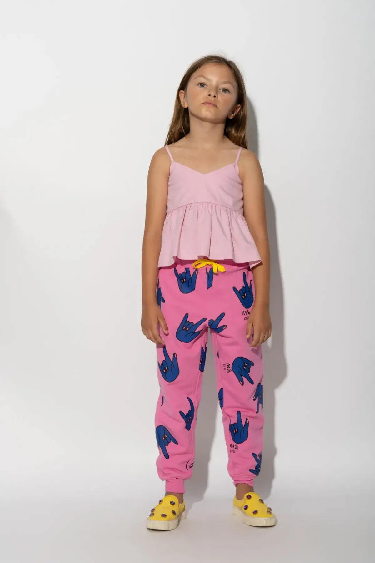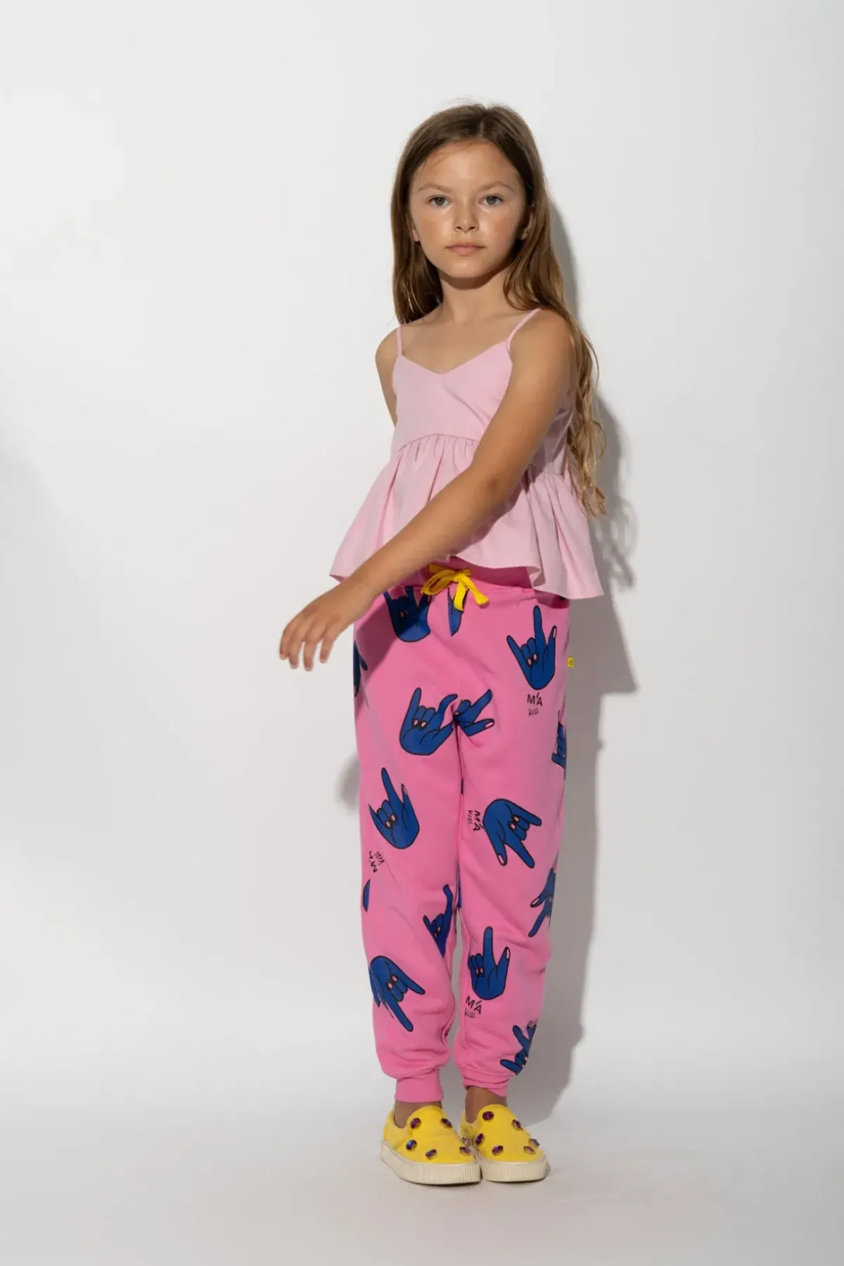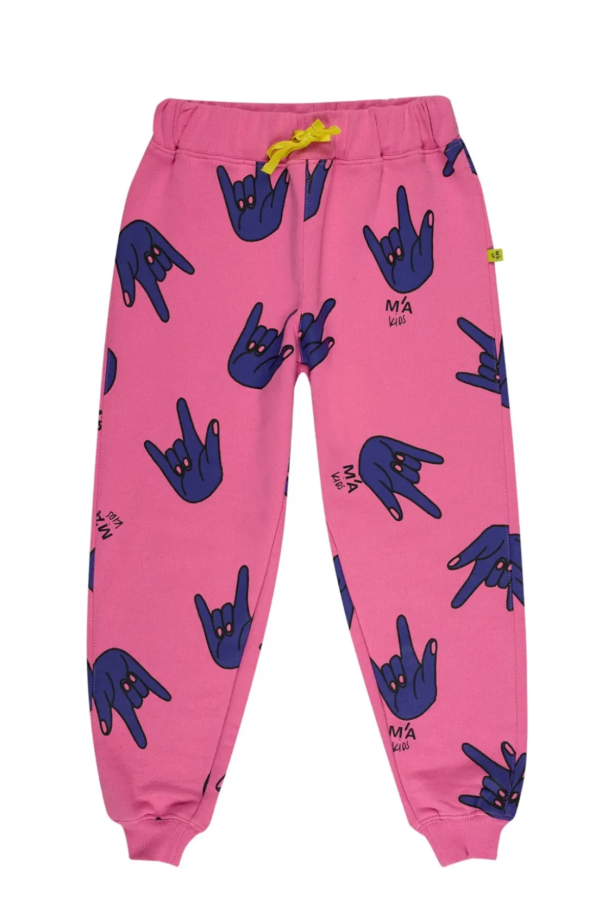 Pink hand print sweatpants made with a comfy elastic waist and hem, these fleece pants are perfect for kids who love to stand out in a playful and quirky way.