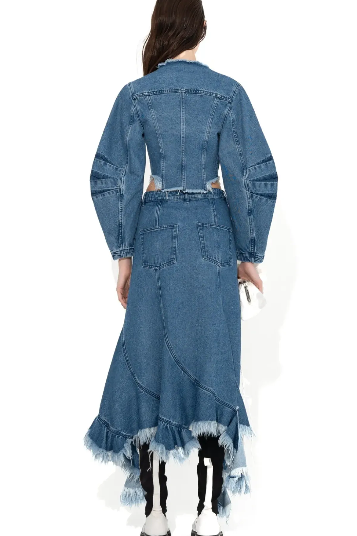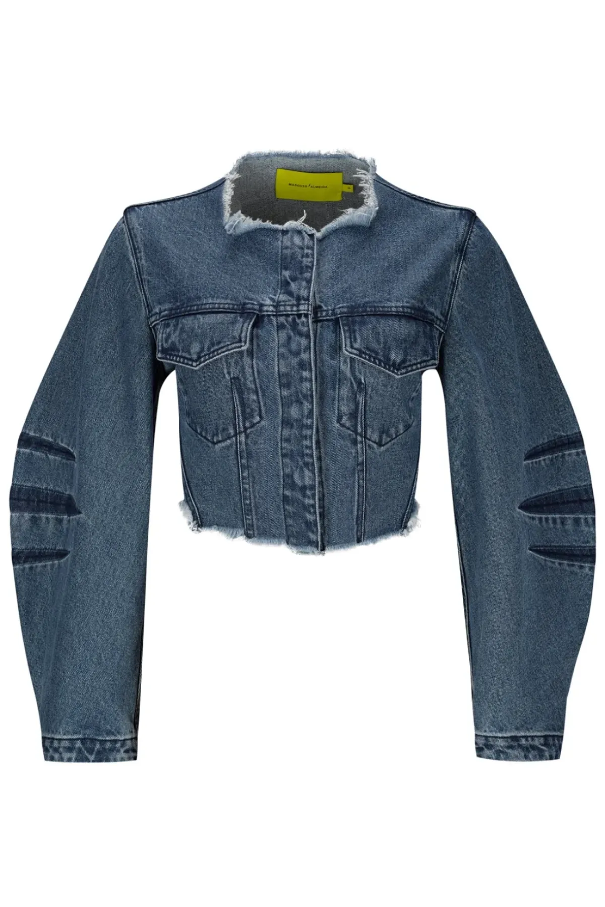 This mid-blue denim jacket captivates with its cropped fit, round shape sleeves, front snap buttons, raw hem and round neckline.
