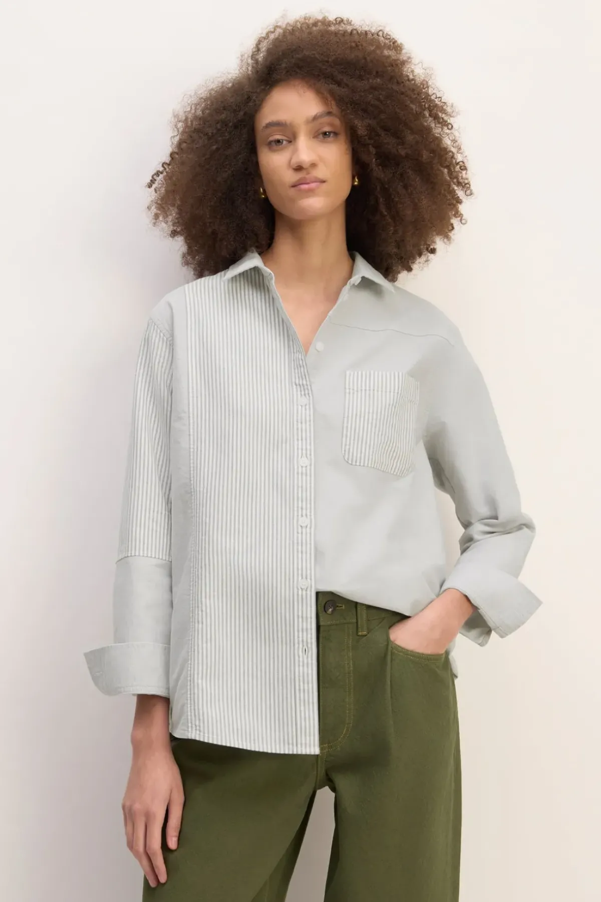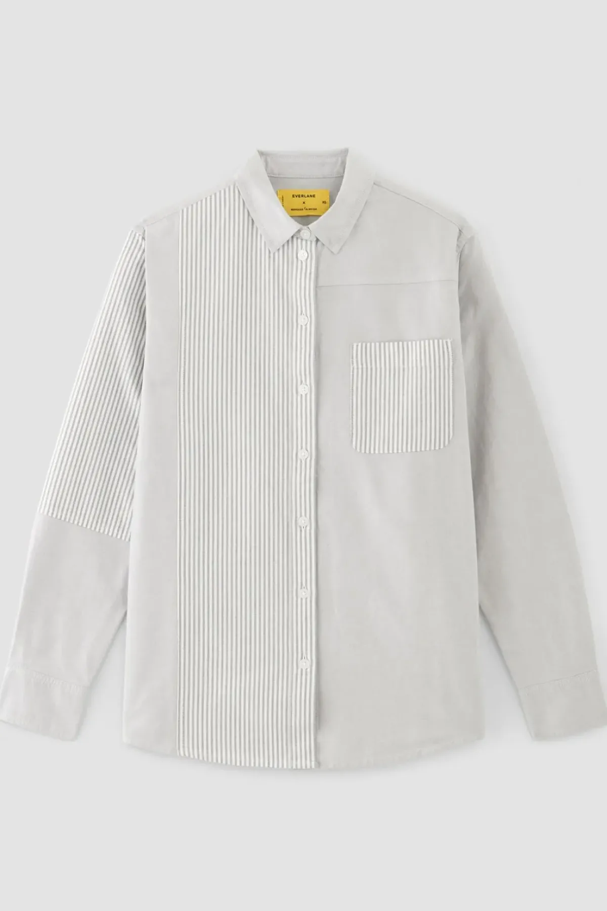 Grey patchwork shirt with its mix of plain grey and stripped grey cotton, long sleeves, button-up front and a front pocket this must-have piece to a comfy look.