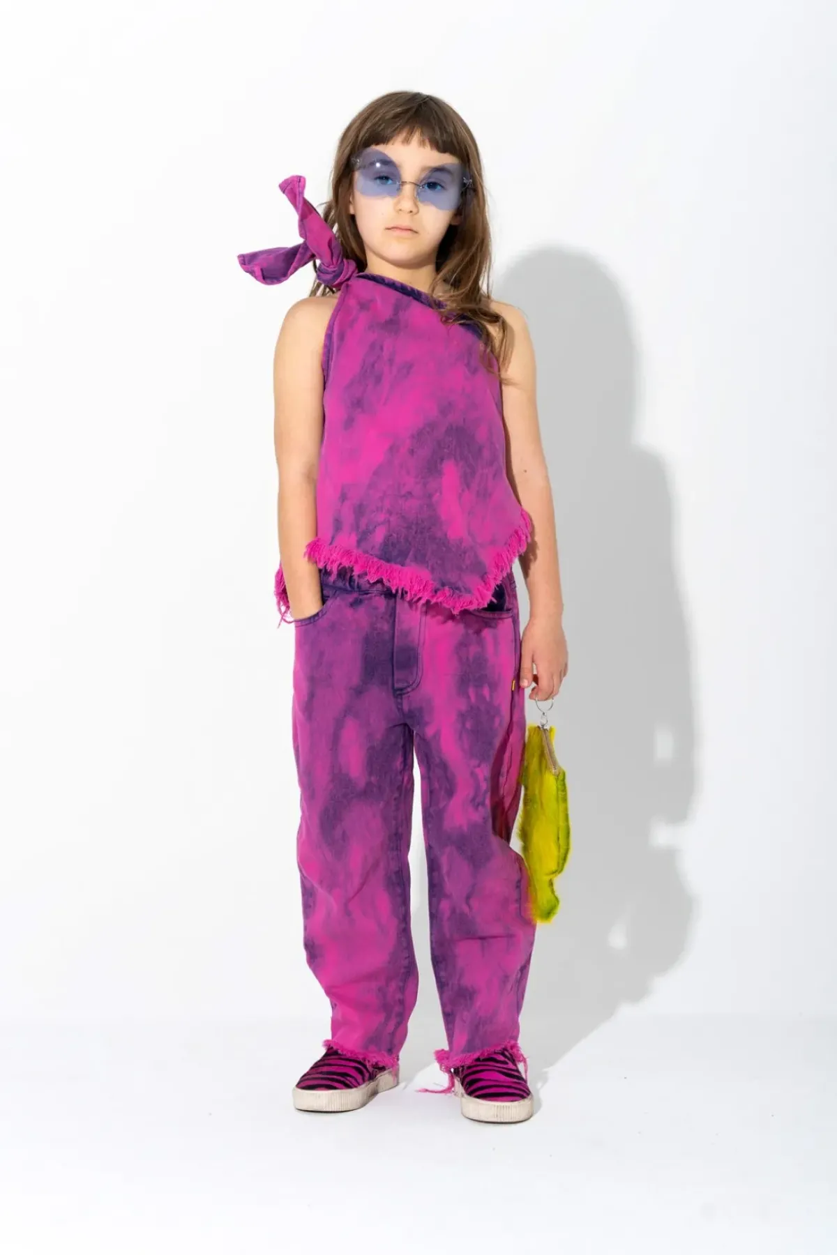 Baggy pants in bold pink-dyed denim with a comfortable elastic waistband and comfy pockets – kid-approved!