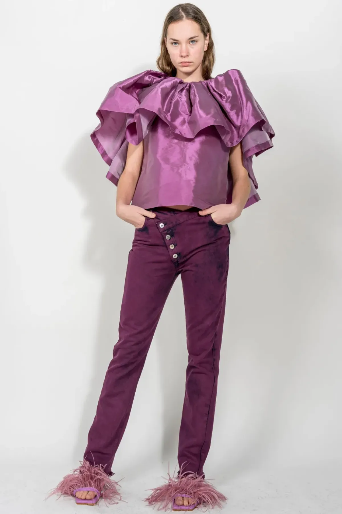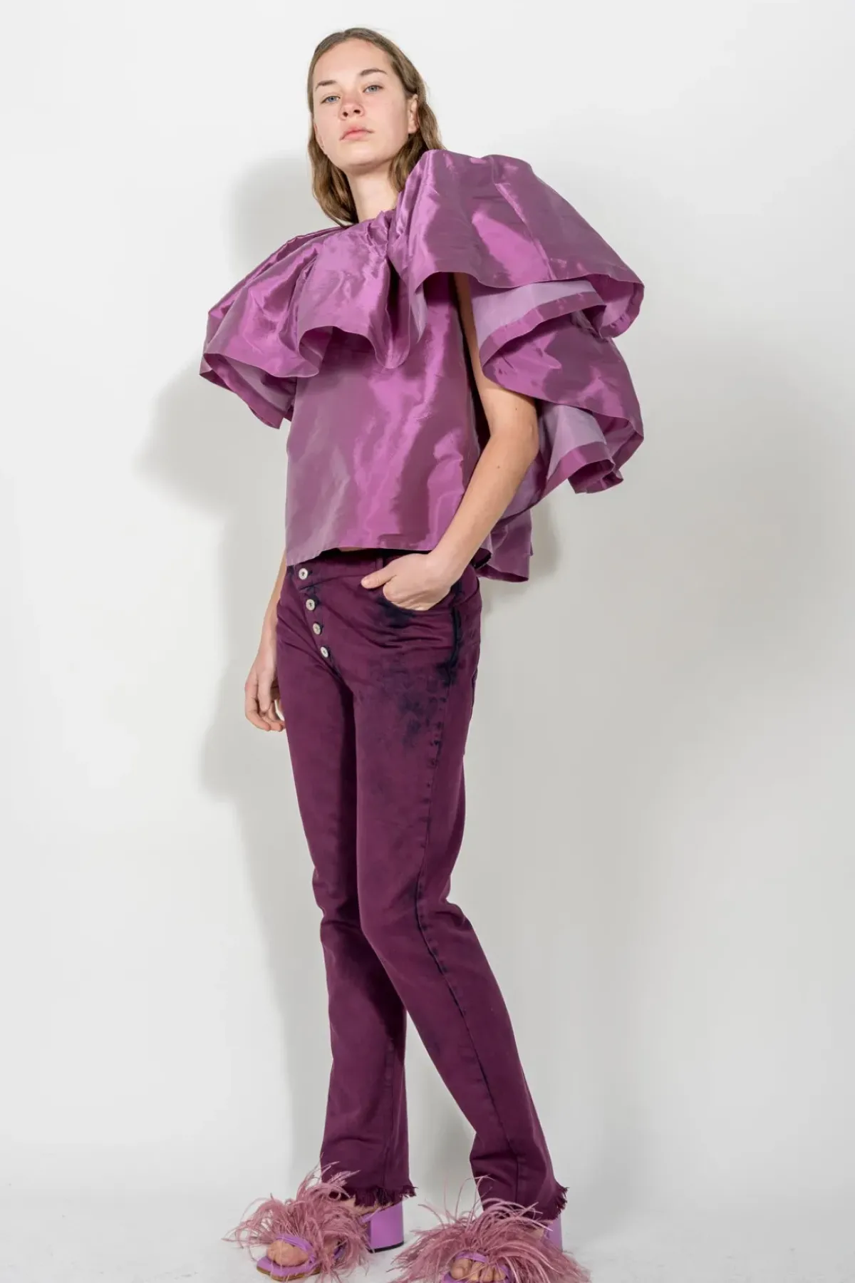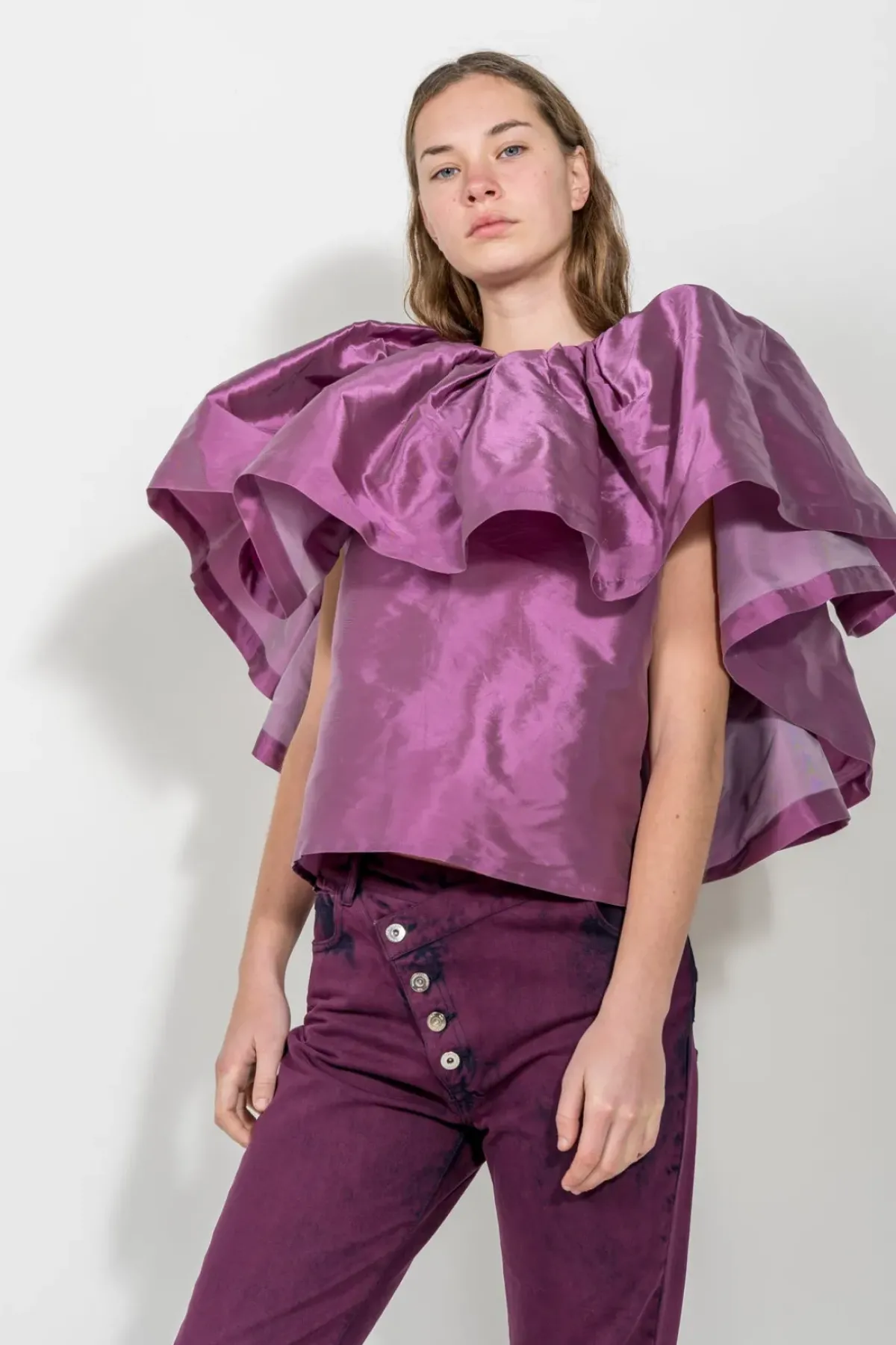 Meet our lilac cape top featuring a voluminous, pleated design and a gathered neckline. Fasten it in the back with a self-tie closure and make a statement!