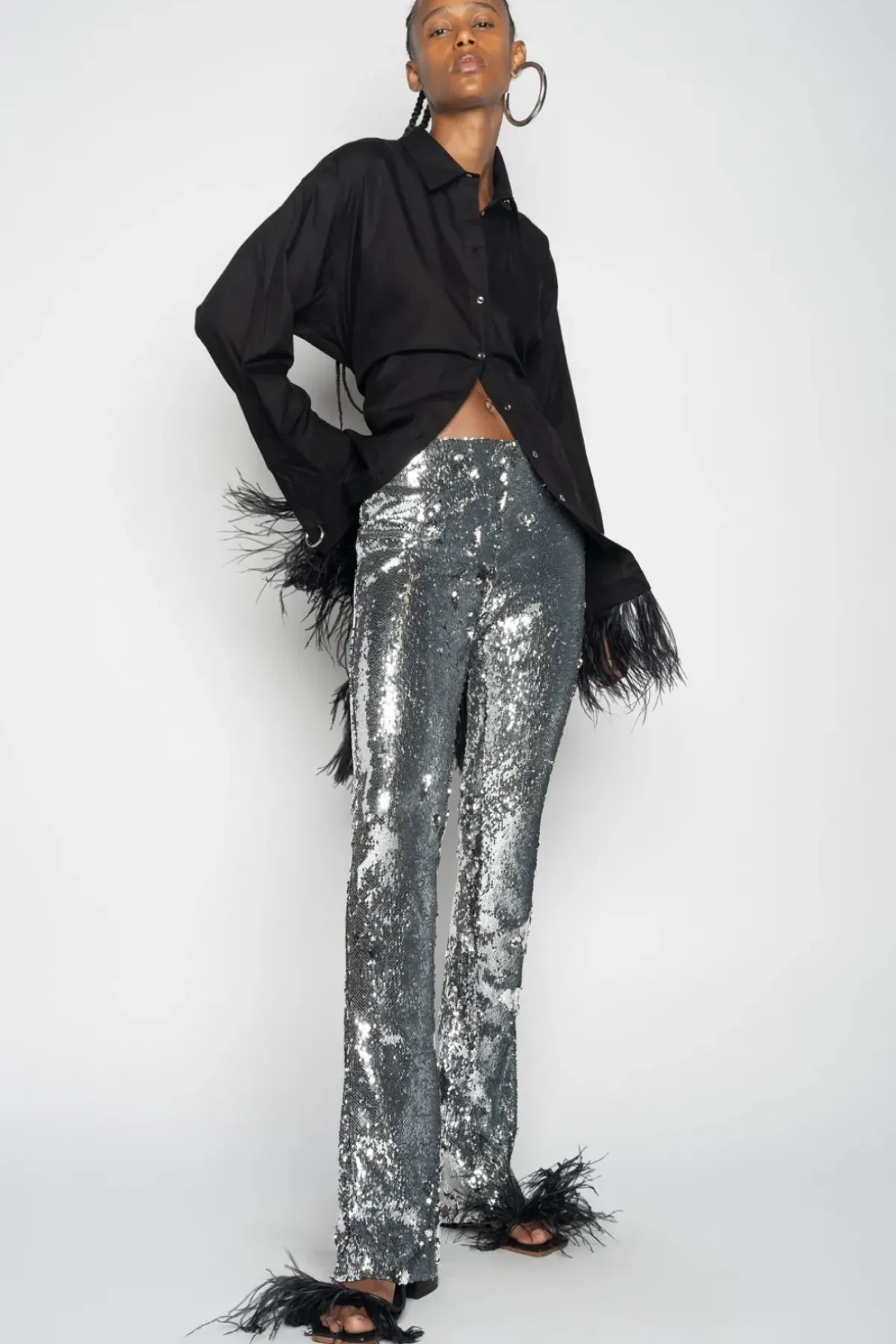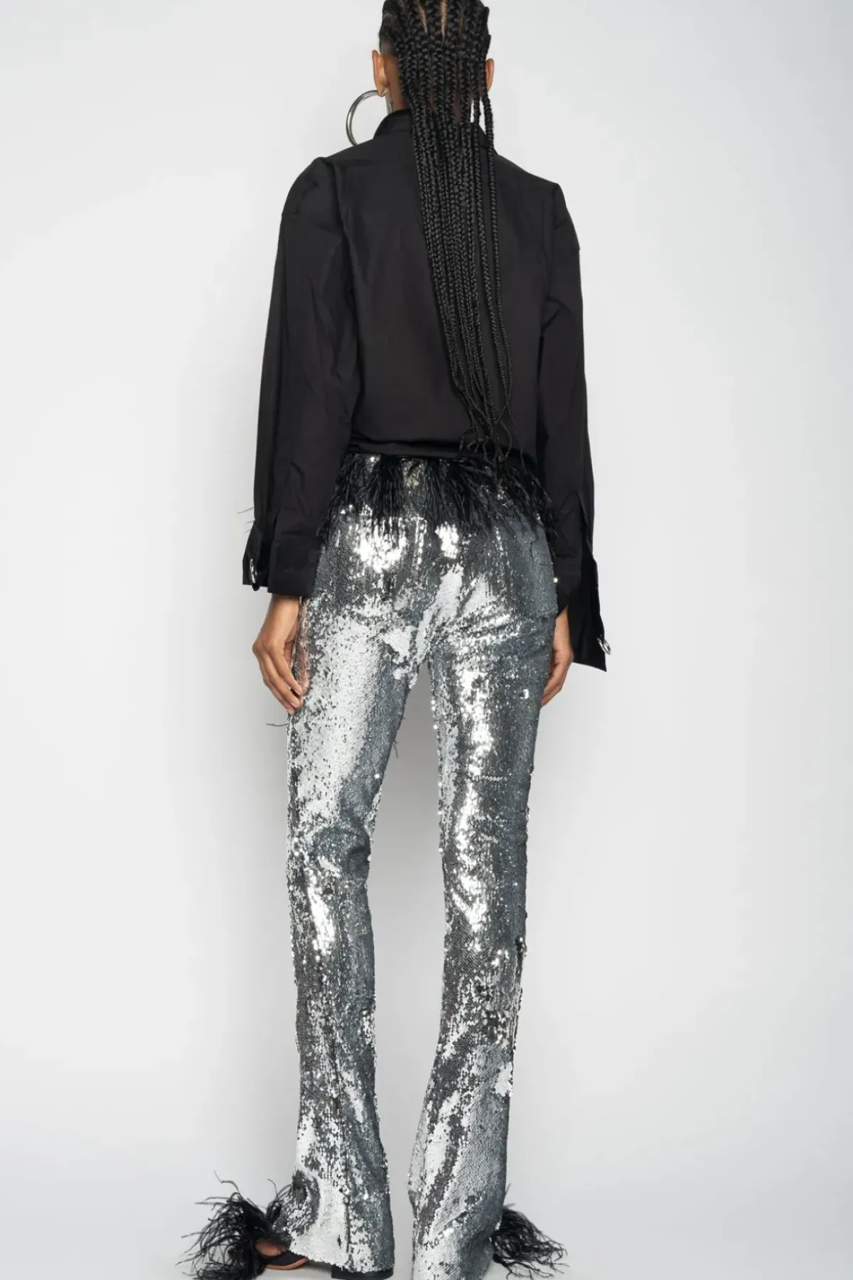 Slip into these dazzling silver sequin trousers, featuring slim legs, back patch pockets and a side zipper for an effortlessly stylish look.