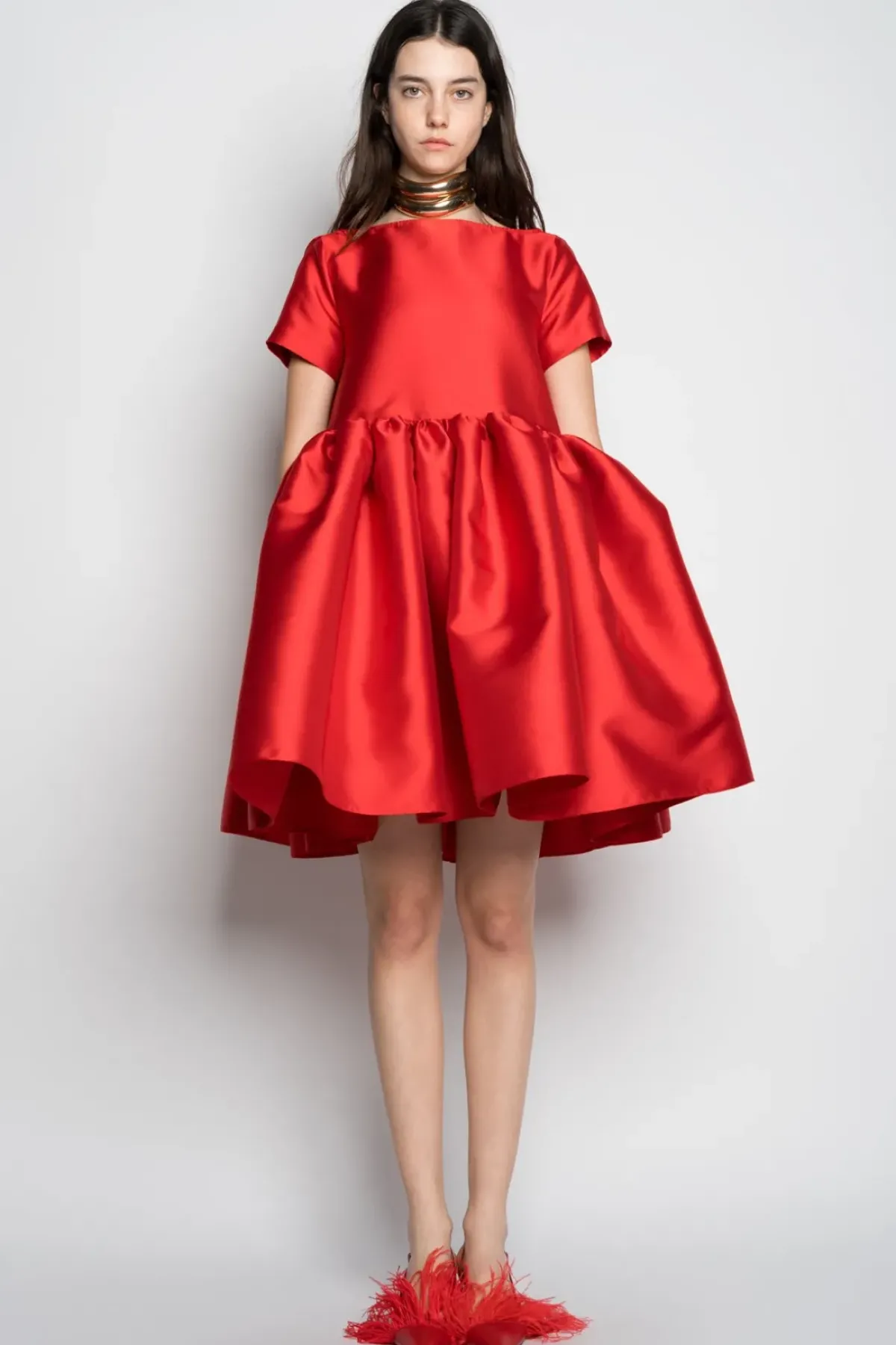 Impress in this red short cap sleeve puff dress made of mikado fabric. The boat neck adds a touch of elegance, while the puff hem adds a playful twist. This dress will have you feeling confident and chic.