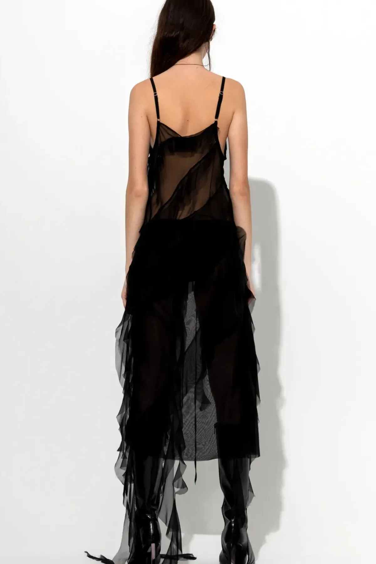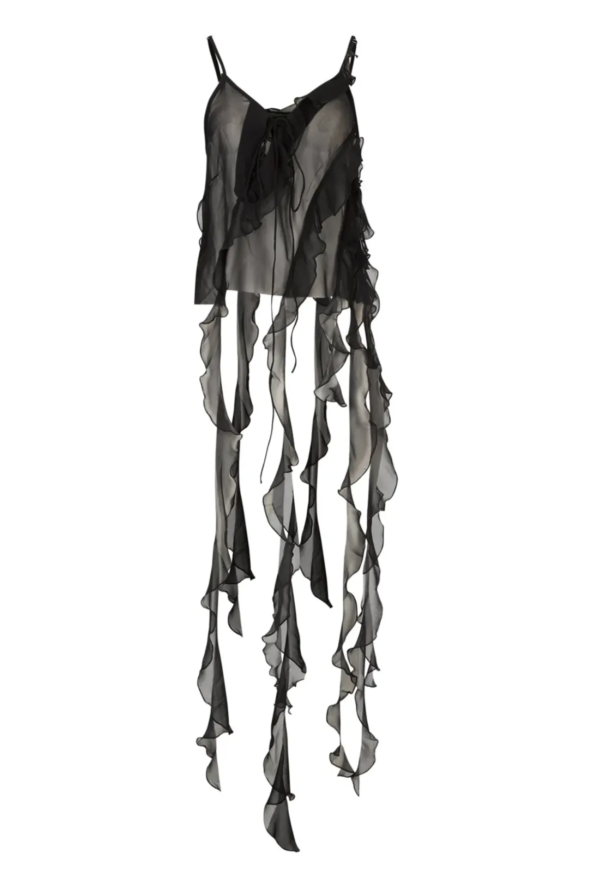 Black silk top with a cascading asymmetric frill that will turn heads as it sweeps across the floor.