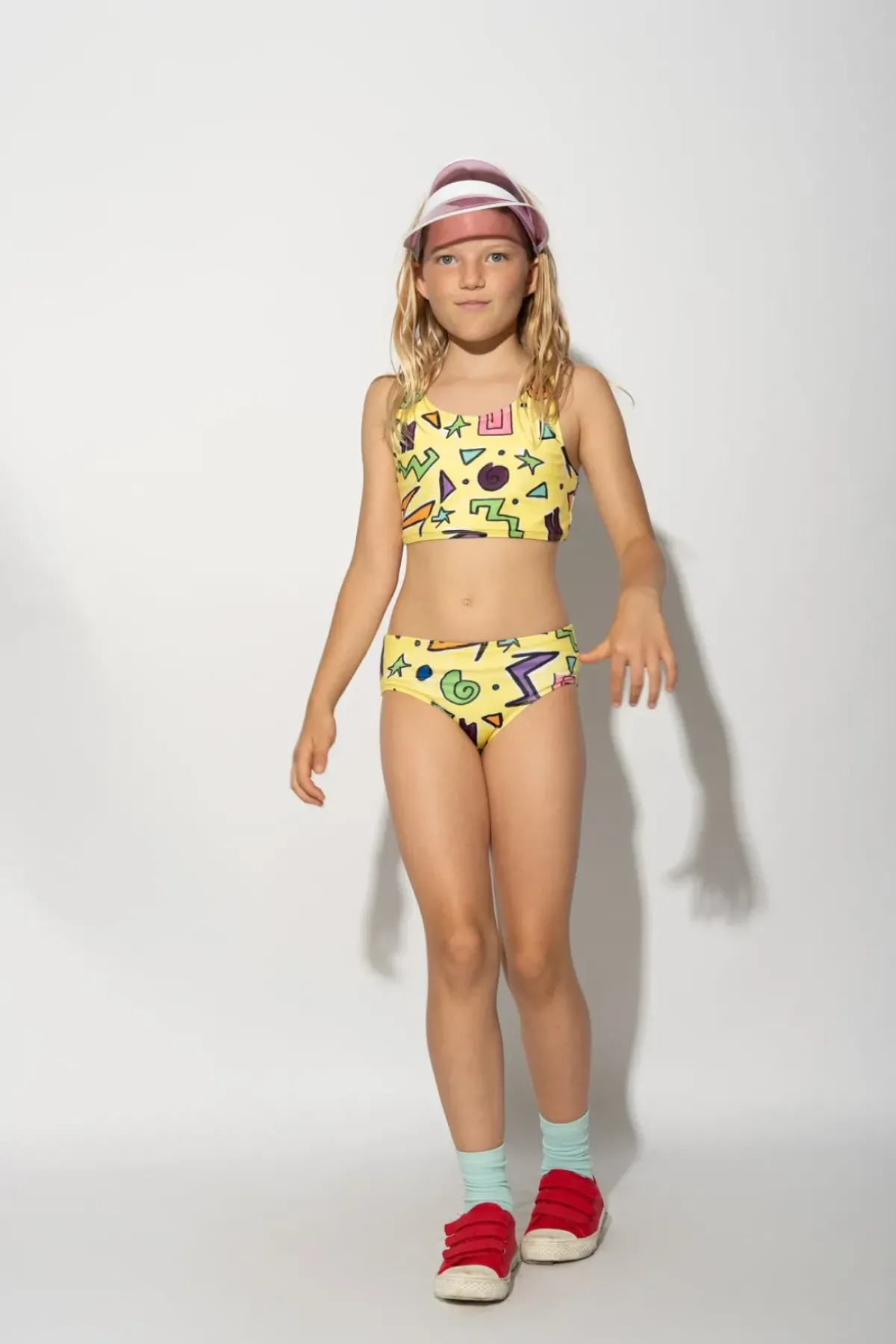 Featuring yellow squiggle print briefs, a strap top with a U-neckline and enough elasticity to make a splash, your kiddo will be ready for summer fun with this playful swimwear set!