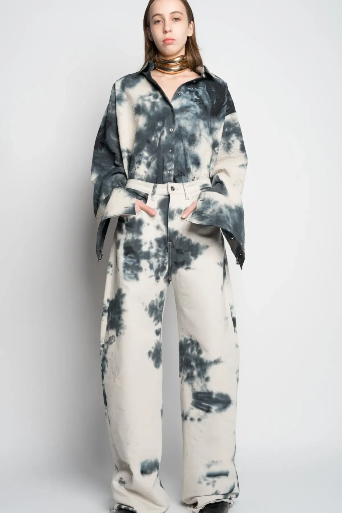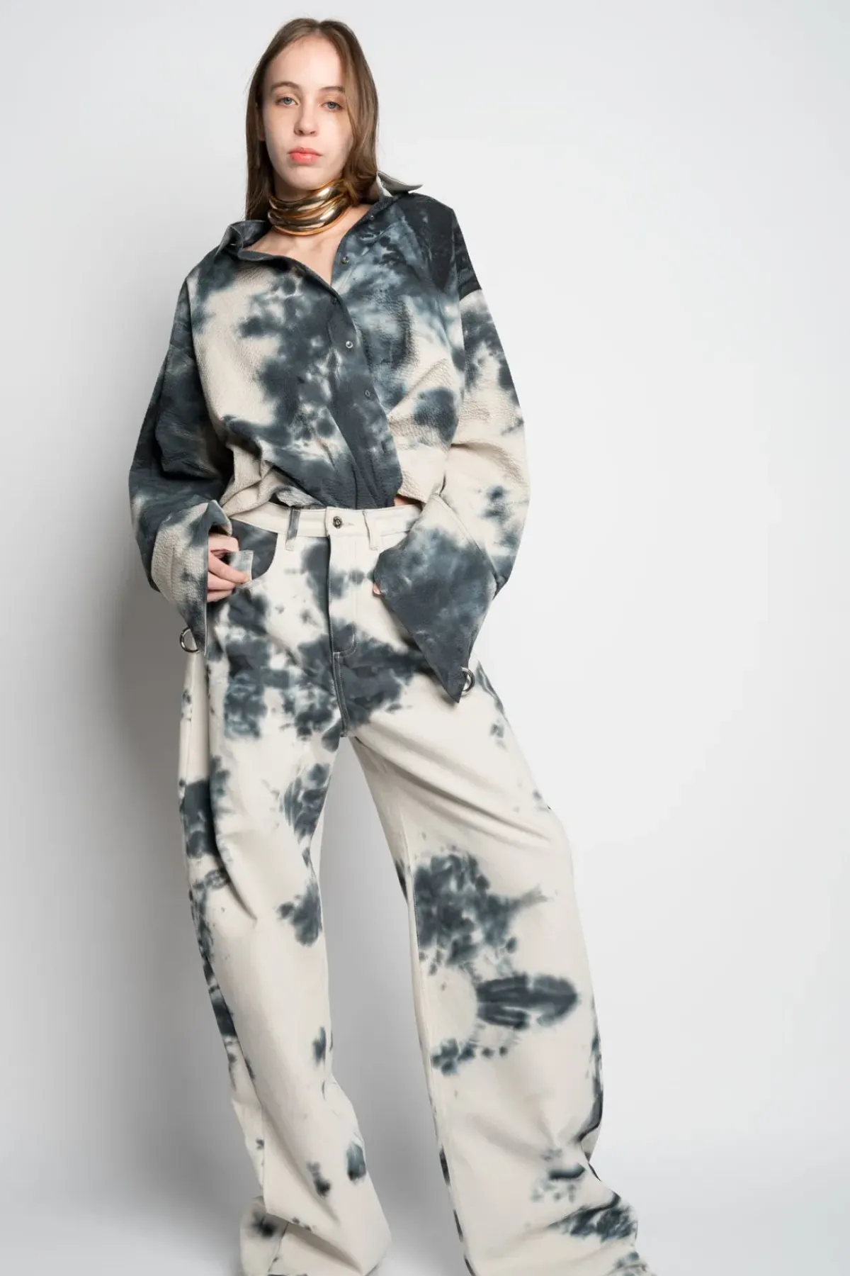Stand out in these M'A 5-pocket boyfriend trousers in a unique tie-dye black and off-white. These wide-leg pants showcase a cozy high waist and unfinished hemline.