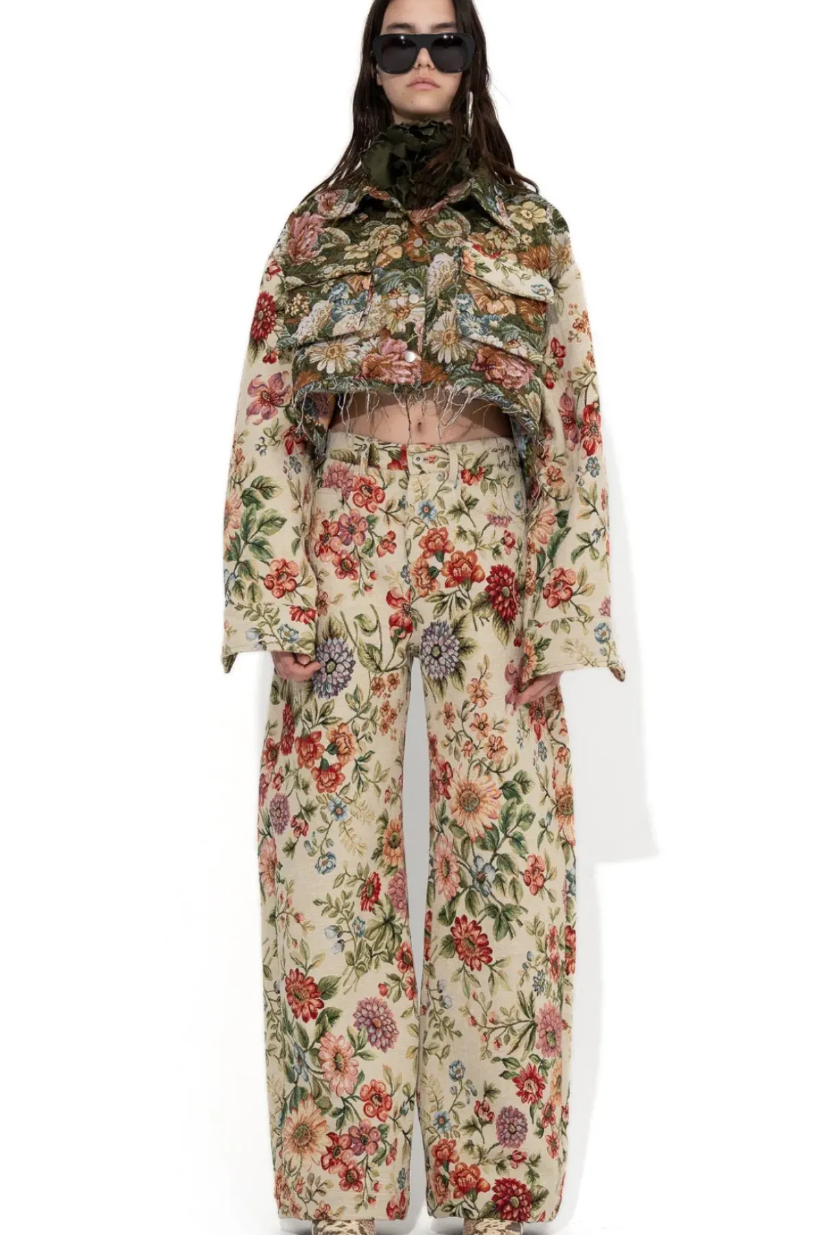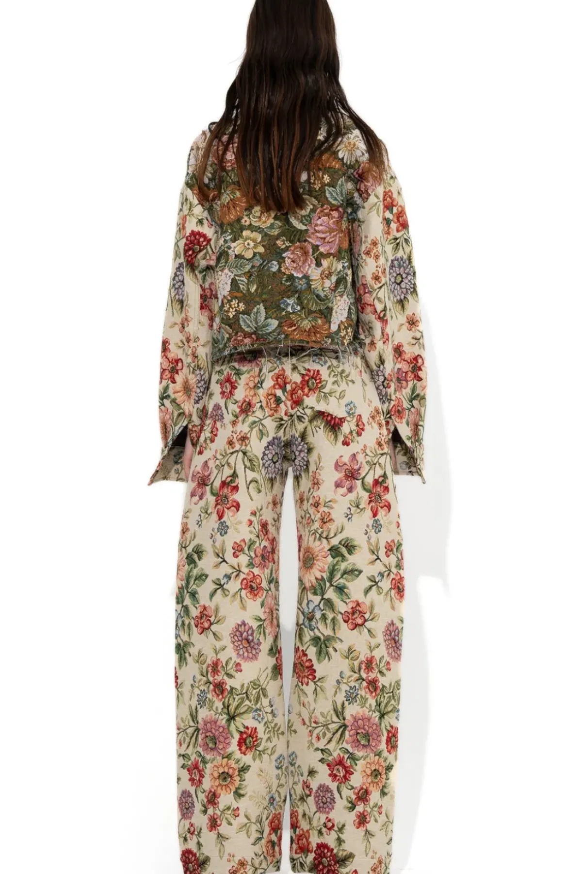 Boyfriend trousers crafted from a beige floral brocade. With a relaxed waist, five functional pockets and a wide-leg design.