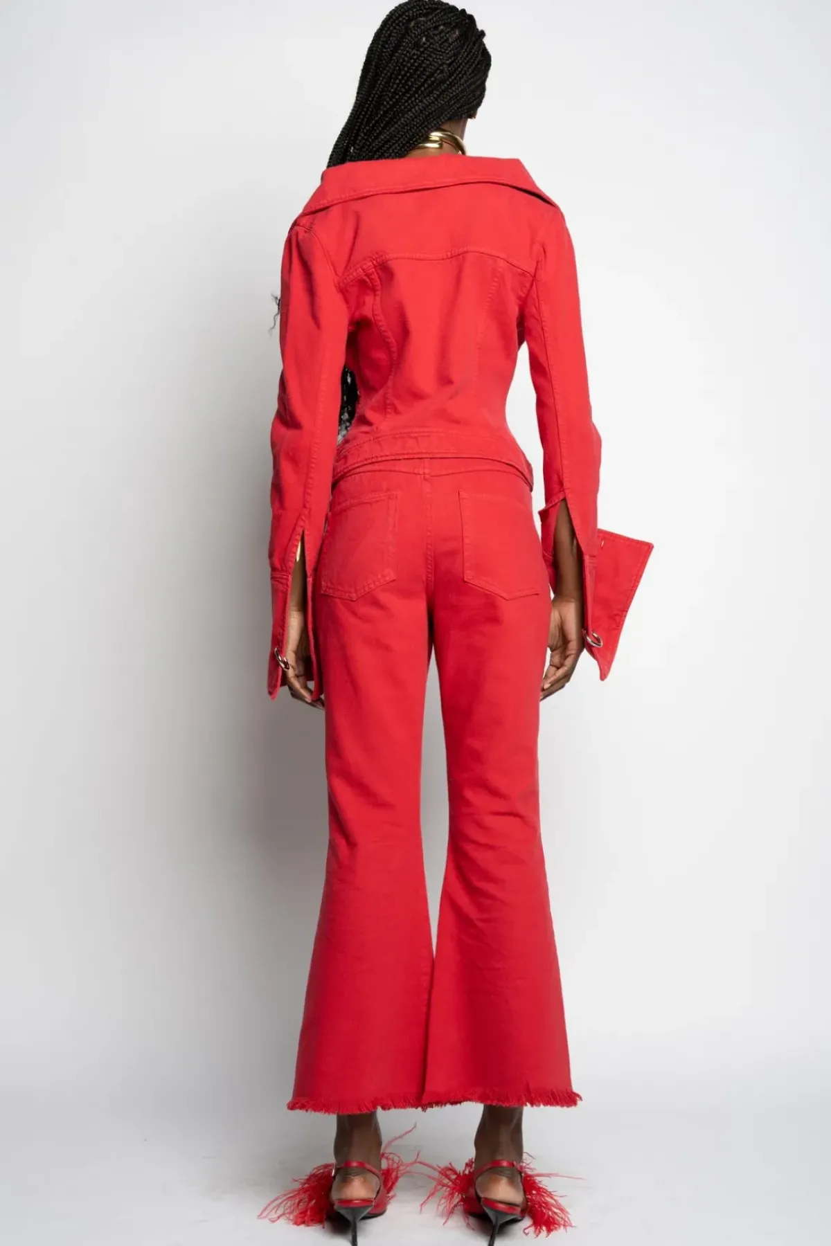 These red capri trousers are made from vibrant red drill, 5-pockets, flare-leg design and a high waist for a comfortable and flattering fit. The raw hem adds a trendy touch to this must-have piece.