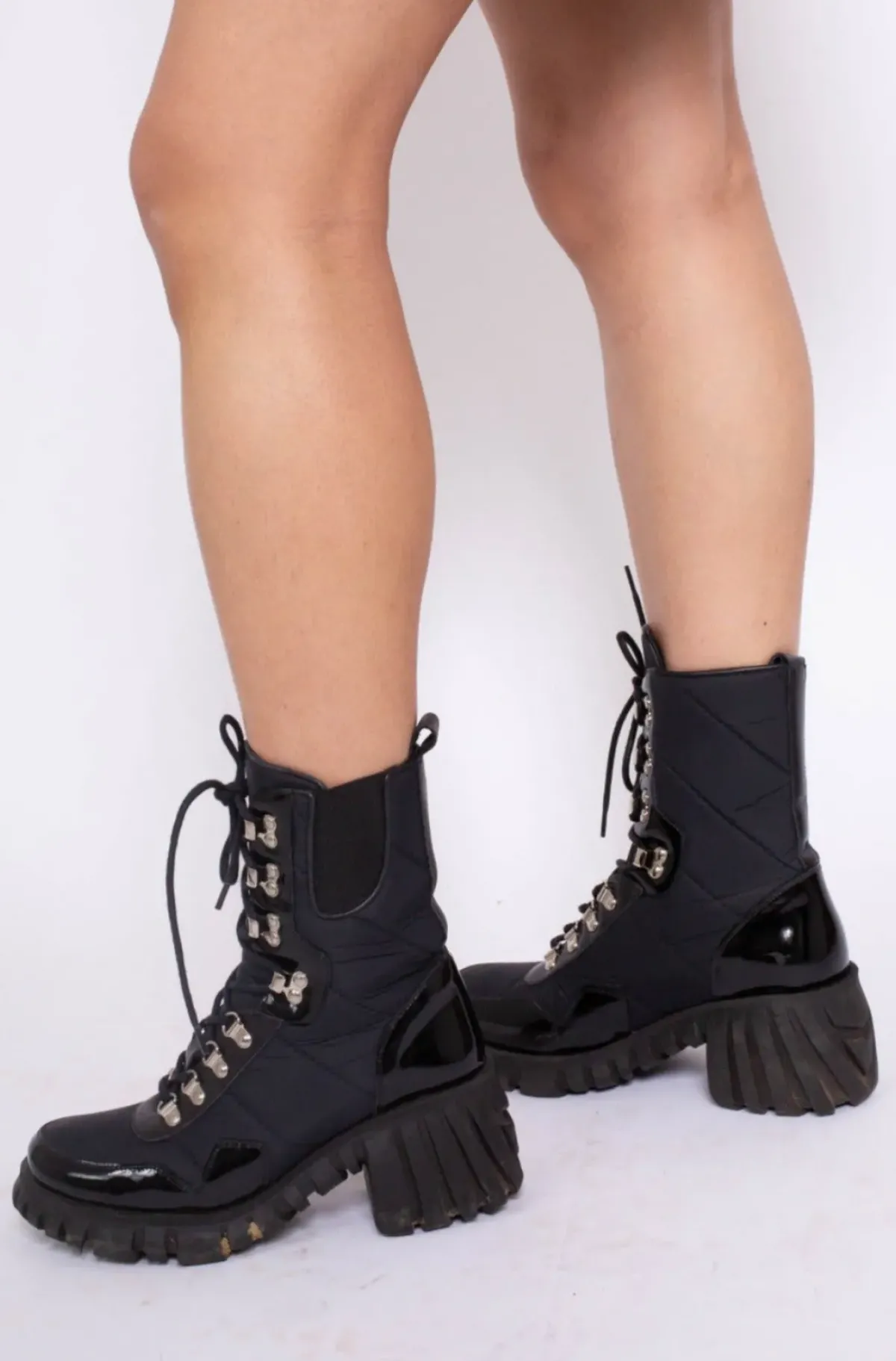 Elevate your style with our nylon M'A Chunky boots, featuring chunky black rubber soles and a secure lace-up fastening.