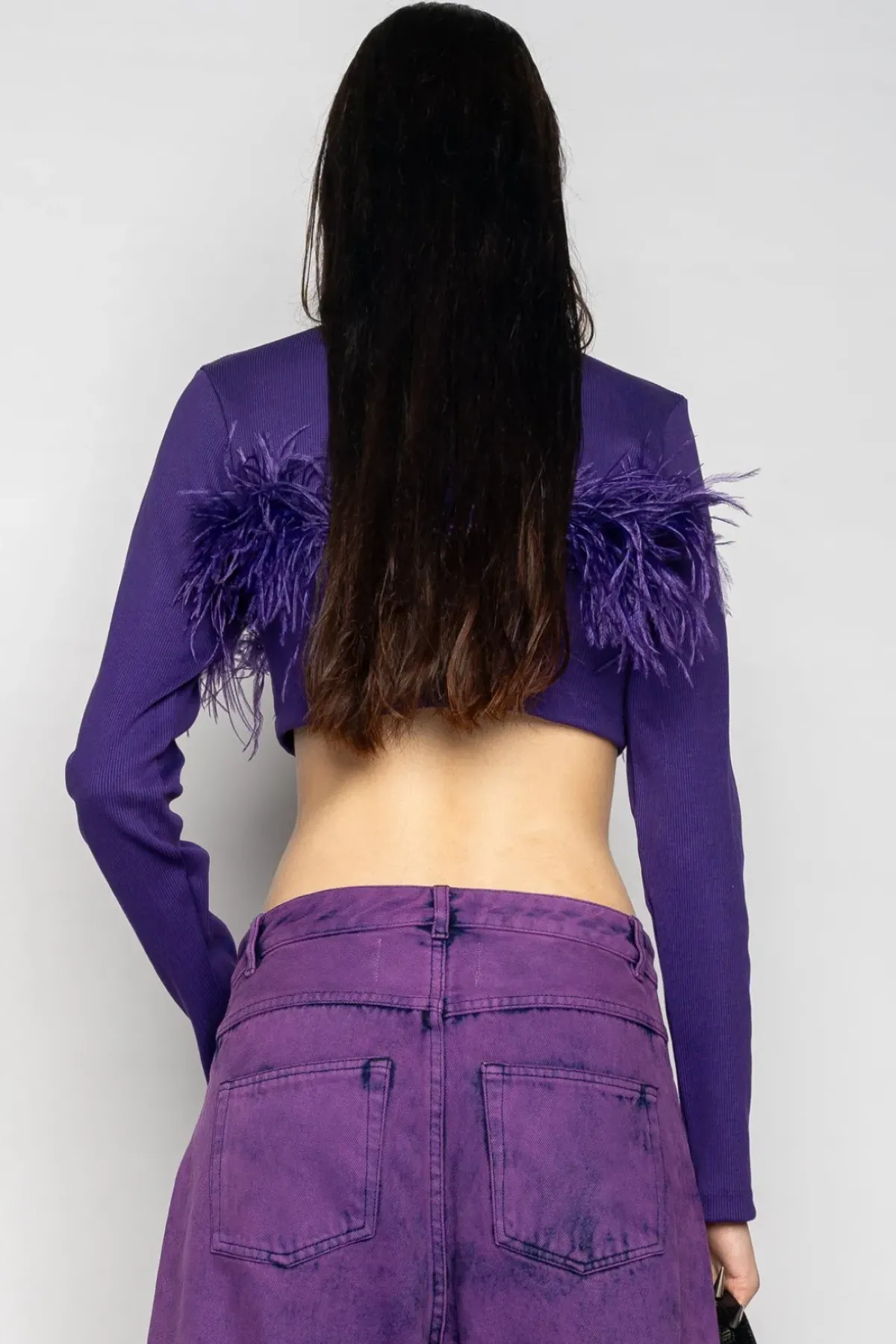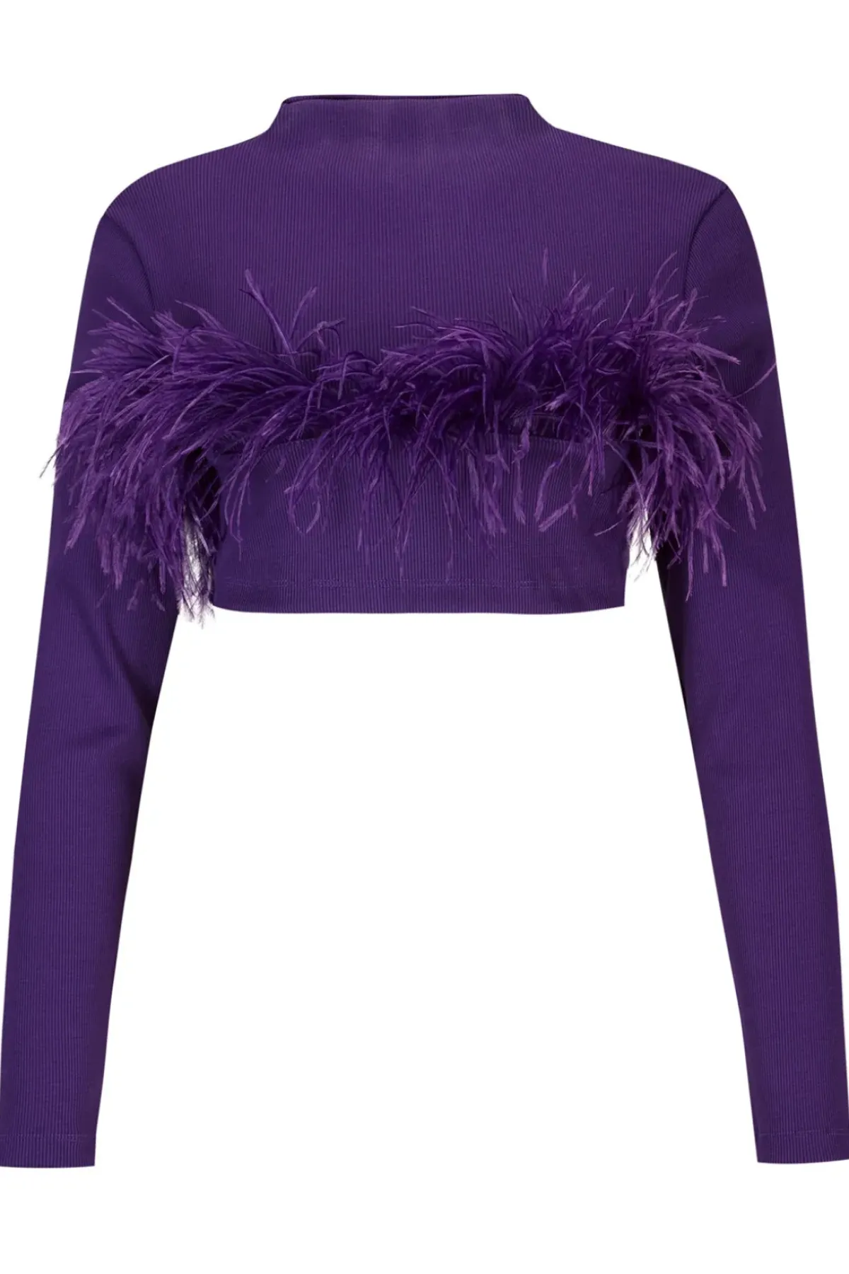 Slip into this purple cropped top crafted from rib jersey, featuring a high neckline, long sleeves and feathers adorning the hem! Perfect for creating a fresh and vibrant look.