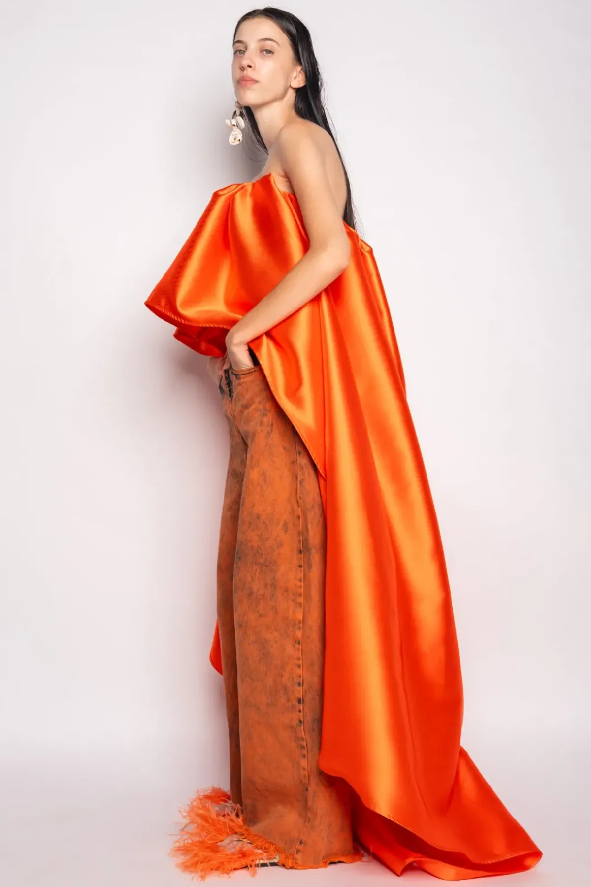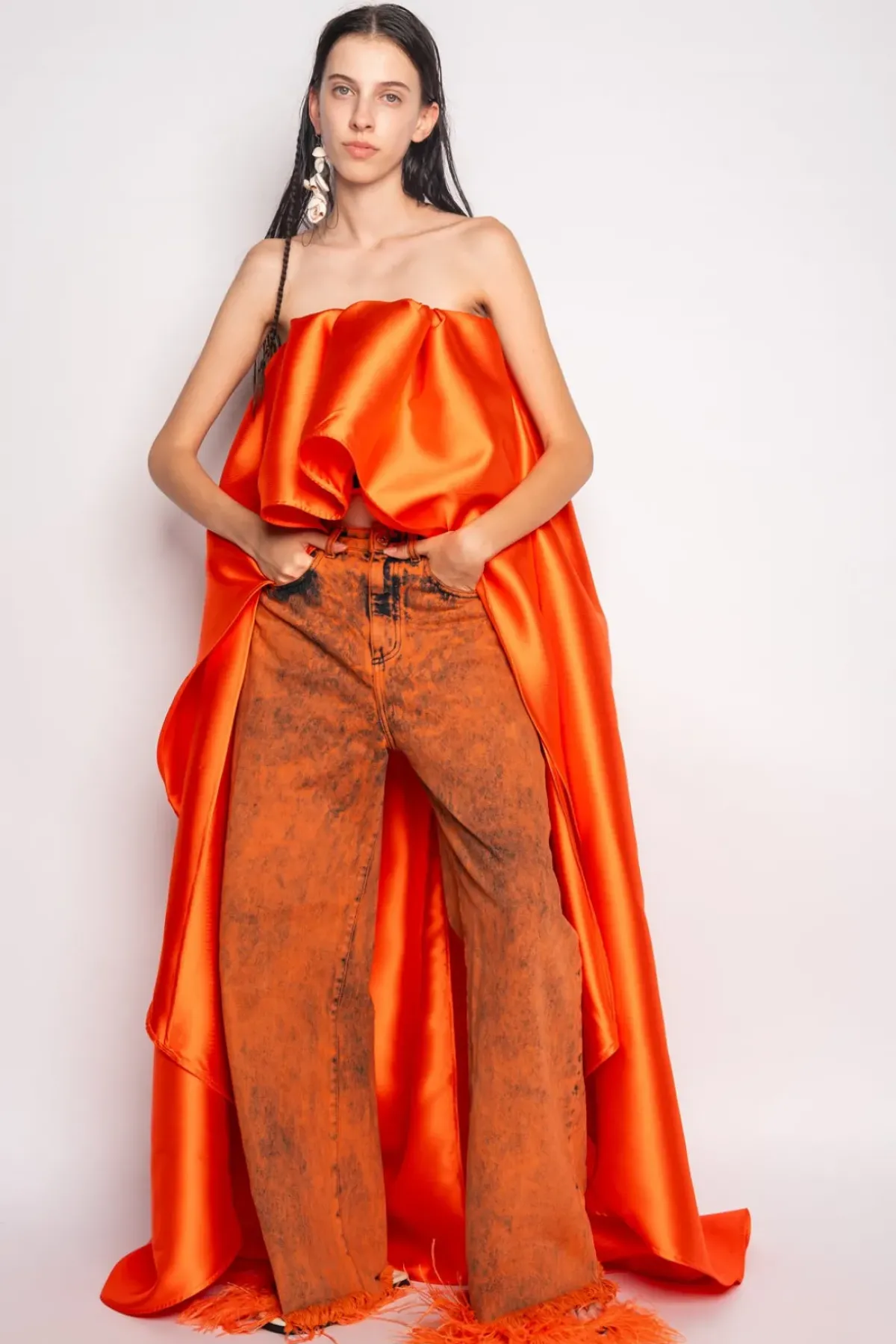 Upgrade your denim game with our Orange Denim Boyfriend Trousers. Featuring a vibrant orange overdyed denim, these classic M'A 5-pocket trousers offer a wide leg with a high-waist fit and an edgy raw hem.