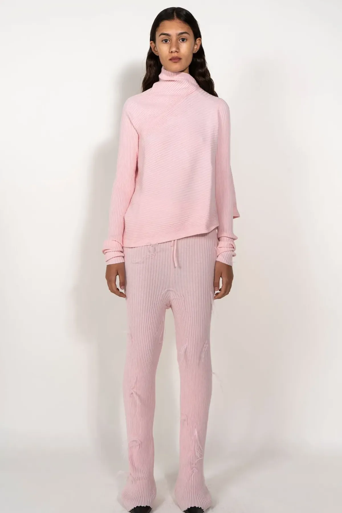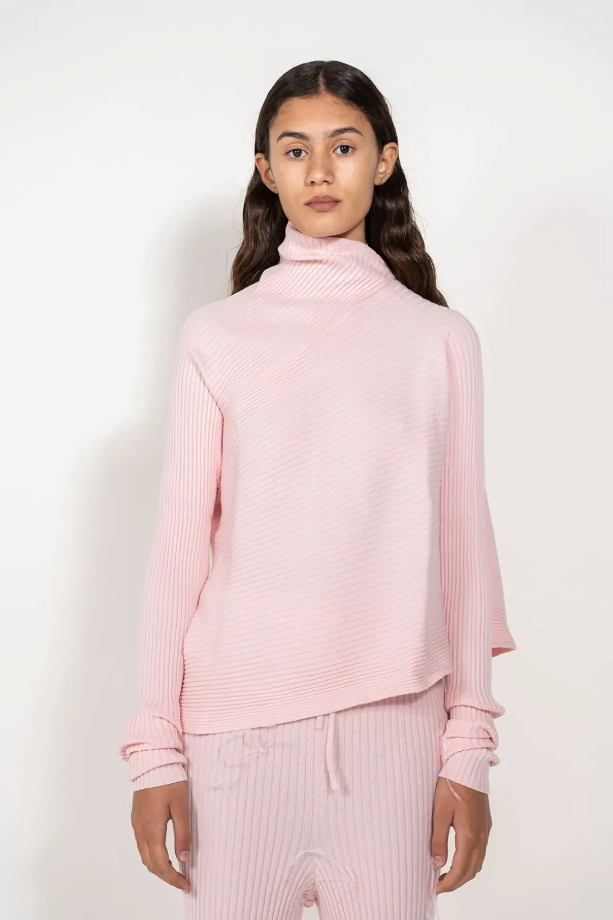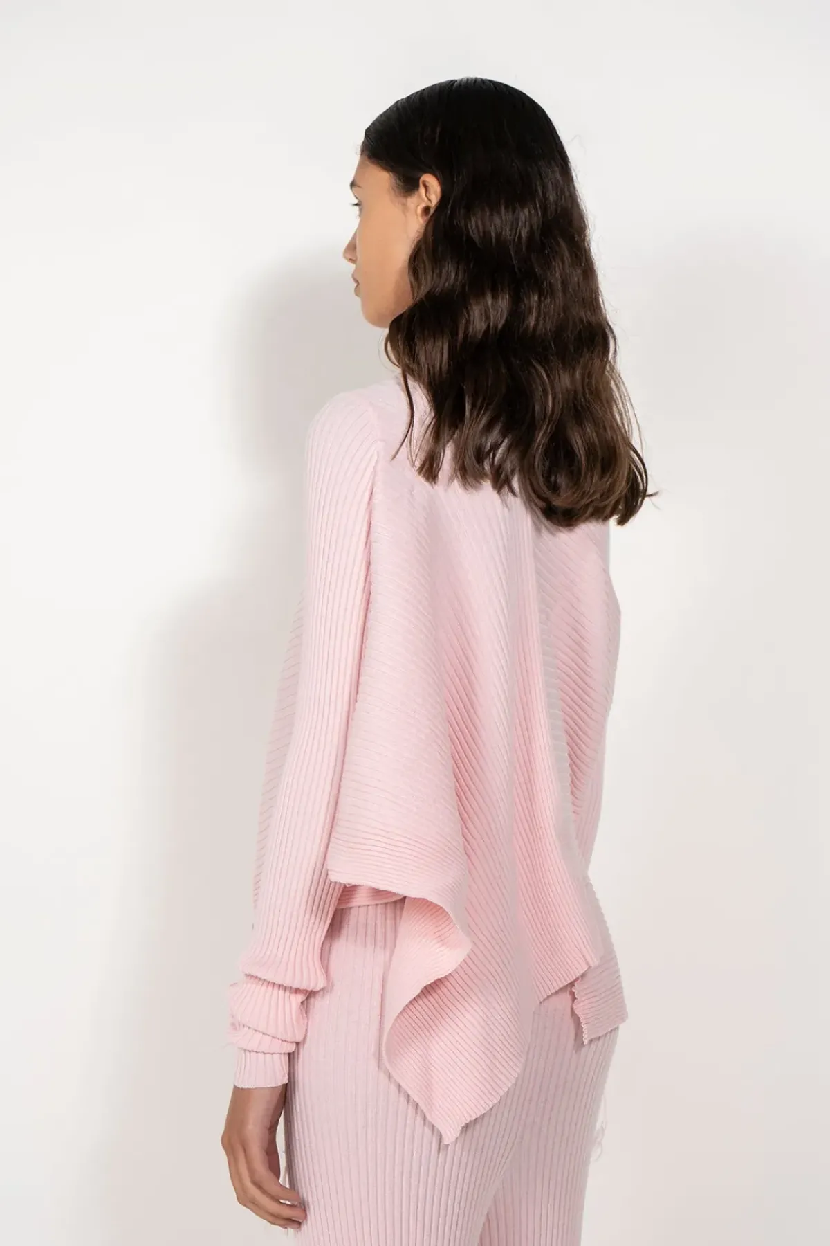 Meet our asymmetric light pink sweater, spun with quality merino knit. Featuring a slashed cowl neck, raw M'A hemlines, and longline sleeves, it's designed to flatter with its draped shape.