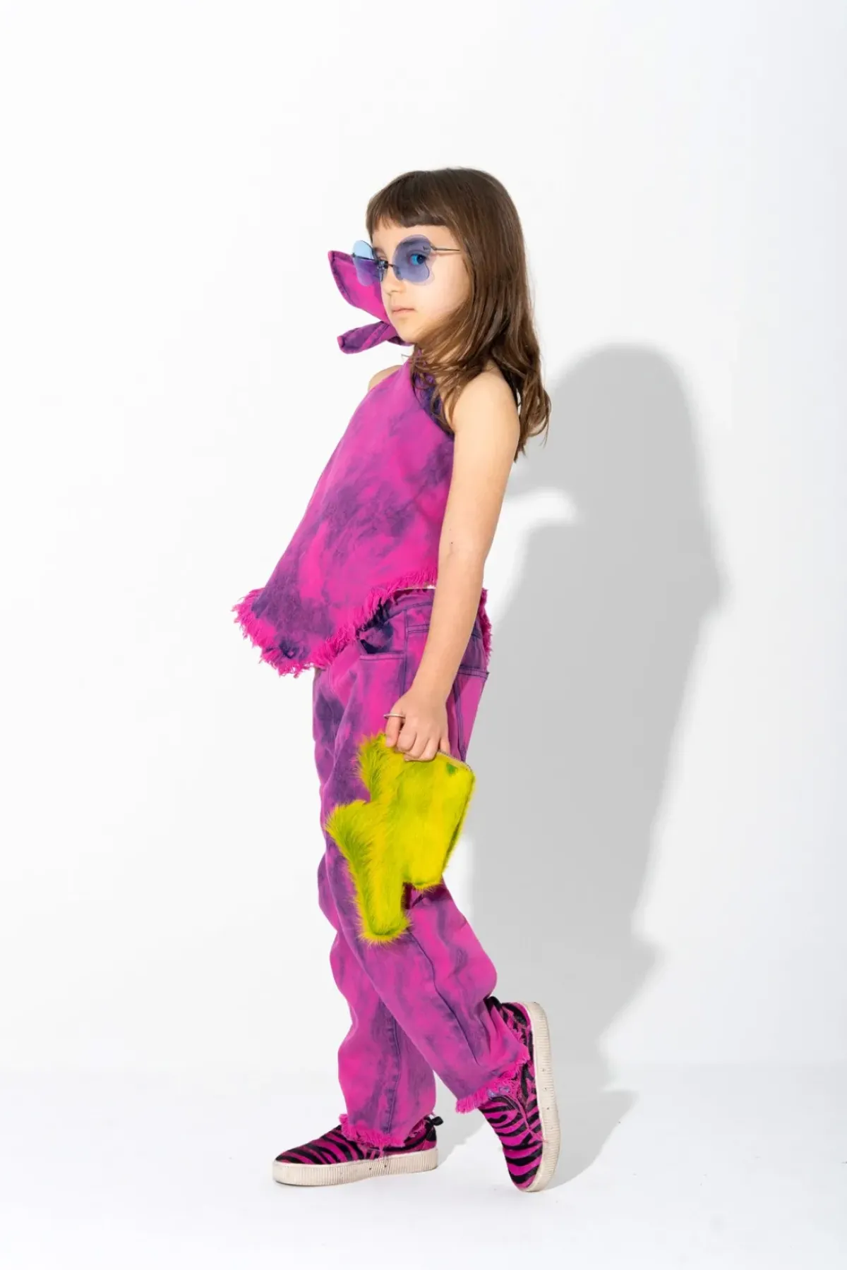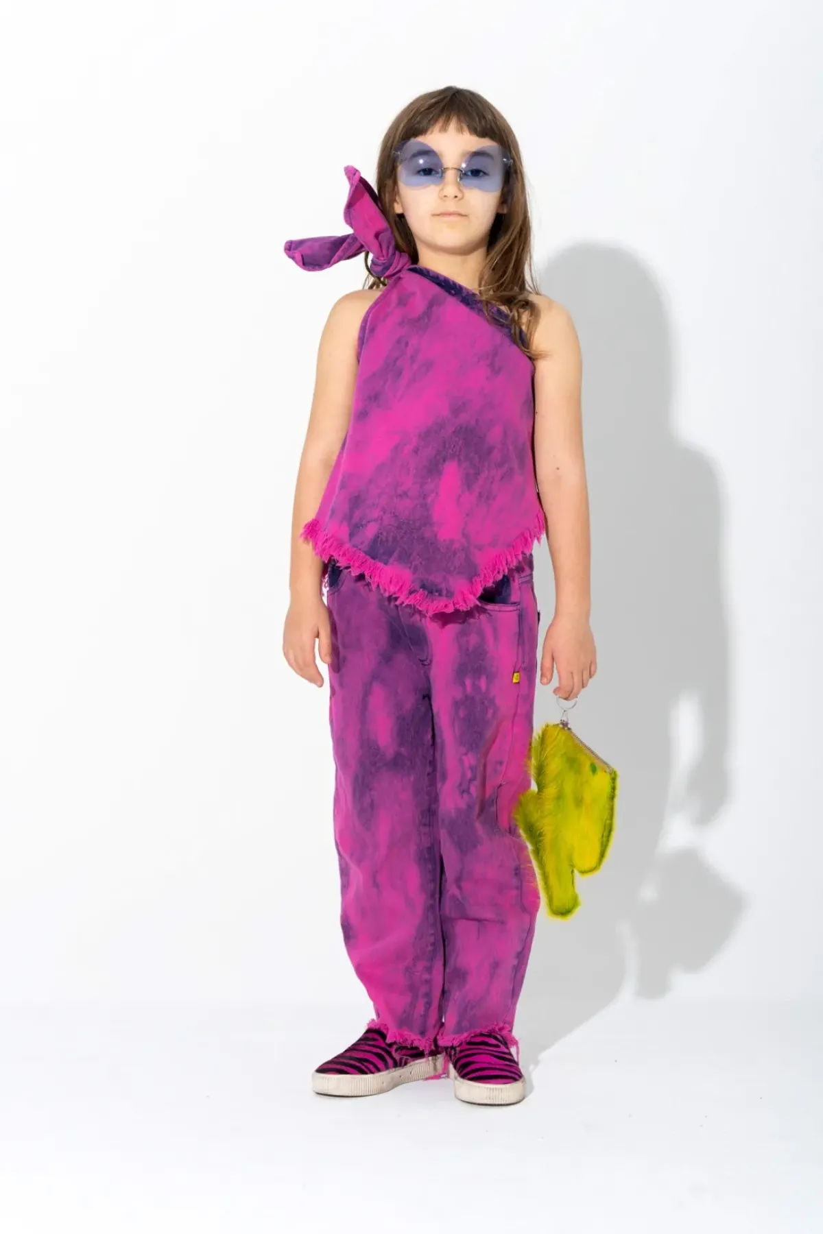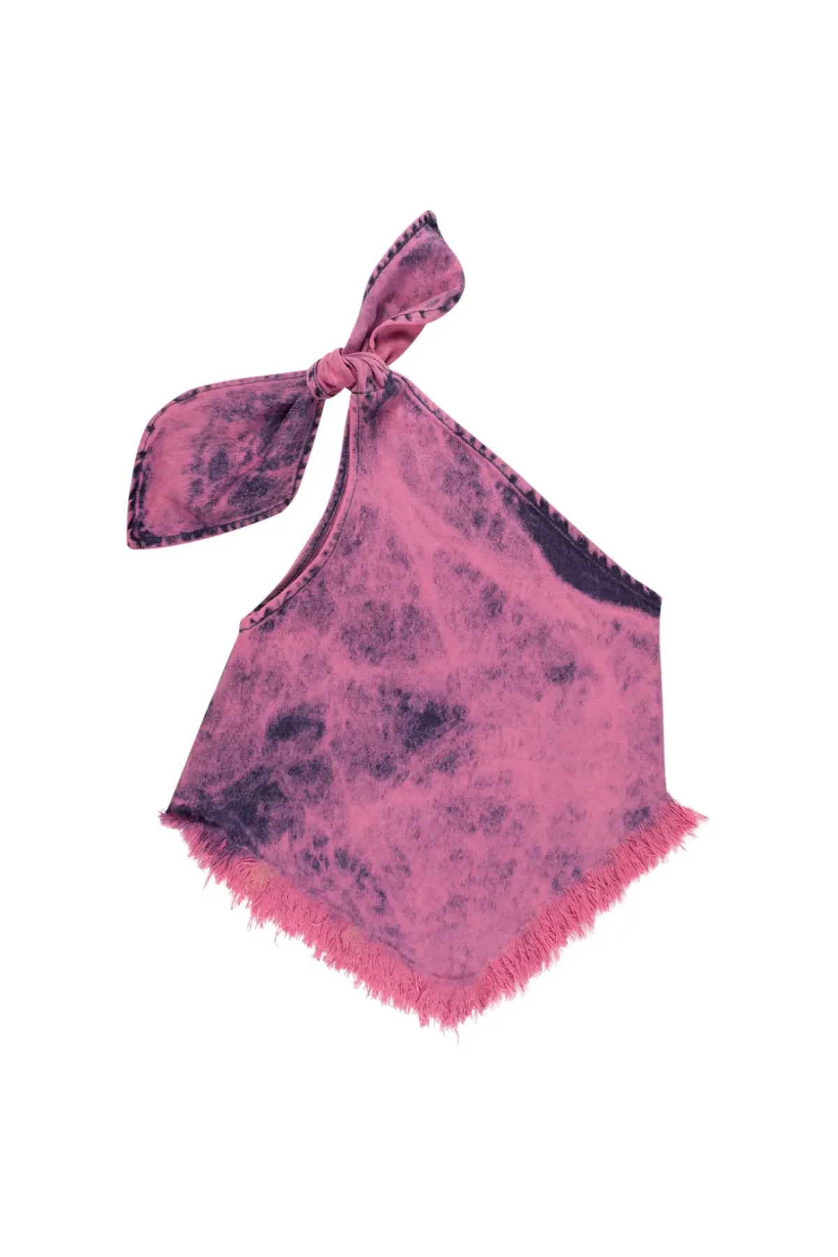 Rock a pink-on-pink one-shoulder look with this overdyed denim top and its cute knot detail and raw asymmetric hemline.
