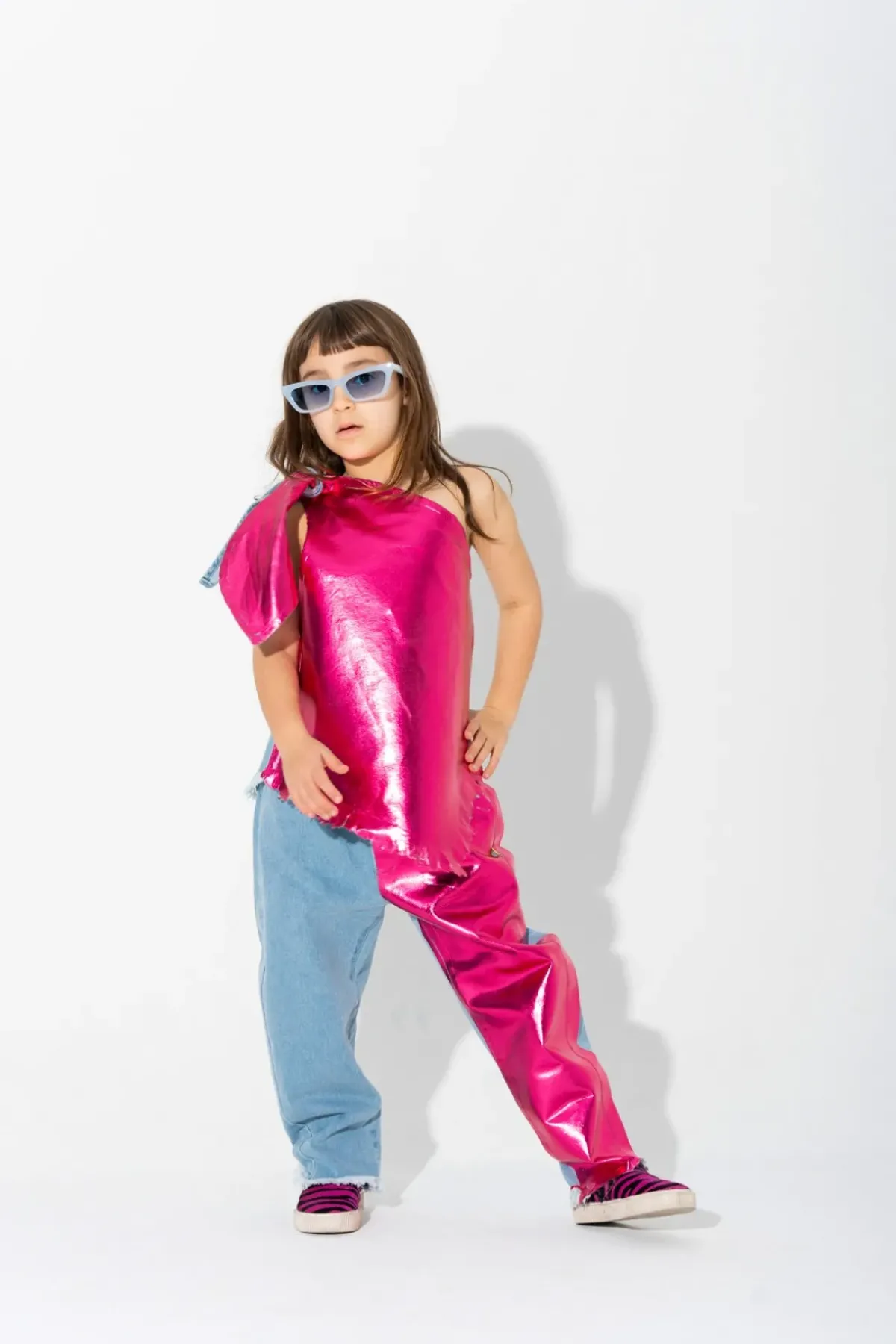 Slip into cool blue denim with some pink foil flair! These baggy trousers have got the elastic waistband and raw hem, that will get you covered in styleand comfort!
