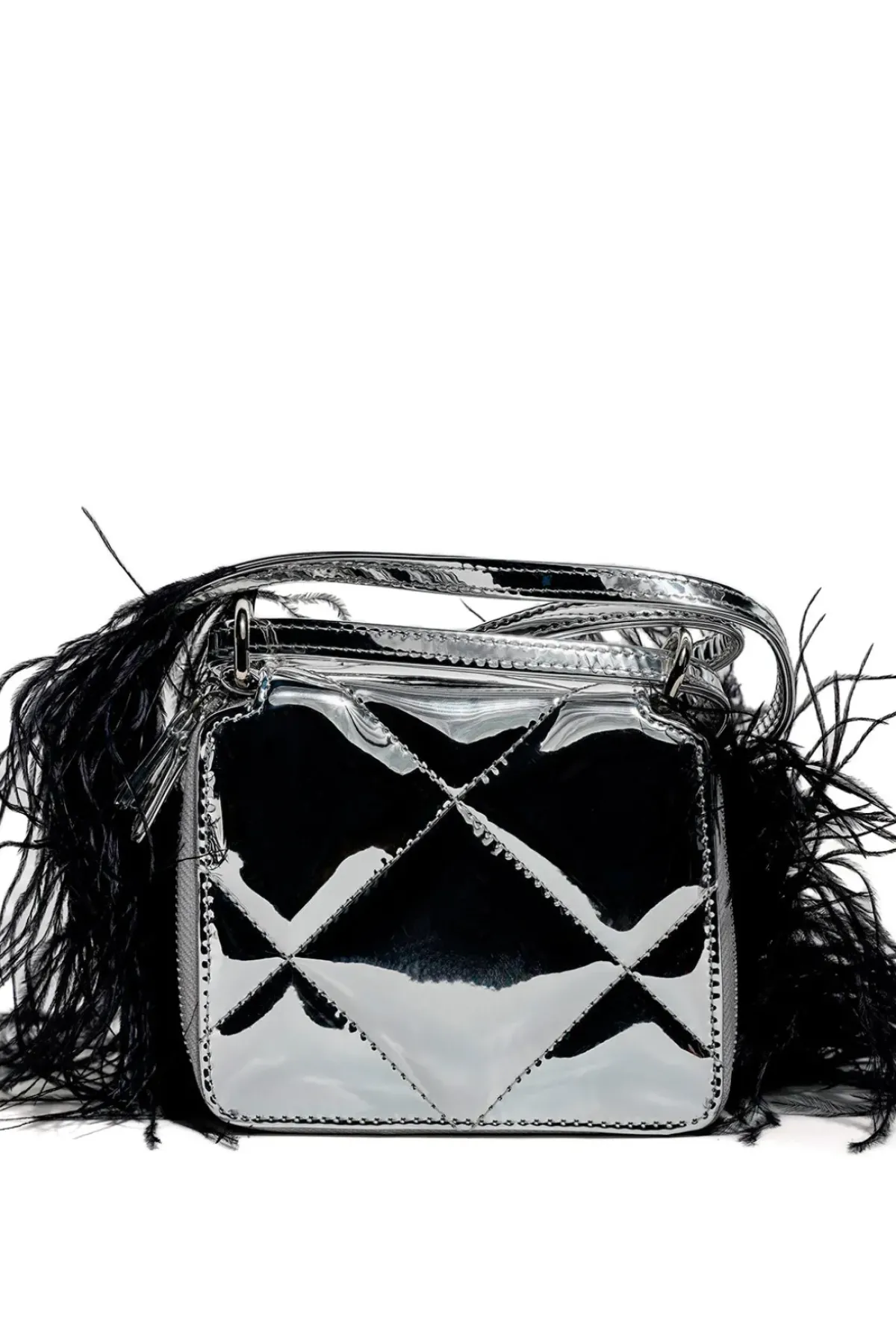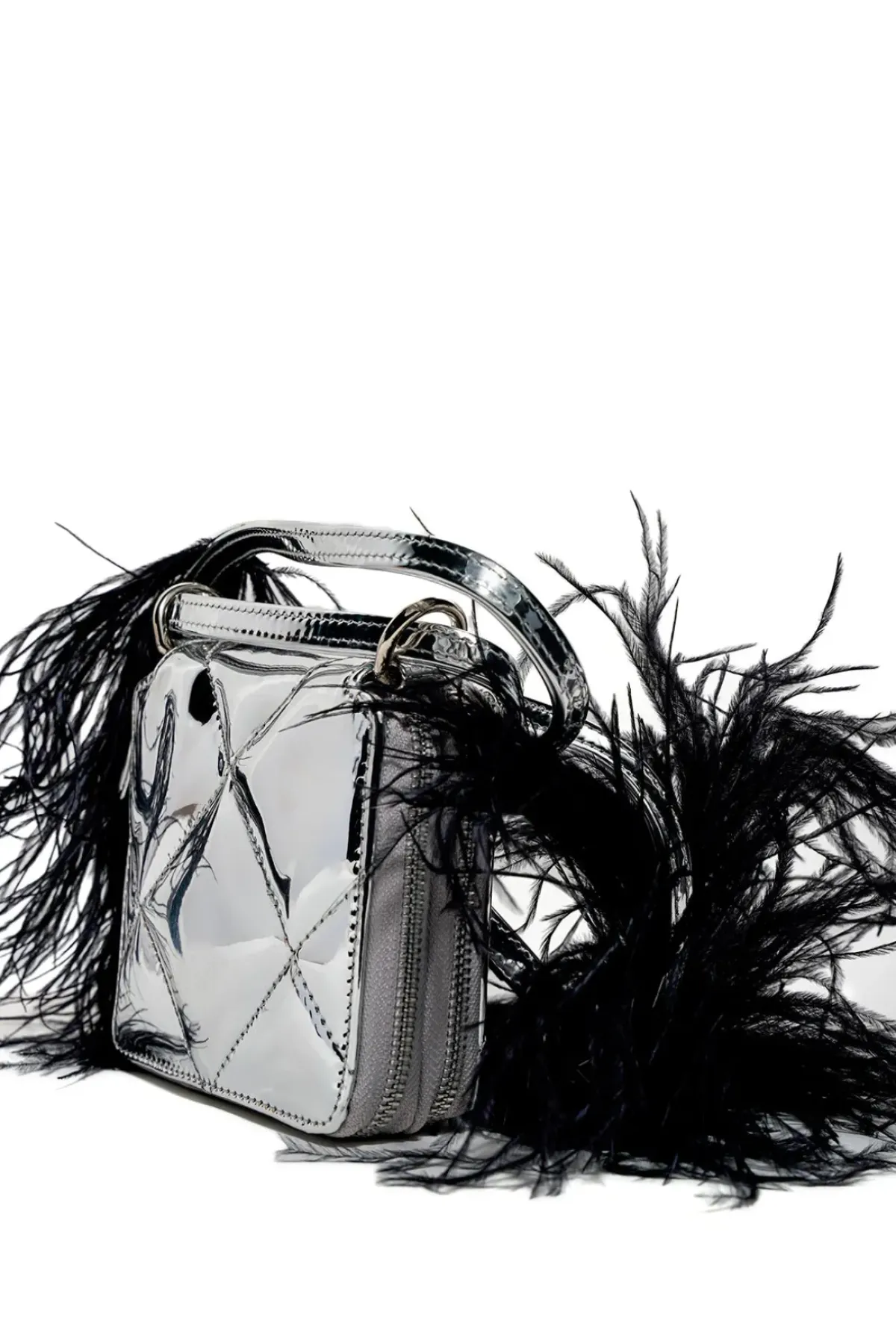 Gleam with sophistication with this silver leather wallet bag! A zip fastening, multiple interior card slots and a silver with black feather long strap complete the look.