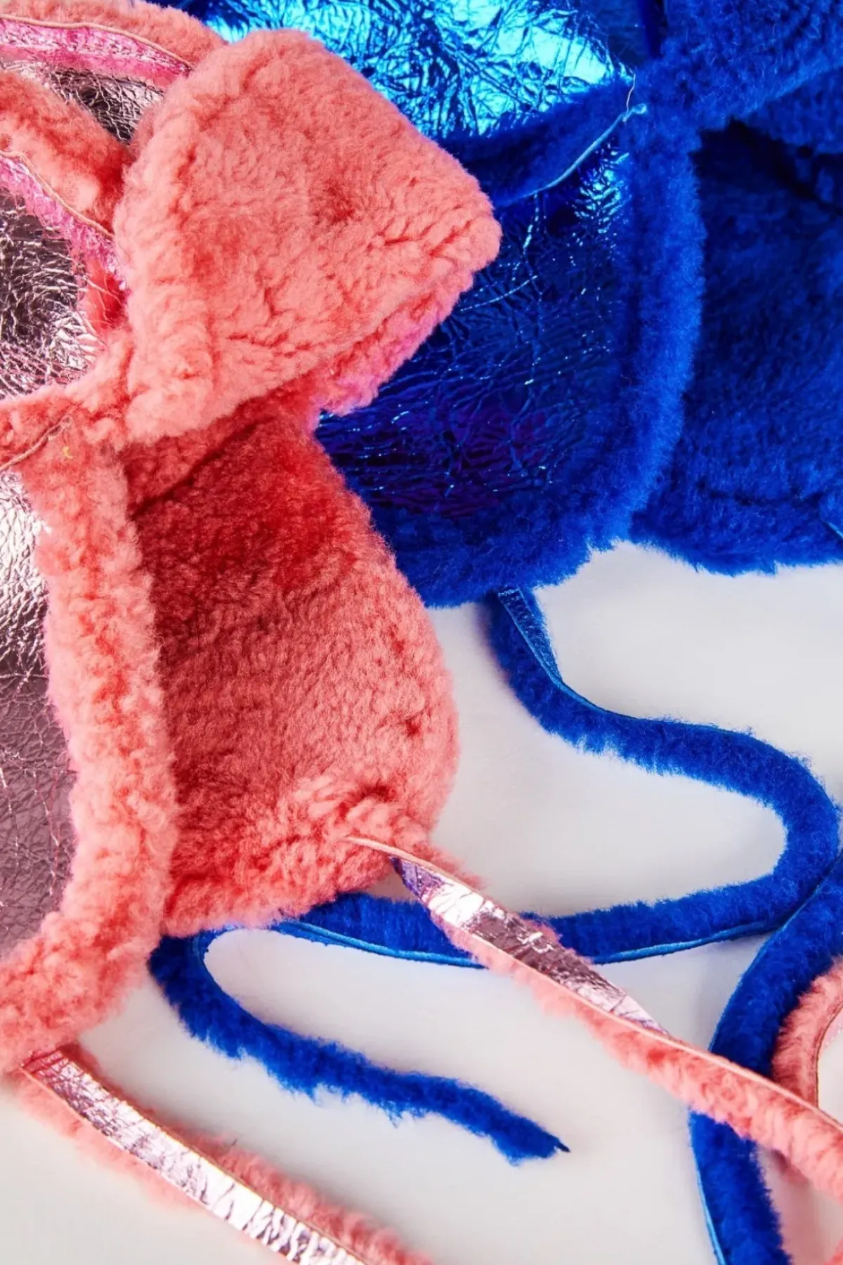 This dazzling blue shiny leather ear cover hat, outfitted with a blue wool finish, is perfect for your little one!