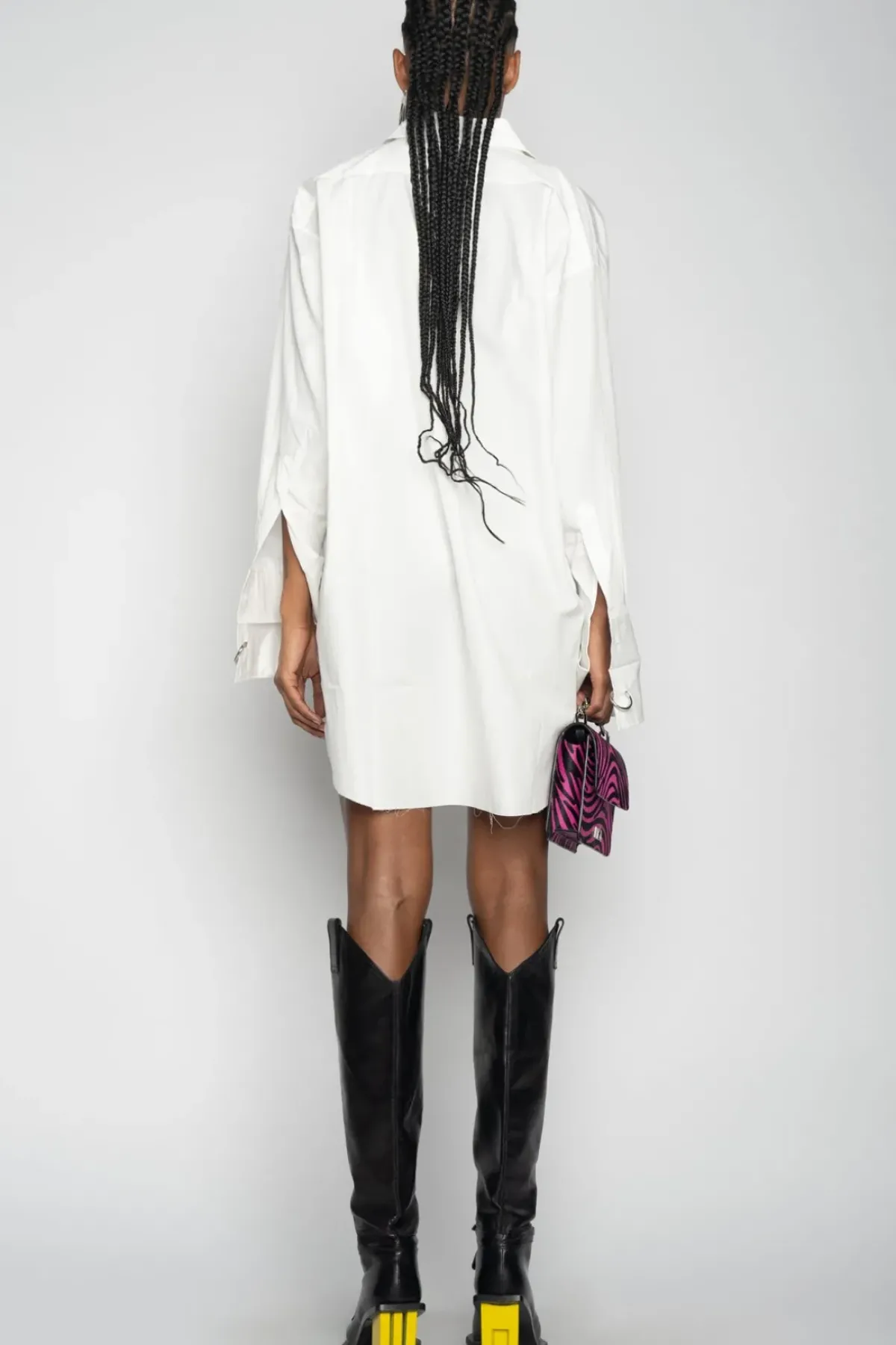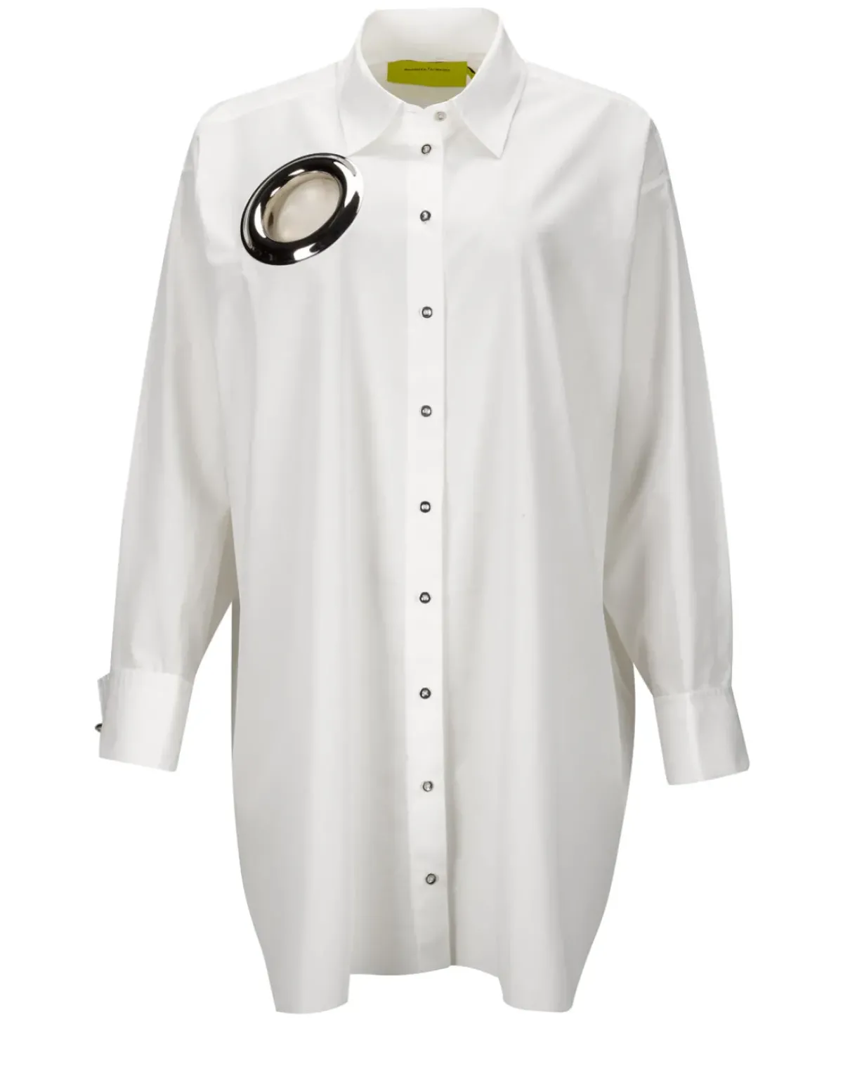 Cosy up in this organic cotton white XXL shirt featuring a striking eyelet detail on the right side. The oversized fit, long sleeves and raw hem complete the look.