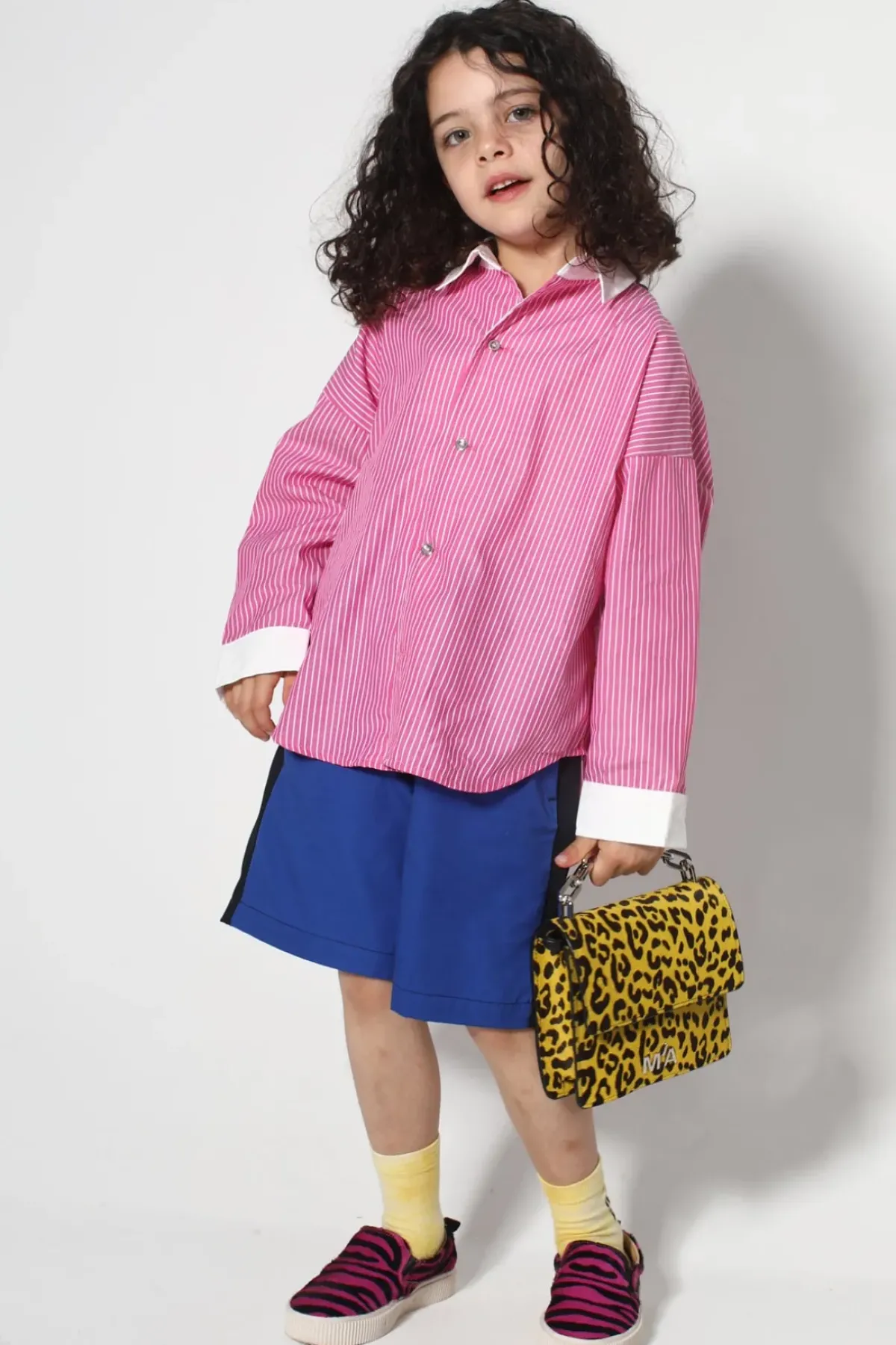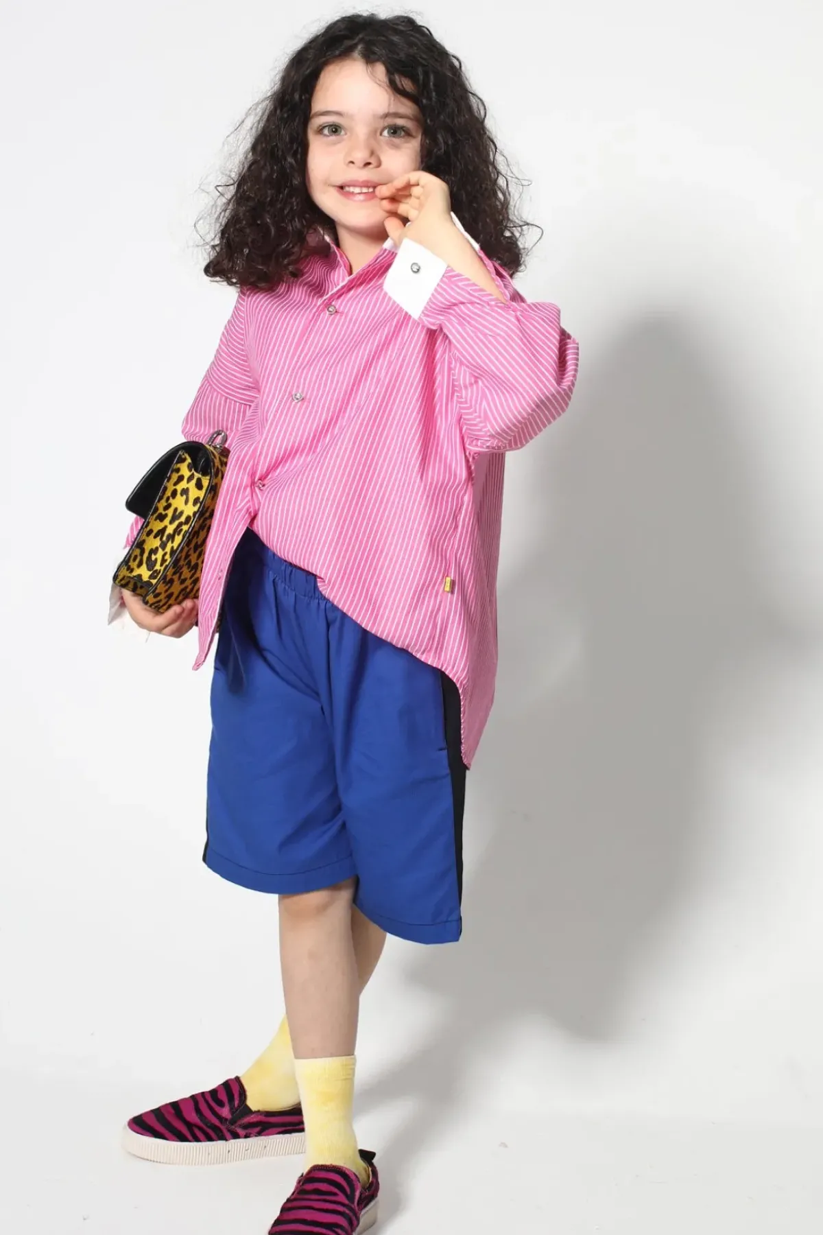 This comfy kid-sized shirt has pink and white stripes, long sleeves, a white point collar and fold-up white cuffs. No need to be a grown-up when you're styling in this top!