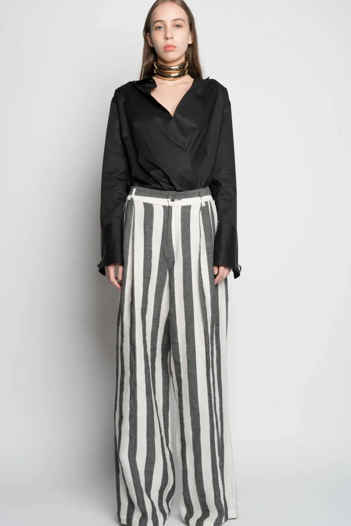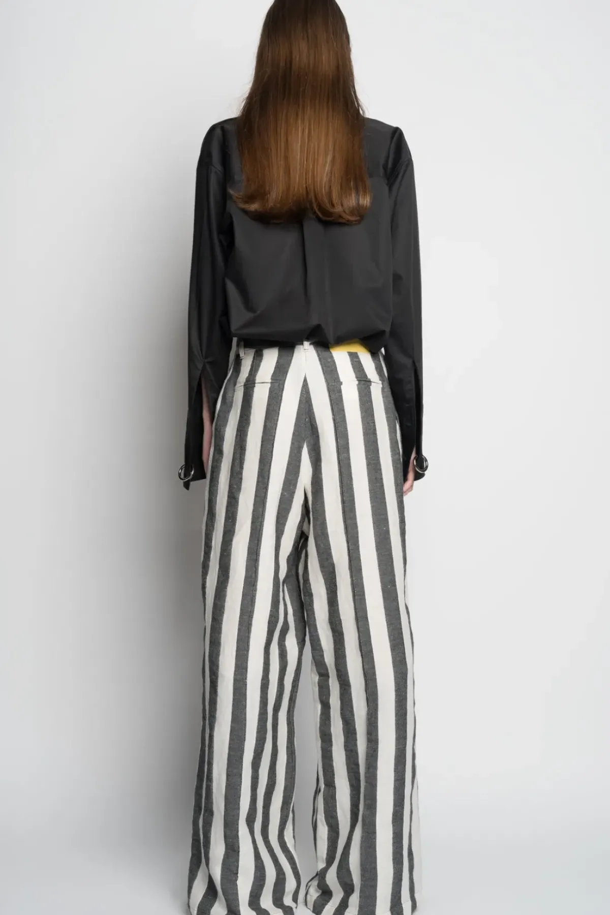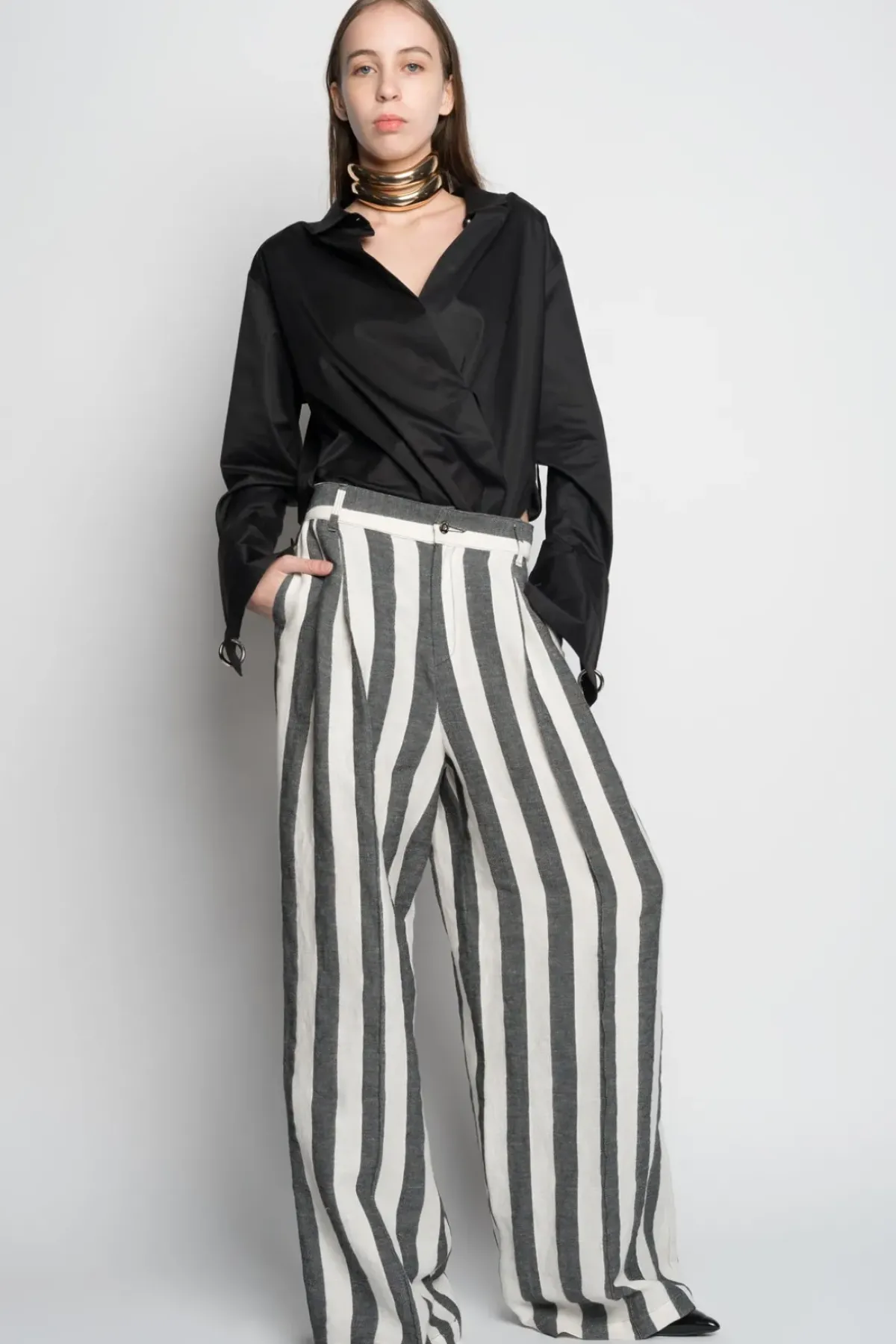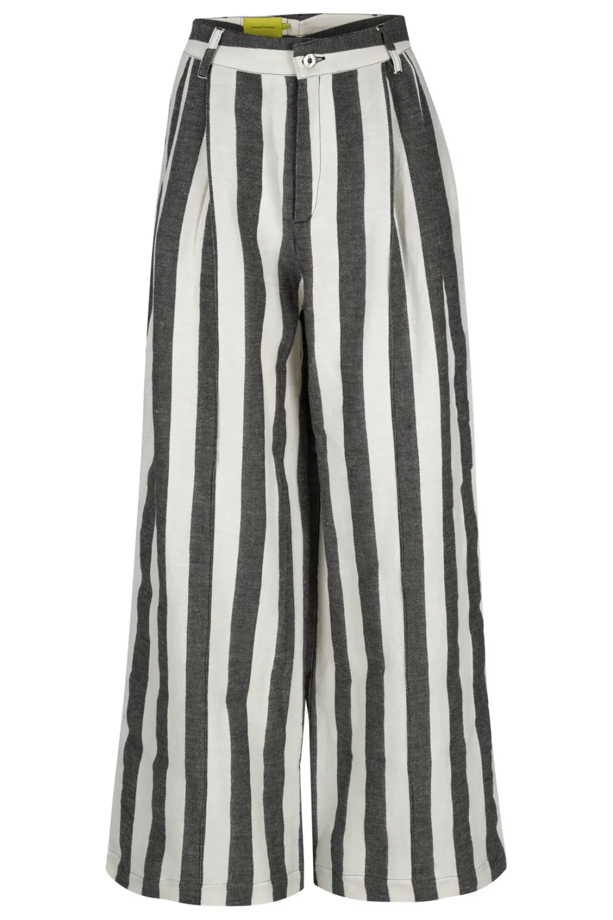Experience the power of these high-waisted, black and white striped linen wide-leg trousers with front slit pockets as you make a bold fashion statement!