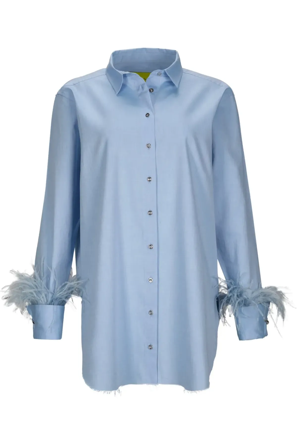 Make a statement in this blue feather cuff shirt! Crafted with cotton in a classic blue shirting, this shirt is elevated with vibrant detachable feather cuffs.