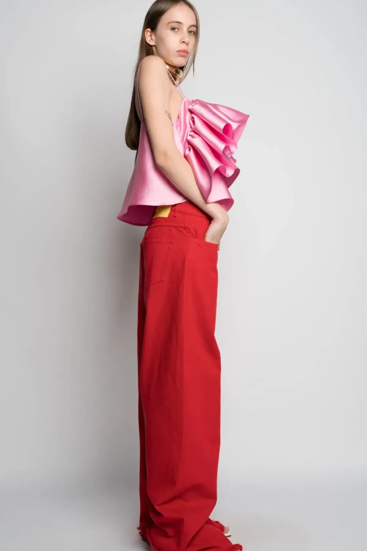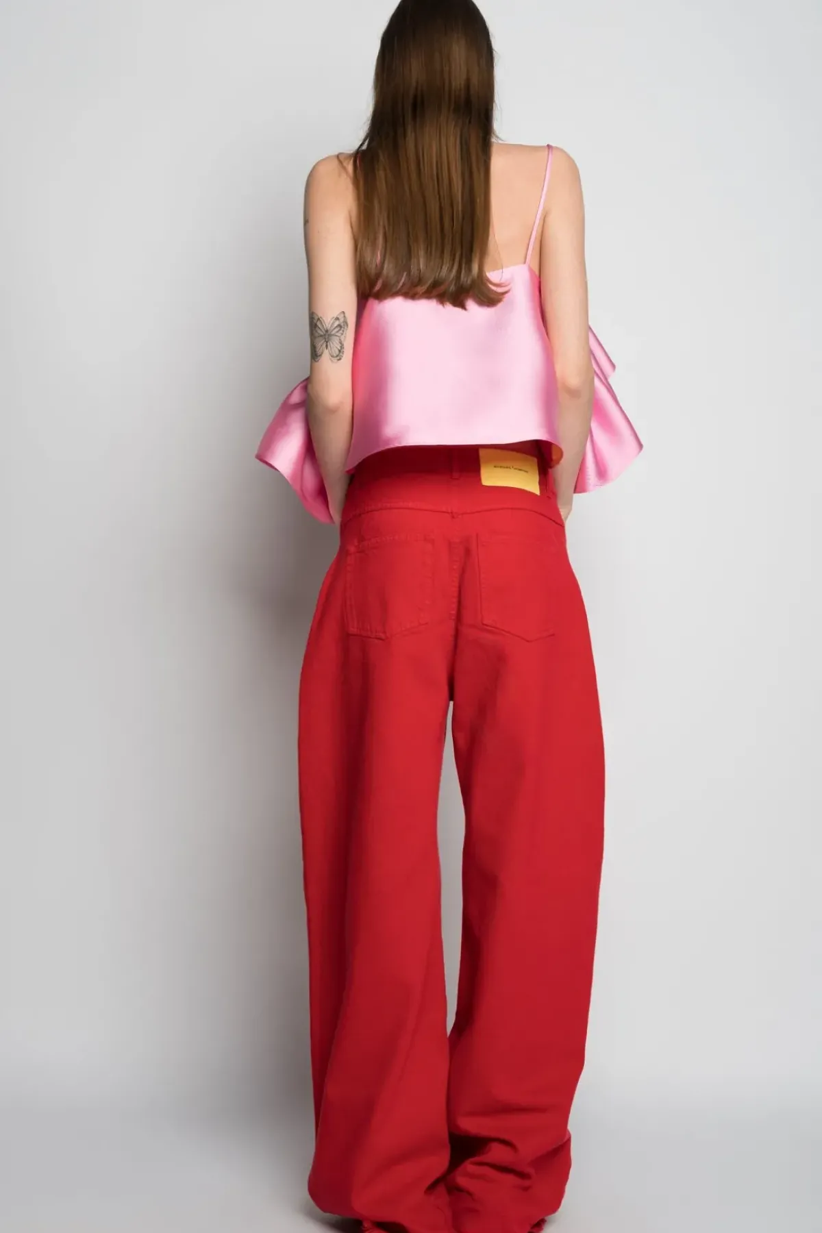 These red boyfriend trousers are made from vibrant red drill, 5-pockets, wide-leg design and a high waist for a comfortable and flattering fit. The raw hem adds a trendy touch to this must-have piece.
