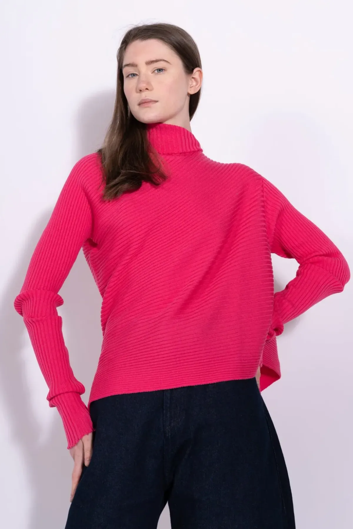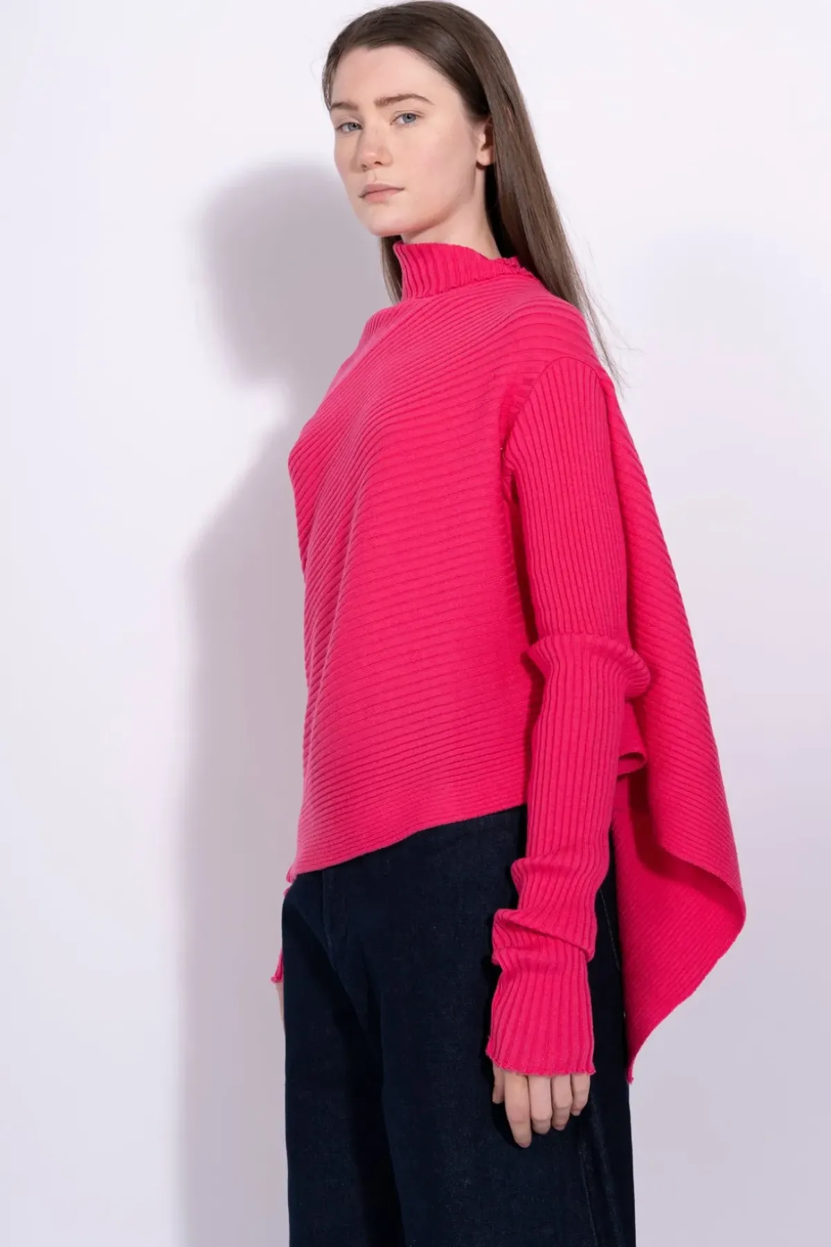 A splash of bright pink – this merino knit sweater fits a twisted texture, slashed cowl neck and raw hemlines that create an asymmetric silhouette with longline sleeves to boot!