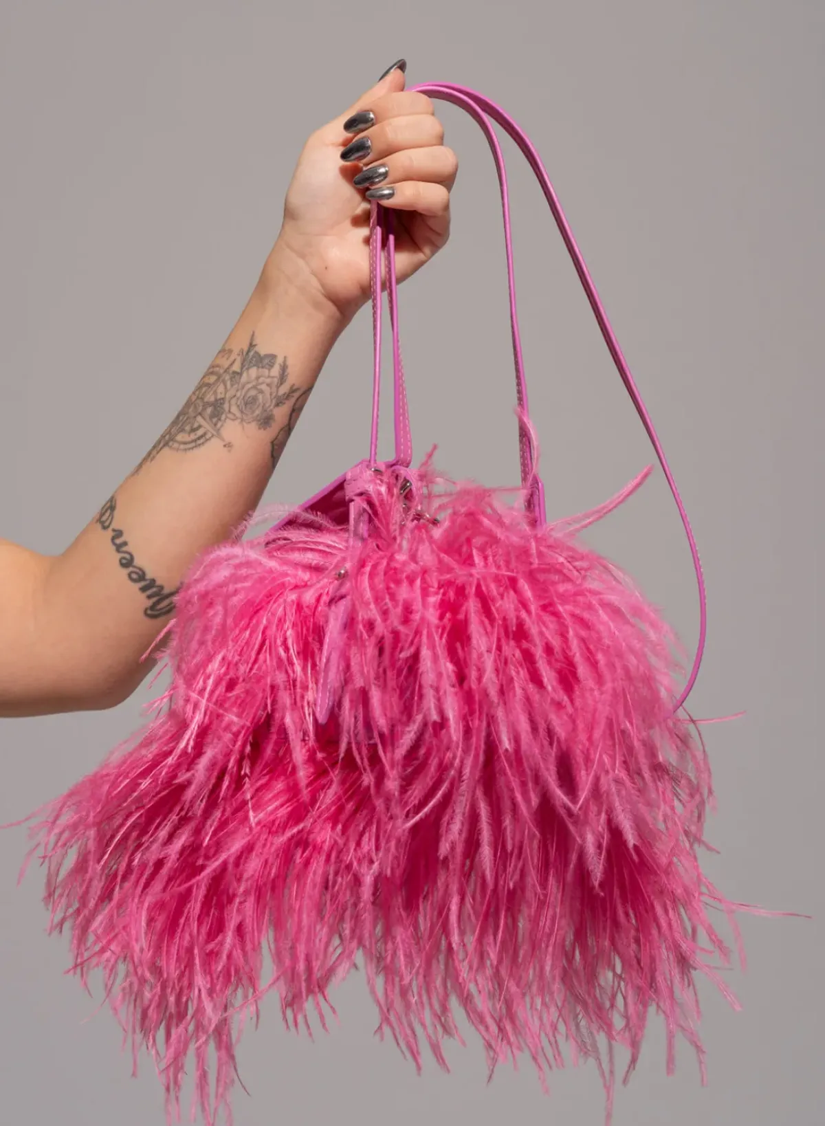 A pink leather bag with weightless feathers. Zip it up and store items in the handy inner pocket. It can be worn as a crossbody, handbag or clutch around the wrist.