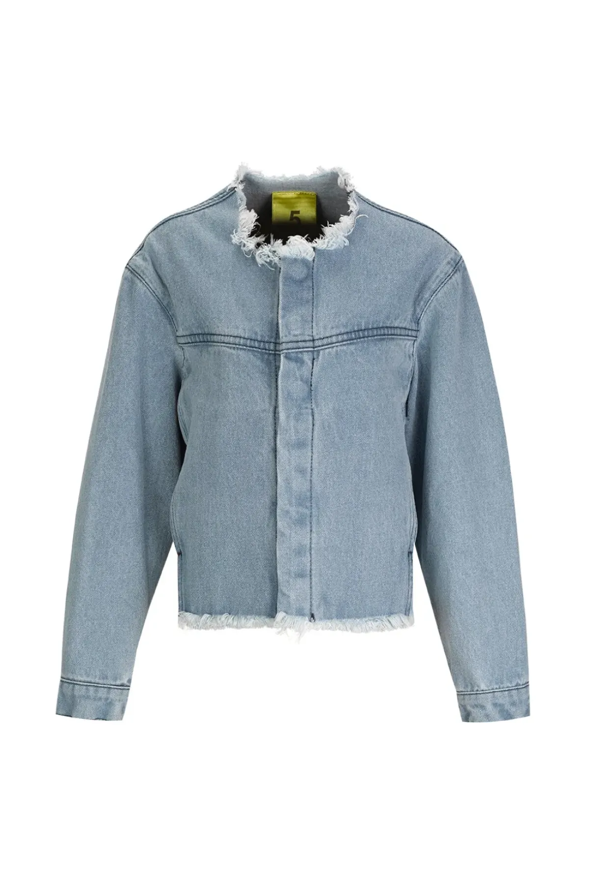 Refresh your wardrobe with this loose collarless denim jacket, complete with raw frayed hem, curved sleeves, and tailored cuffs.