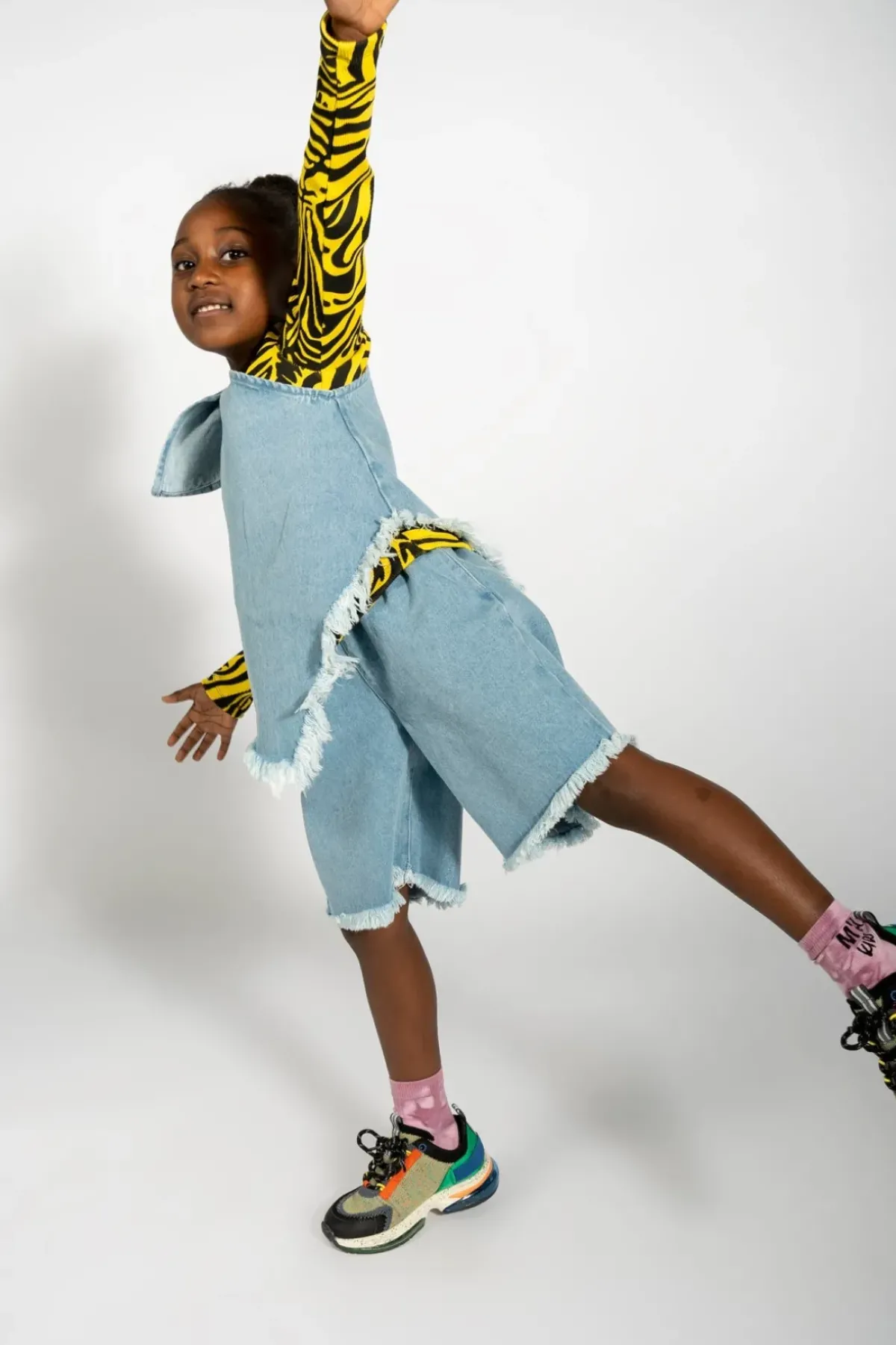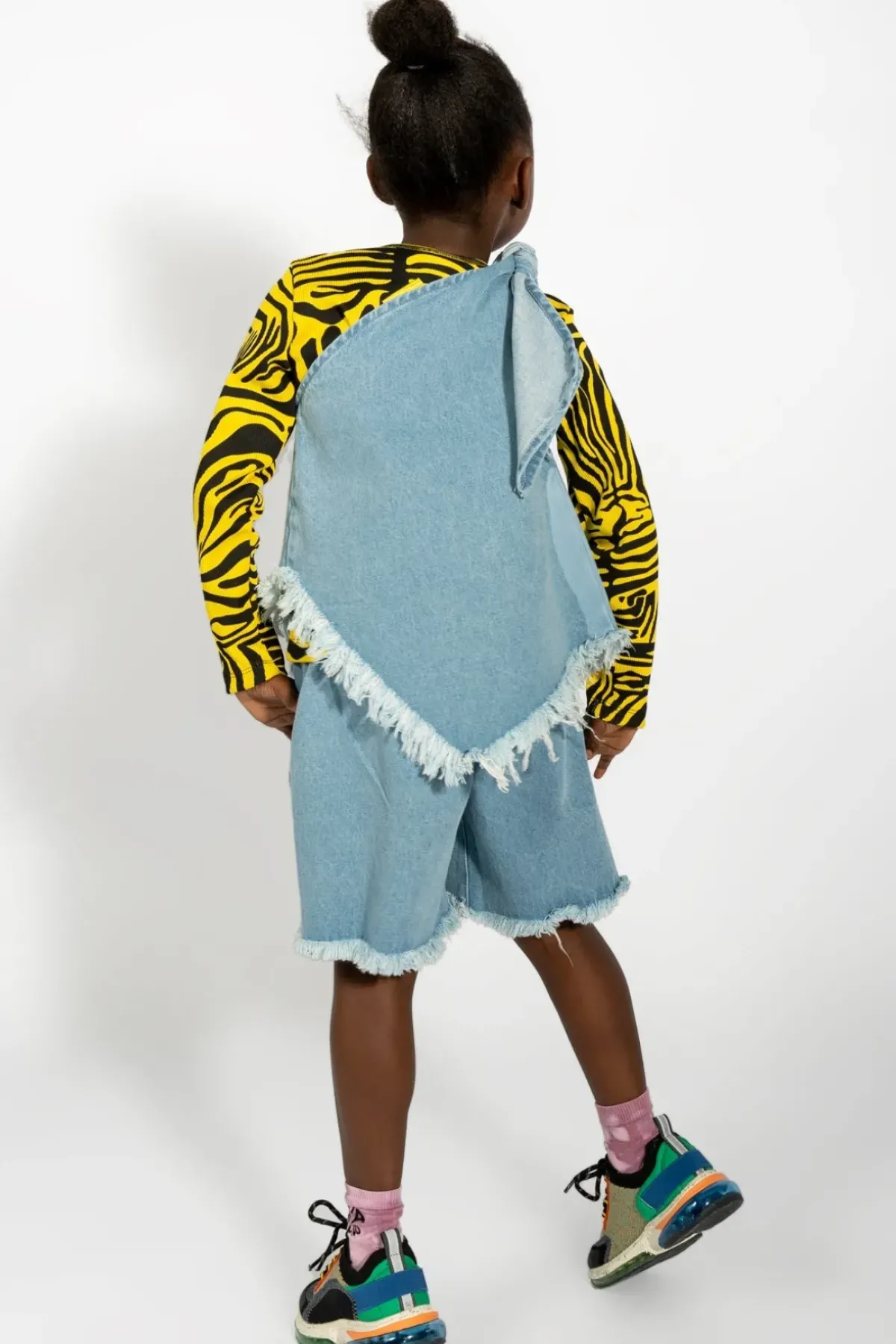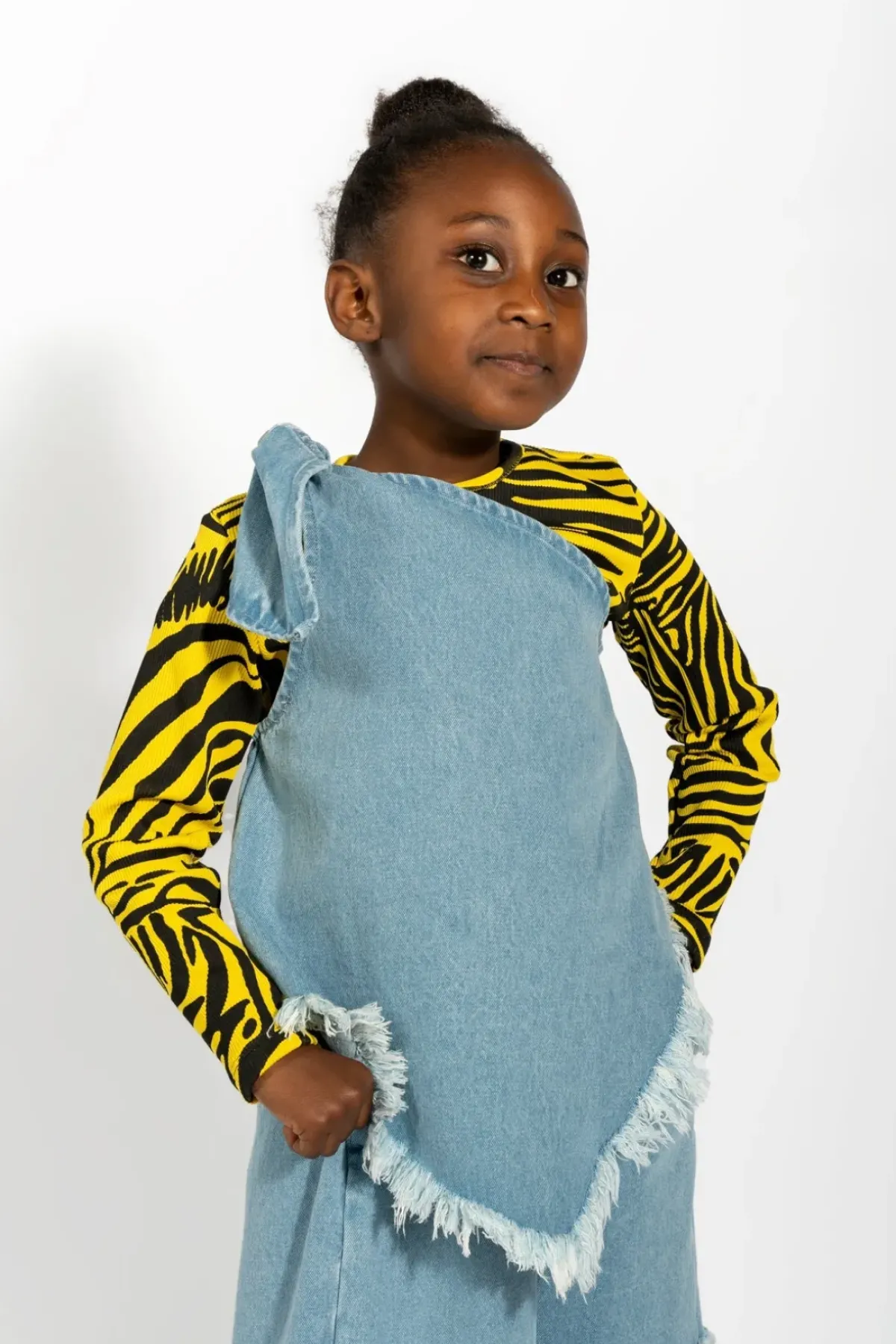 This denim one shoulder top brings asymmetry and frayed edges to your wardrobe in a stylish way.
